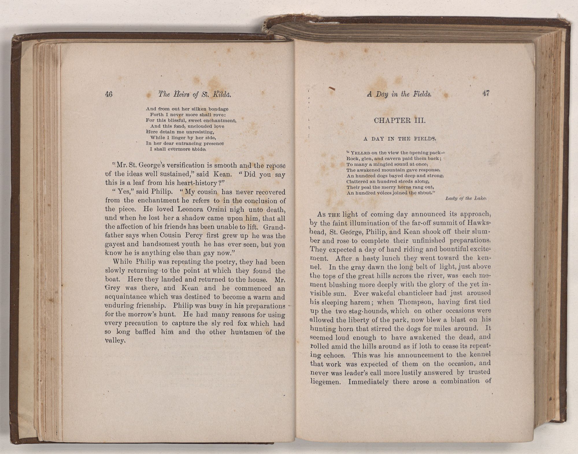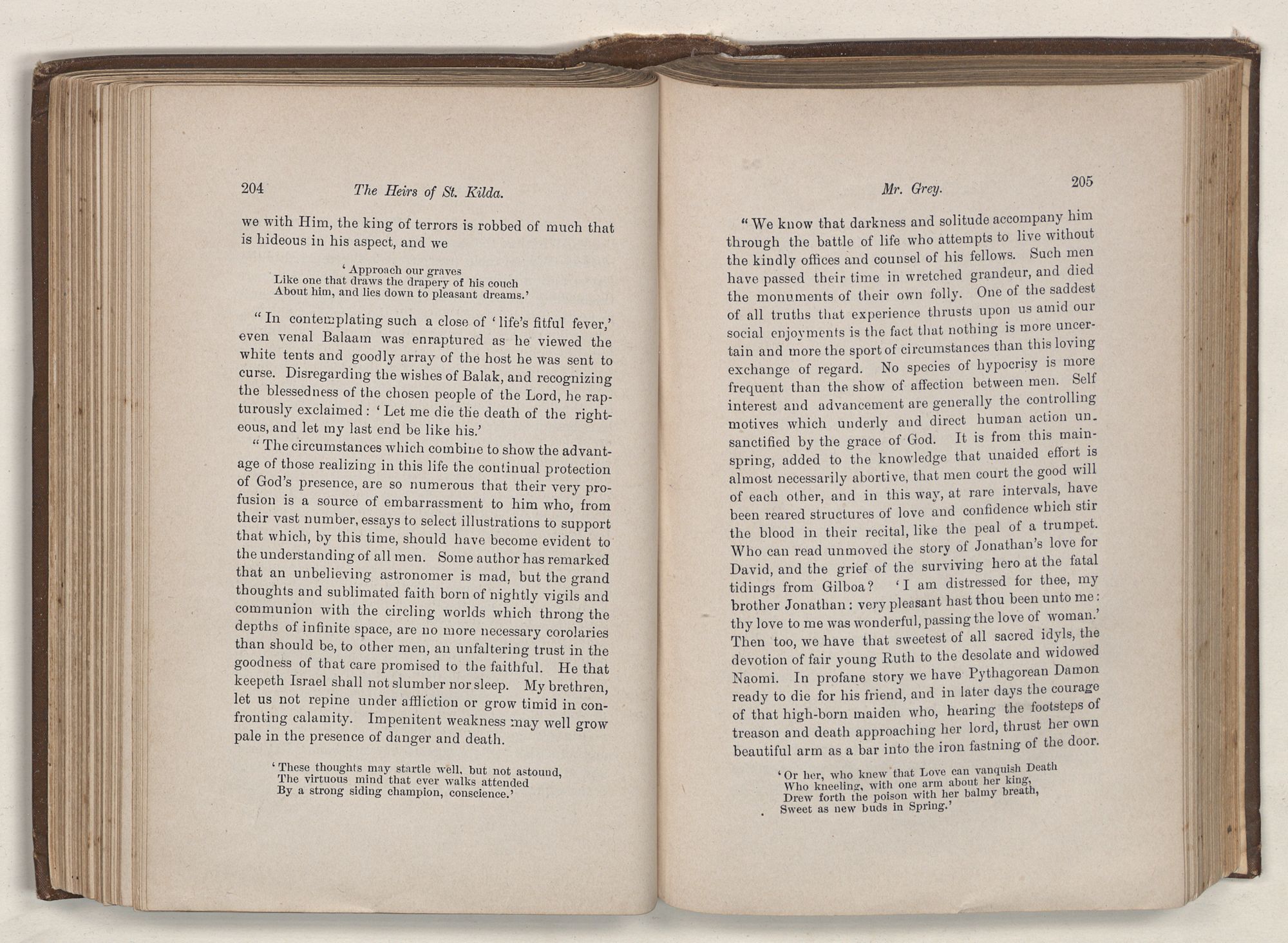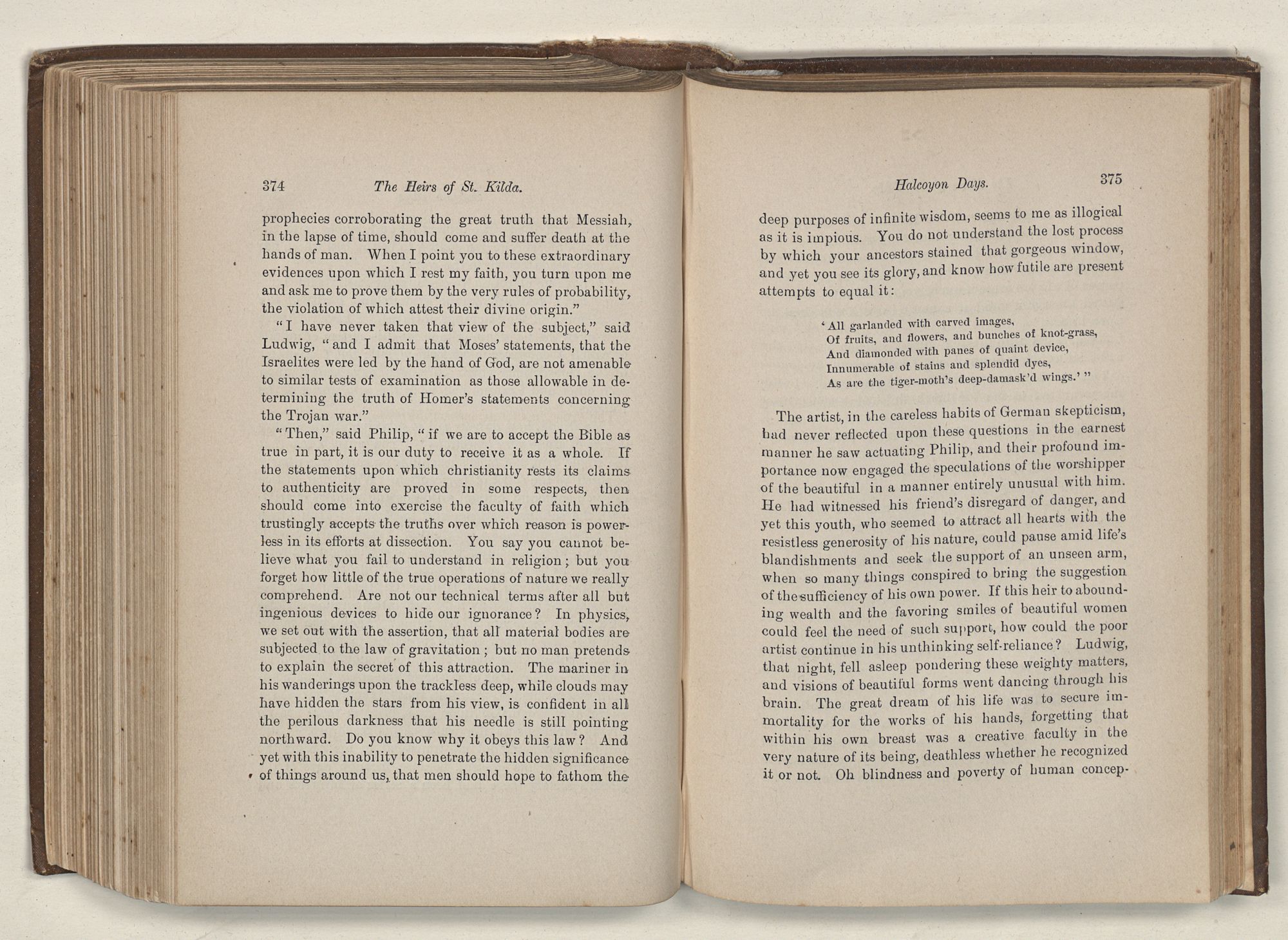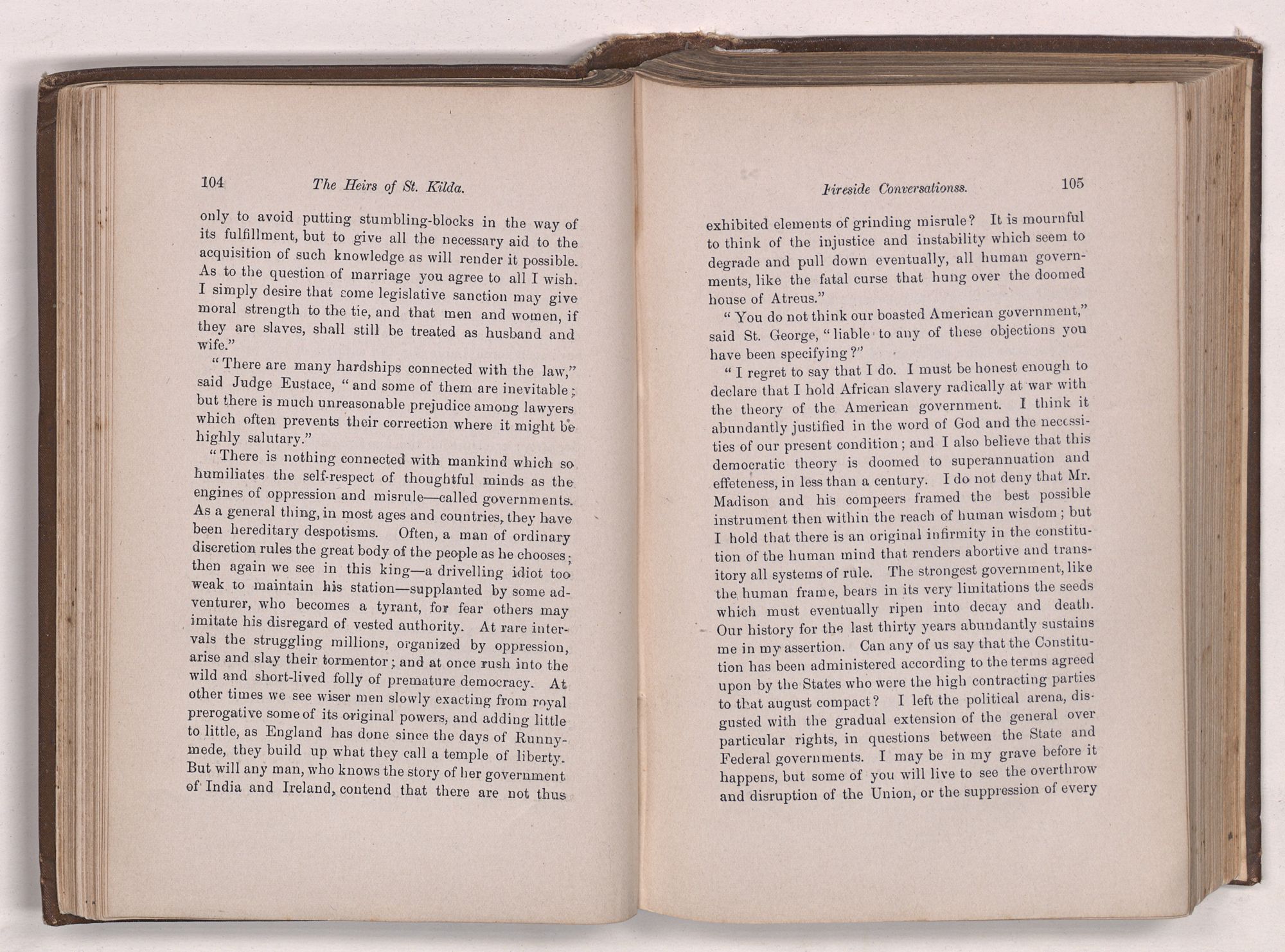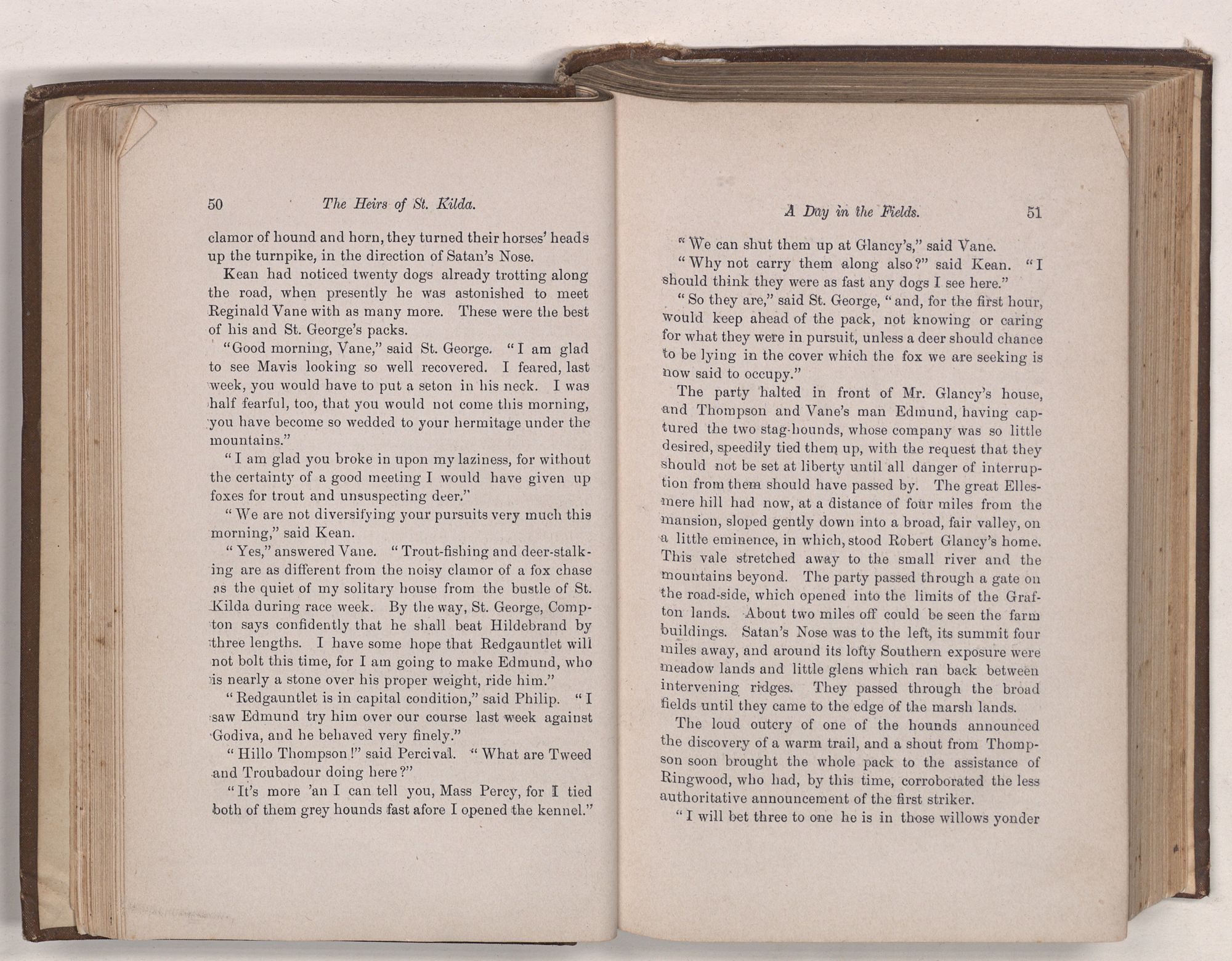 This story will be found to contain but little of the real controversy between us and the people who so long and successfully sought our undoing. The effort was made to avoid those memorable differences of opinion, and the author has contented himself with the simple portrayal of Southern men and women as he knew them in the days of their peace and prosperity. The motives controlling such an essay may be, in all modesty, claimed as nobler than the production of a mere love story. It is hoped that the “Heirs of St. Kilda,” will justify the claim that it is a faithful picture of our lost civilization.