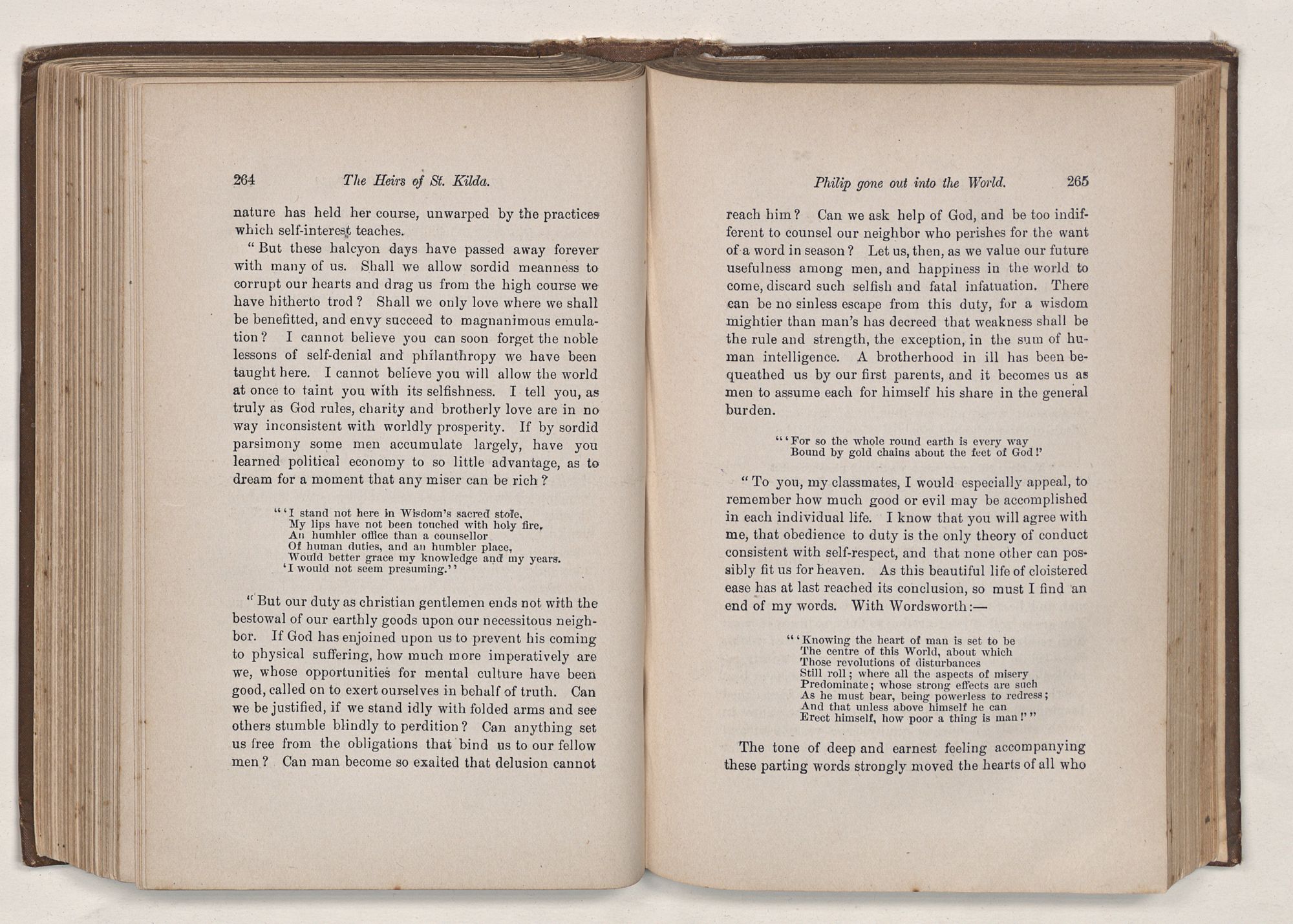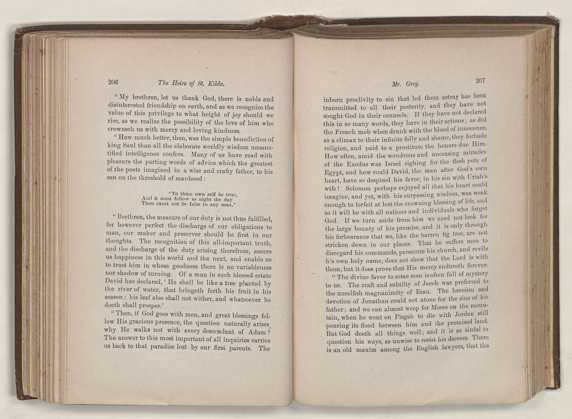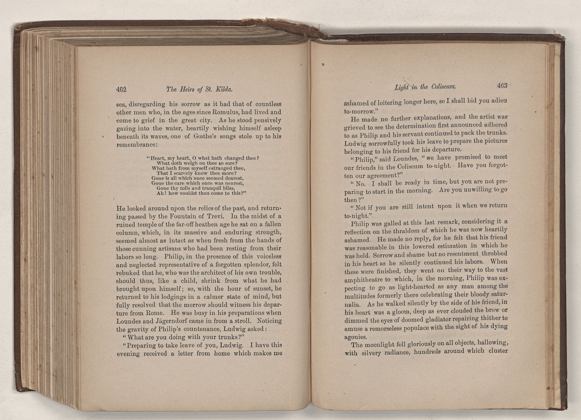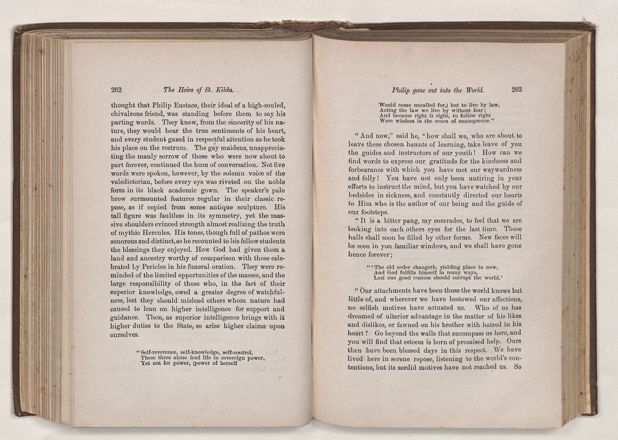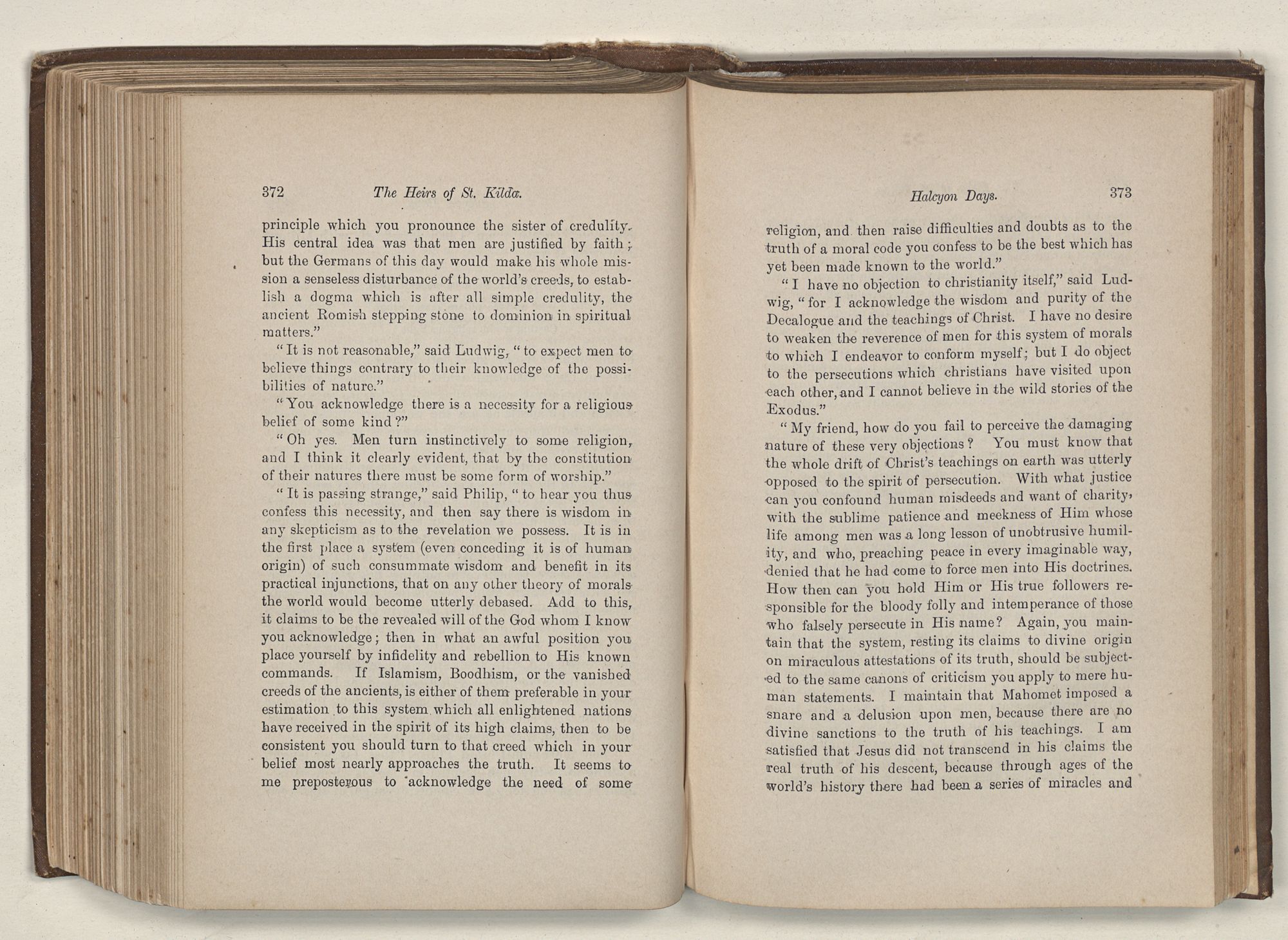 This story will be found to contain but little of the real controversy between us and the people who so long and successfully sought our undoing. The effort was made to avoid those memorable differences of opinion, and the author has contented himself with the simple portrayal of Southern men and women as he knew them in the days of their peace and prosperity. The motives controlling such an essay may be, in all modesty, claimed as nobler than the production of a mere love story. It is hoped that the “Heirs of St. Kilda,” will justify the claim that it is a faithful picture of our lost civilization.