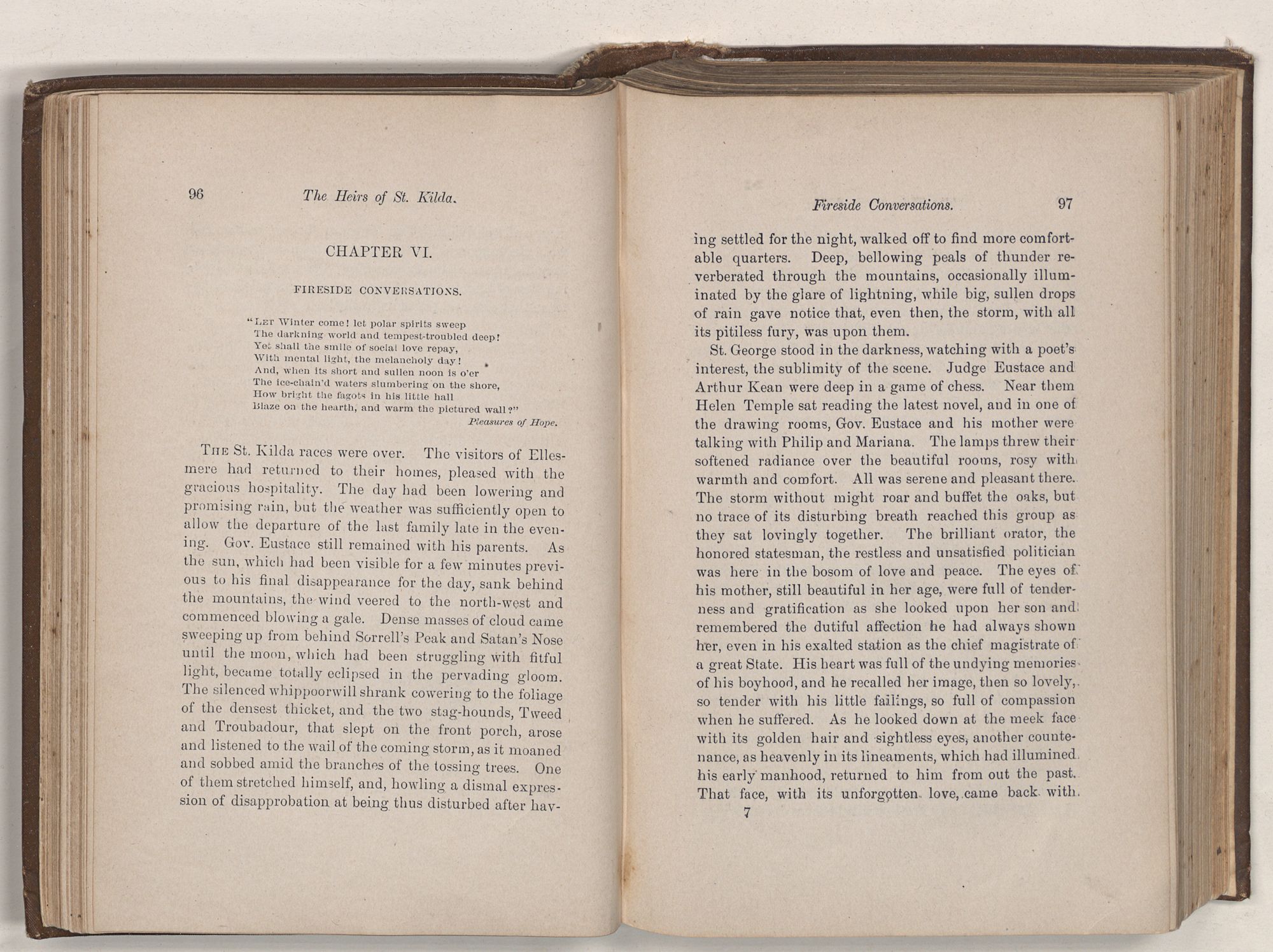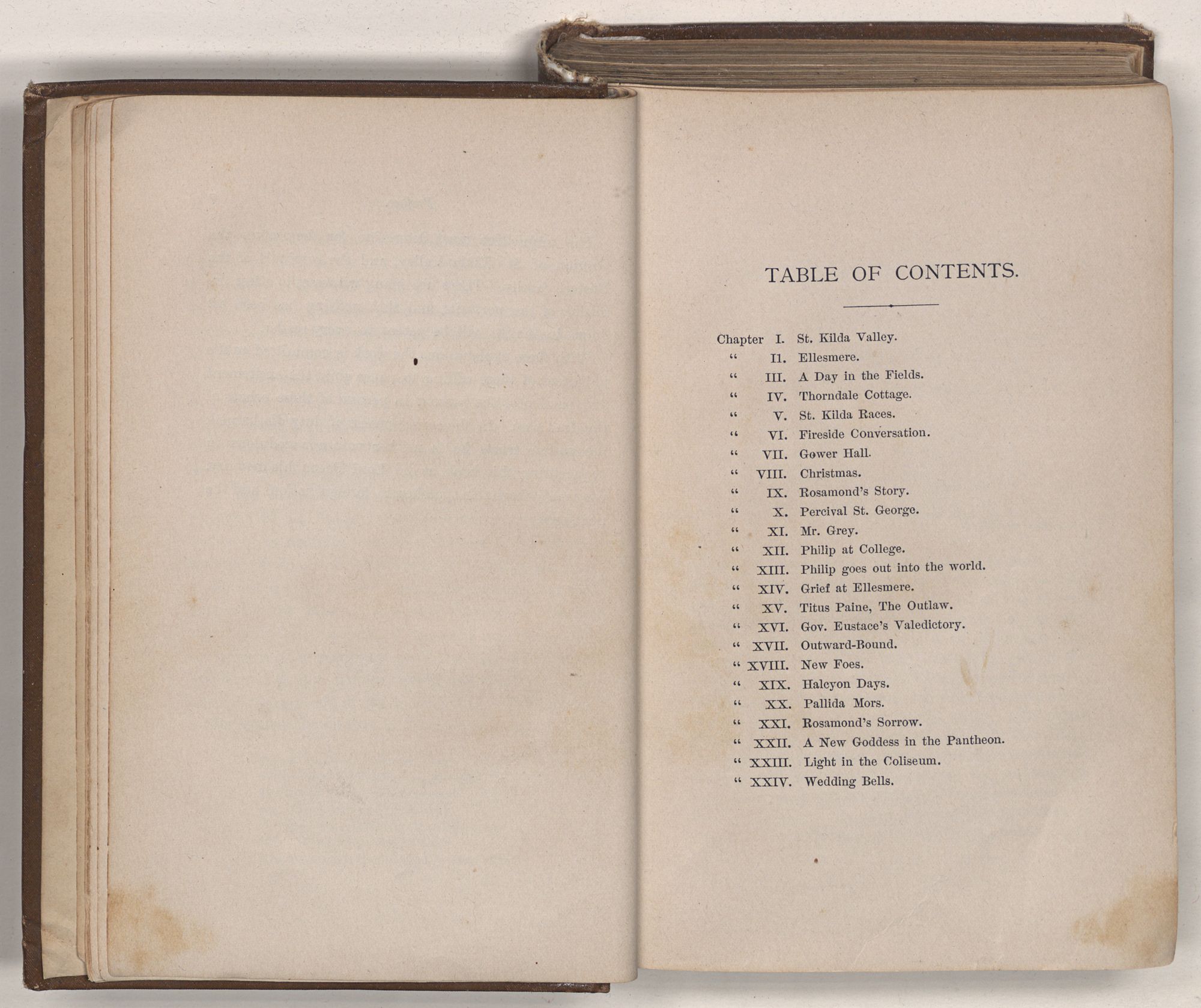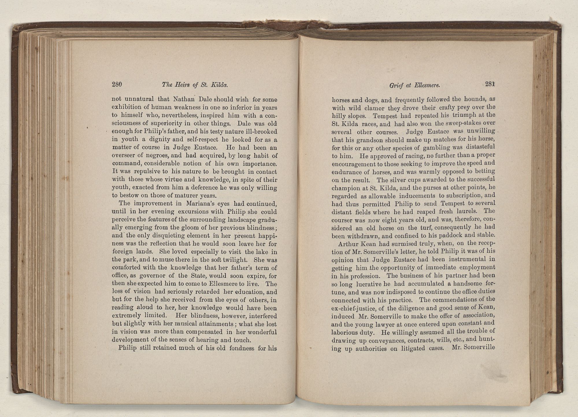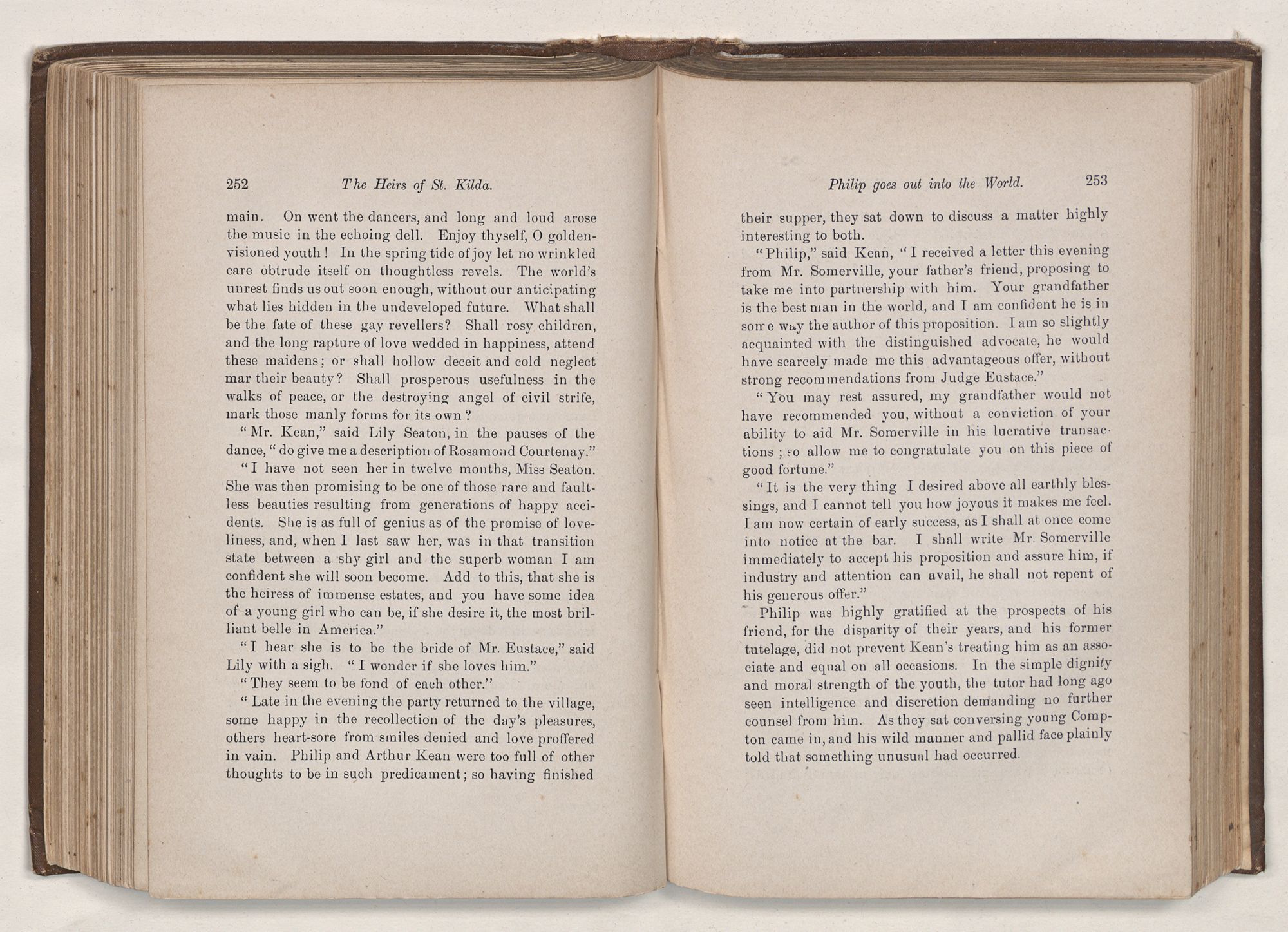 At the east end of the library sat Mrs. Eustace talking with Mr. Mason Somerville, who was on a visit with his daughter, Ida, to the family at Ellesmere. He lived at St. Kilda, and was then the leading counsel in that portion of the State. He had been the law-partner of Gov. Eustace until that gentleman gave up the practice for the larger excitement of a seat in the national House of Representatives. Over on their right sat Philip, Ida Somerville and Mariana.
