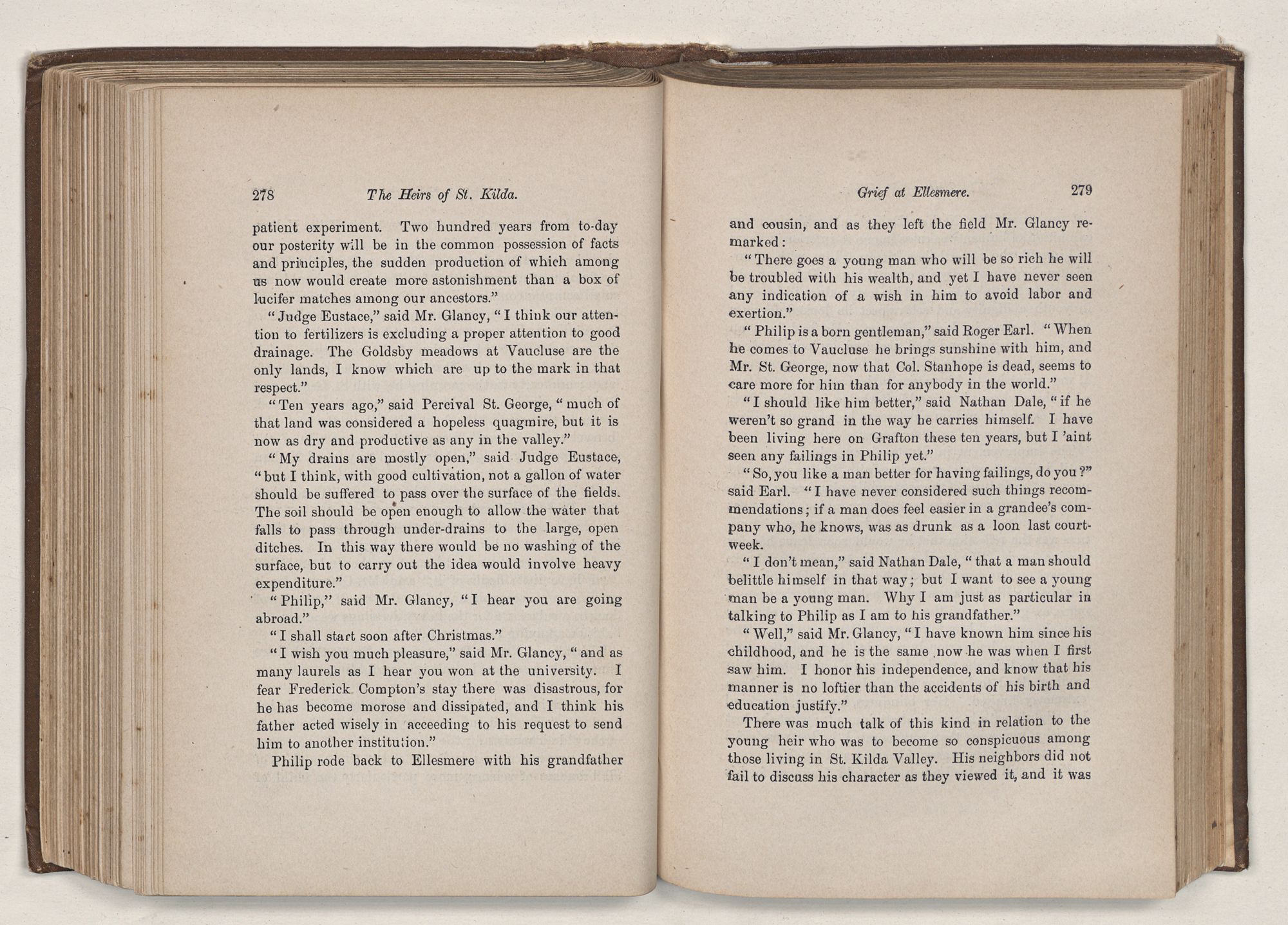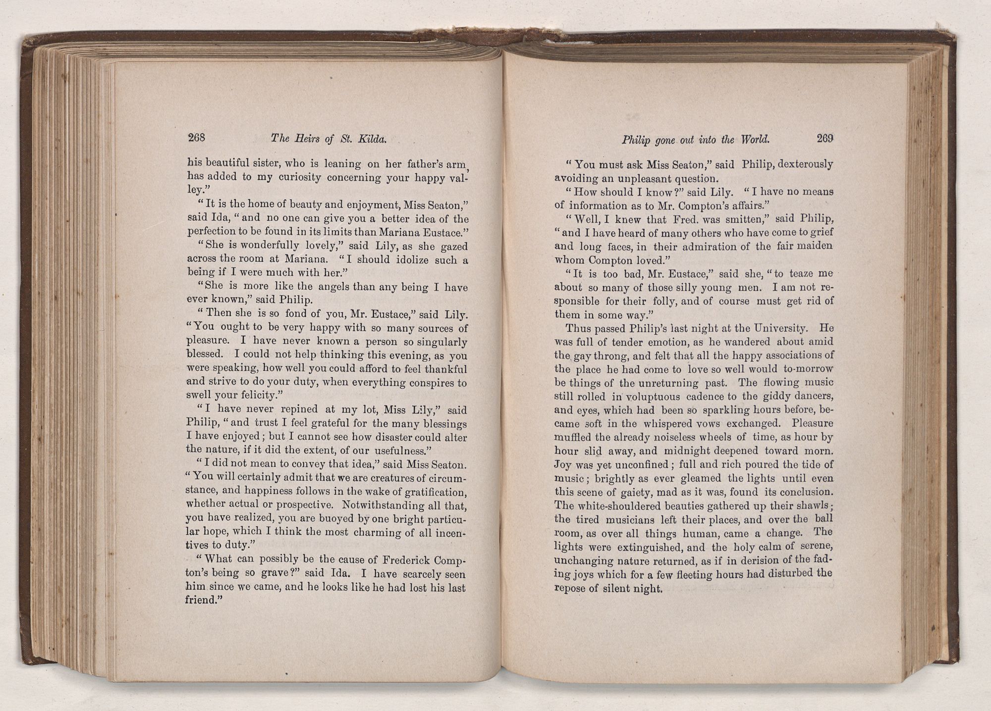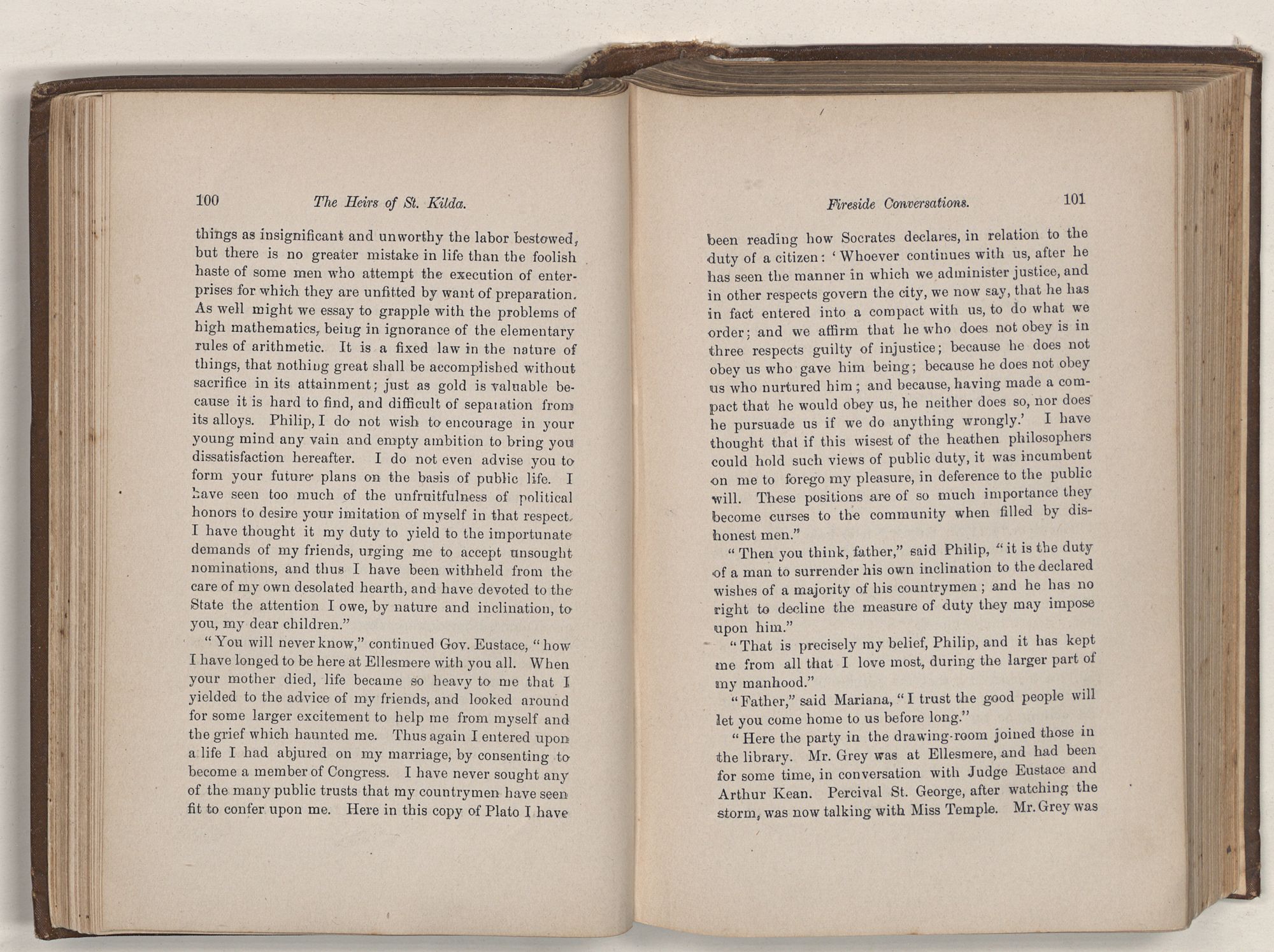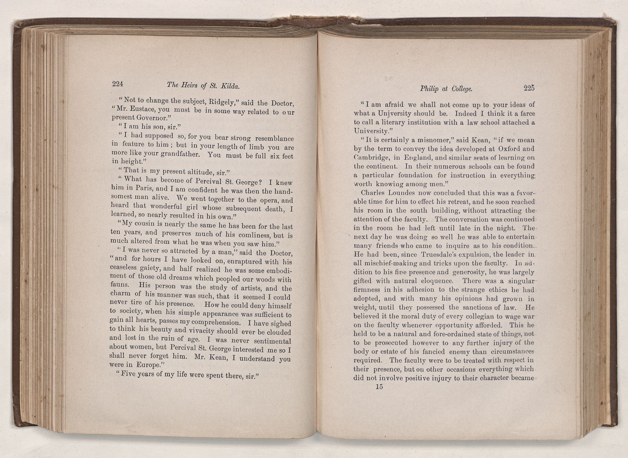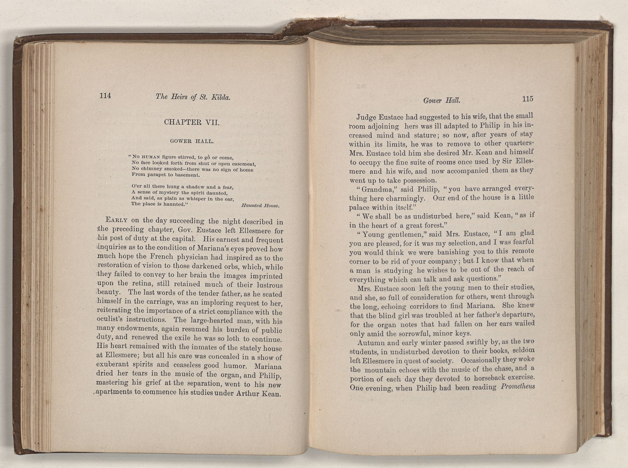 At the east end of the library sat Mrs. Eustace talking with Mr. Mason Somerville, who was on a visit with his daughter, Ida, to the family at Ellesmere. He lived at St. Kilda, and was then the leading counsel in that portion of the State. He had been the law-partner of Gov. Eustace until that gentleman gave up the practice for the larger excitement of a seat in the national House of Representatives. Over on their right sat Philip, Ida Somerville and Mariana.