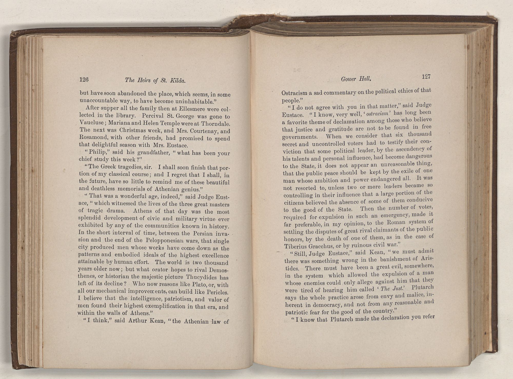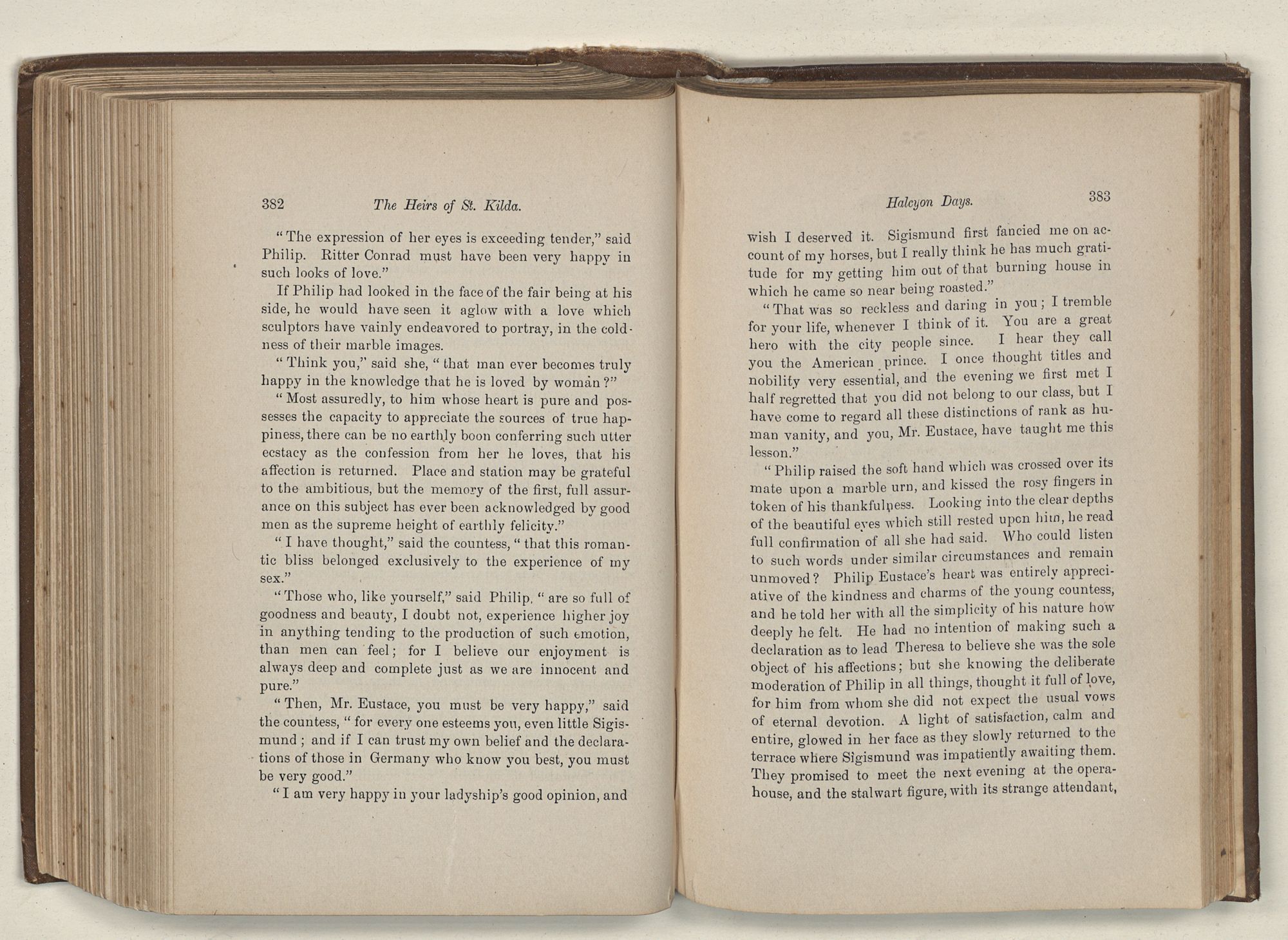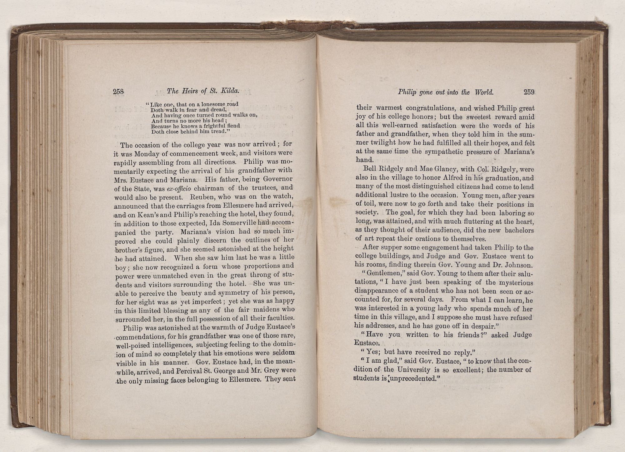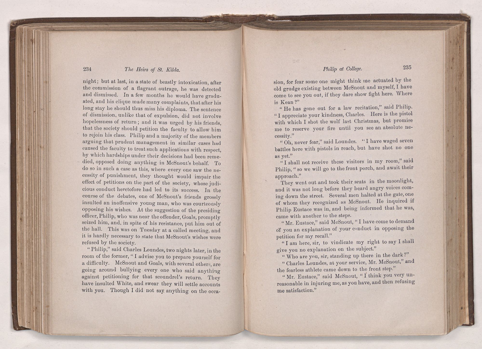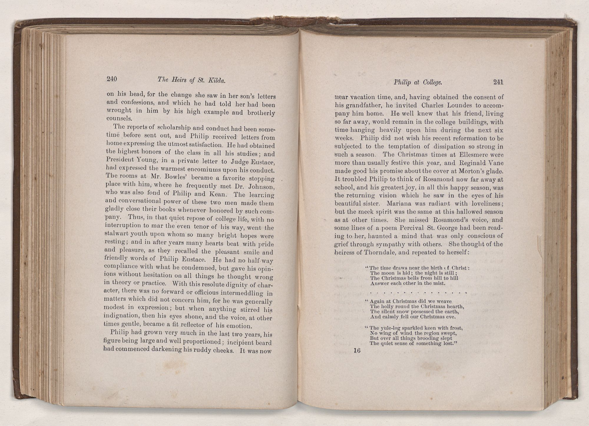 At the east end of the library sat Mrs. Eustace talking with Mr. Mason Somerville, who was on a visit with his daughter, Ida, to the family at Ellesmere. He lived at St. Kilda, and was then the leading counsel in that portion of the State. He had been the law-partner of Gov. Eustace until that gentleman gave up the practice for the larger excitement of a seat in the national House of Representatives. Over on their right sat Philip, Ida Somerville and Mariana.