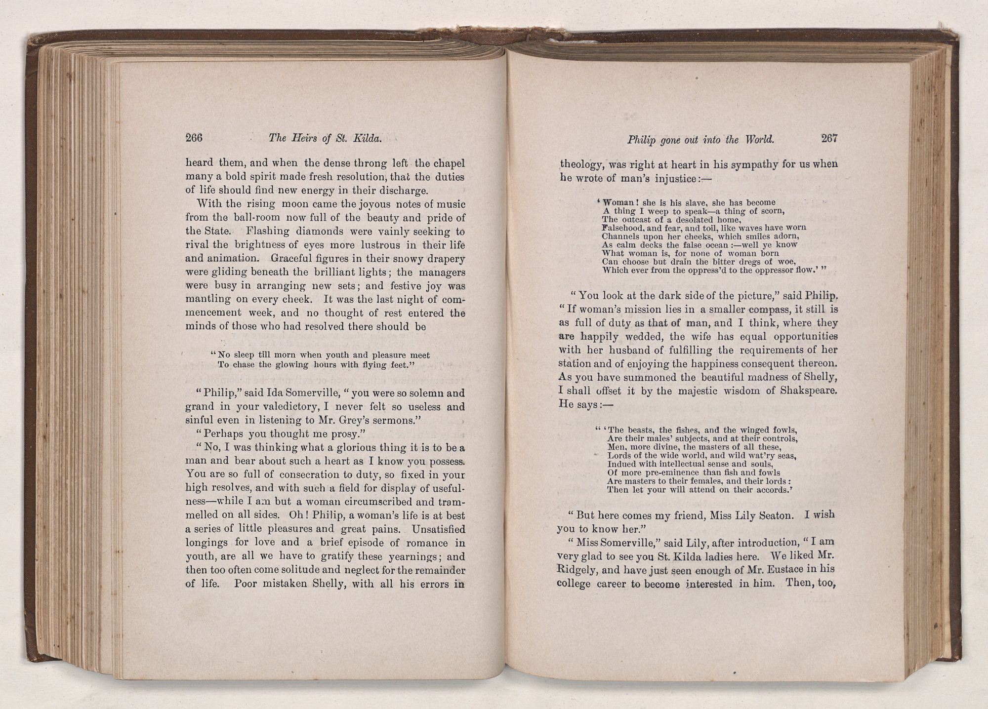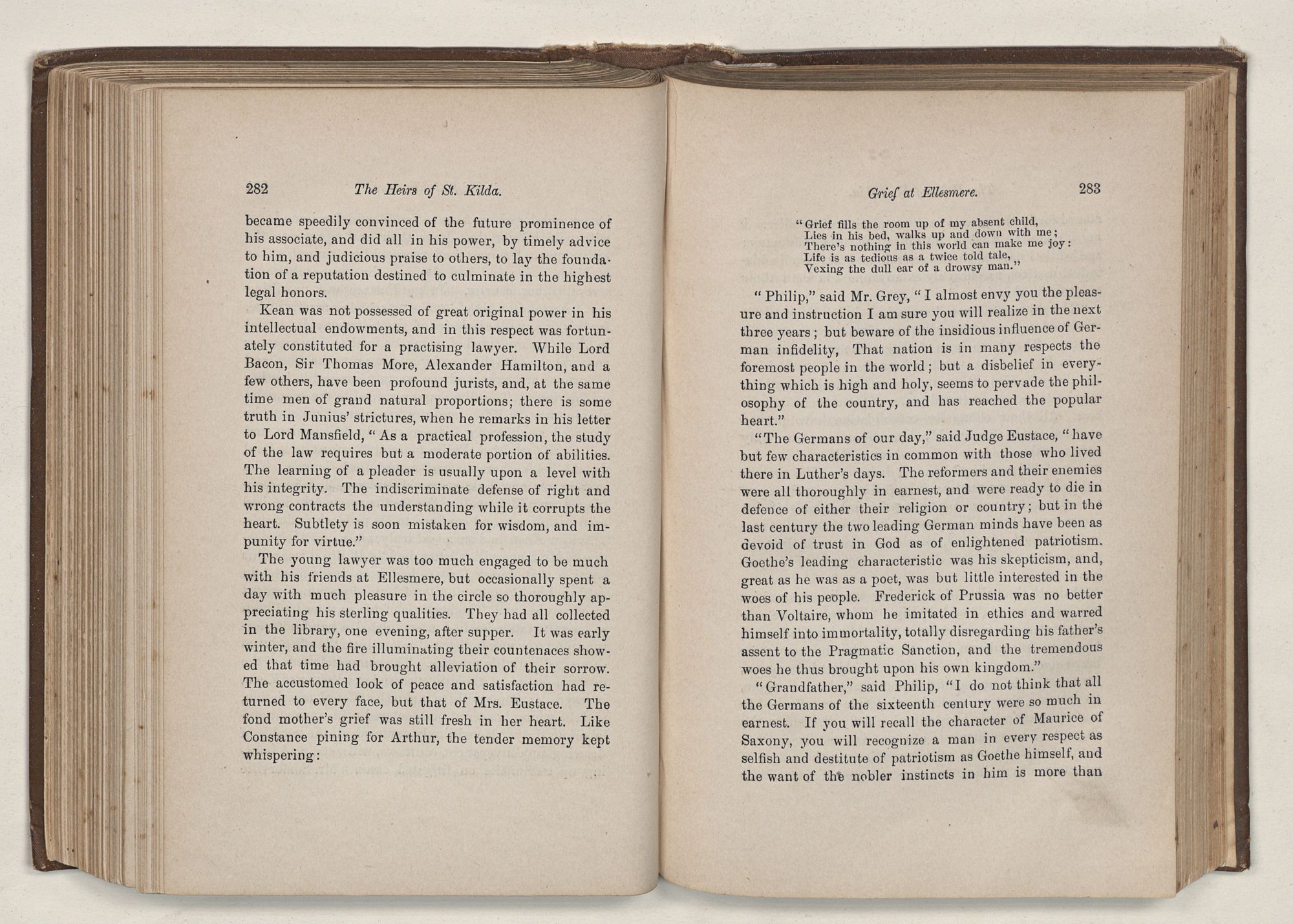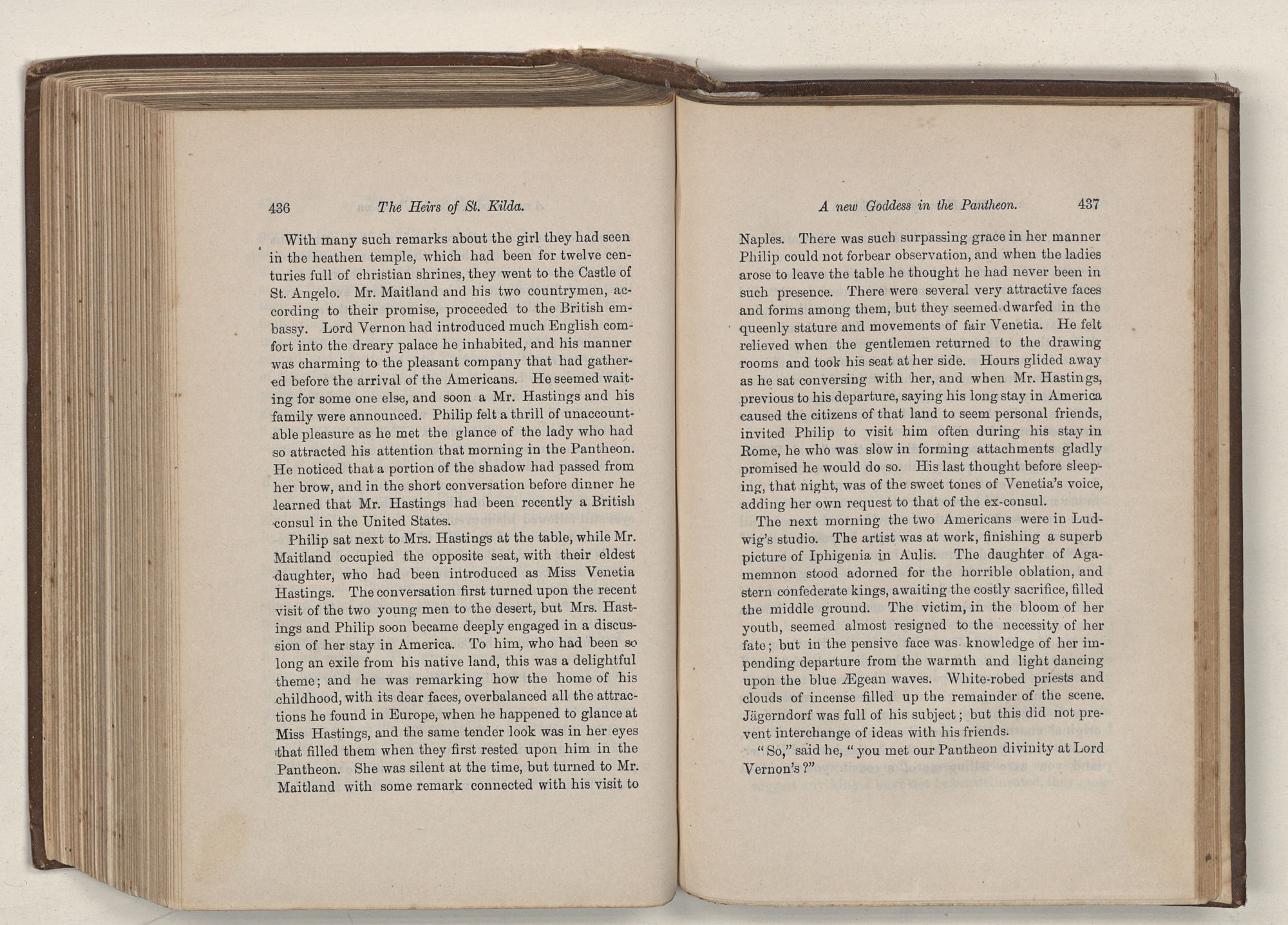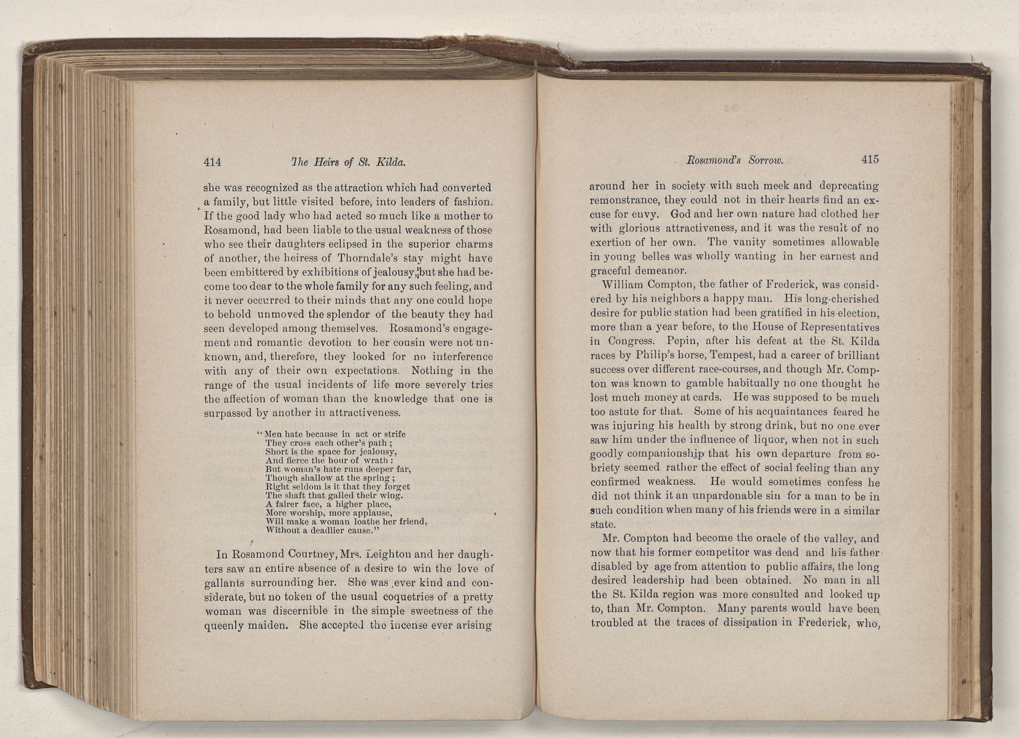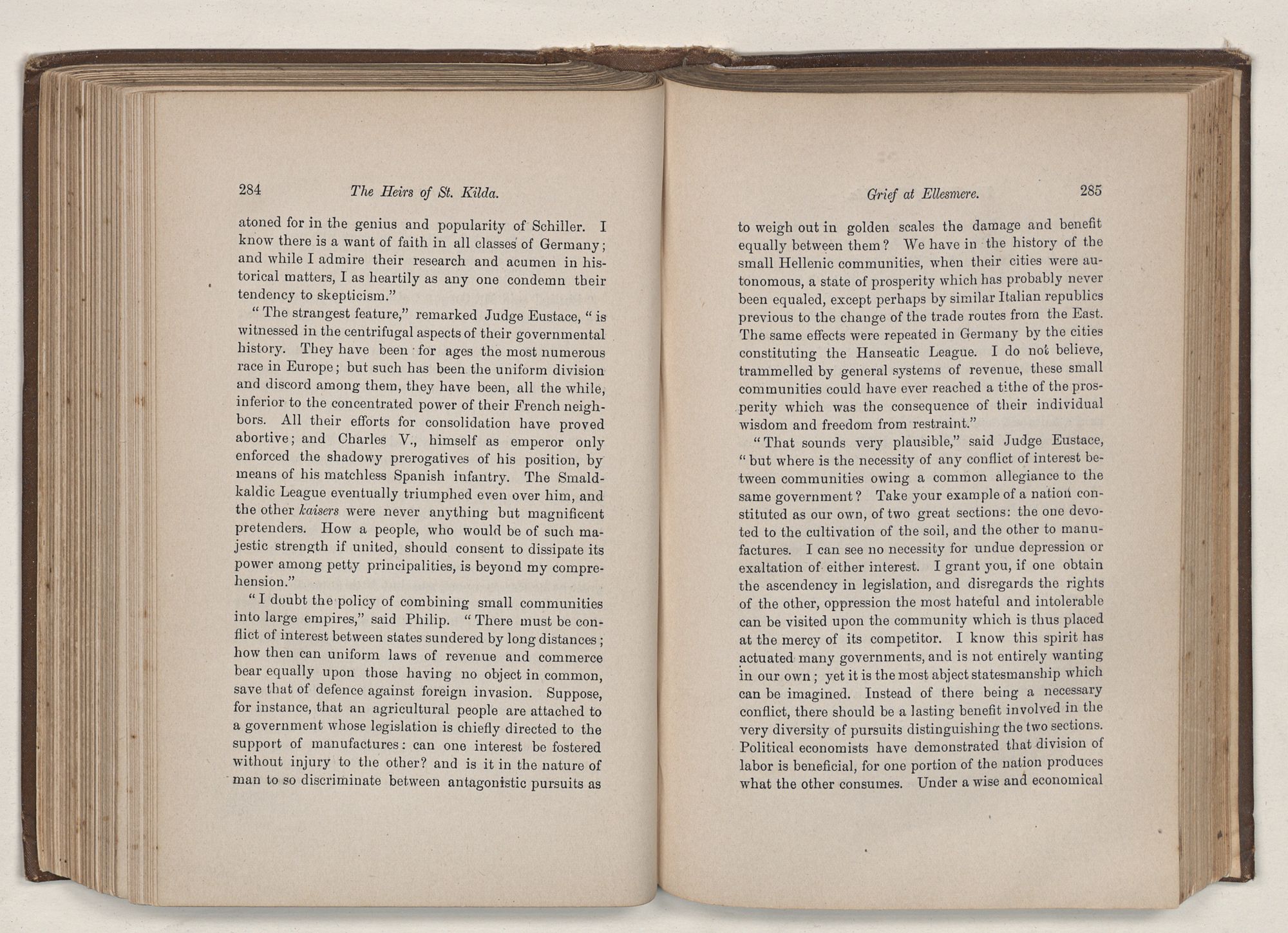 At the east end of the library sat Mrs. Eustace talking with Mr. Mason Somerville, who was on a visit with his daughter, Ida, to the family at Ellesmere. He lived at St. Kilda, and was then the leading counsel in that portion of the State. He had been the law-partner of Gov. Eustace until that gentleman gave up the practice for the larger excitement of a seat in the national House of Representatives. Over on their right sat Philip, Ida Somerville and Mariana.