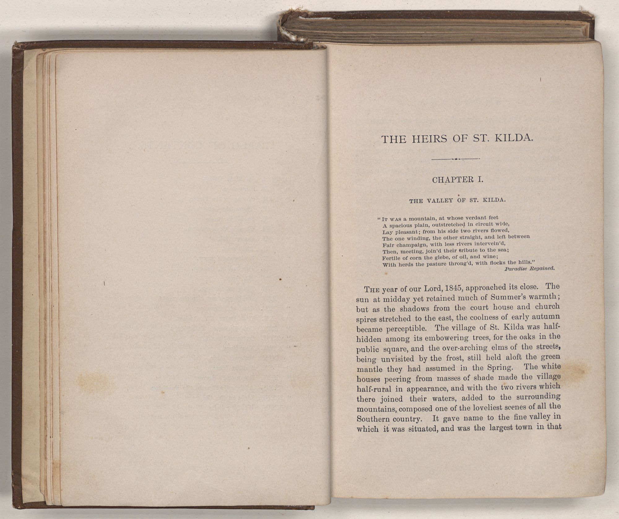 THE year of our Lord, 1845, approached its close. The sun at midday yet retained much of Summer's warmth; but as the shadows from the court house and church spires stretched to the east, the coolness of early autumn became perceptible. The village of St. Kilda was half-hidden among its embowering trees, for the oaks in the public square, and the over-arching elms of the streets, being unvisited by the frost, still held aloft the green mantle they had assumed in the Spring. The white houses peering from masses of shade made the village half-rural in appearance, and with the two rivers which there joined their waters, added to the surrounding mountains, composed one of the loveliest scenes of all the Southern country. It gave name to the fine valley in which it was situated, and was the largest town in that