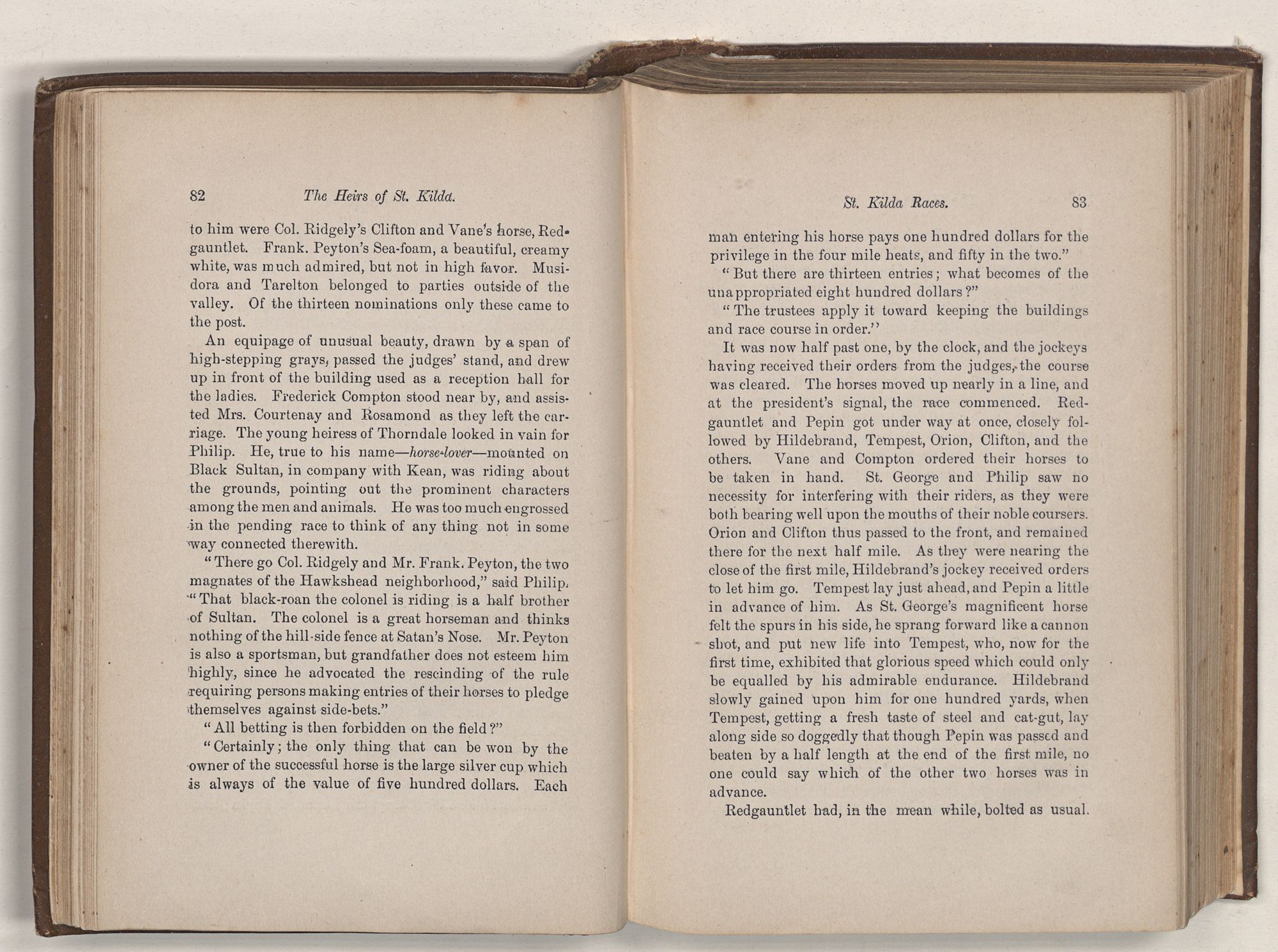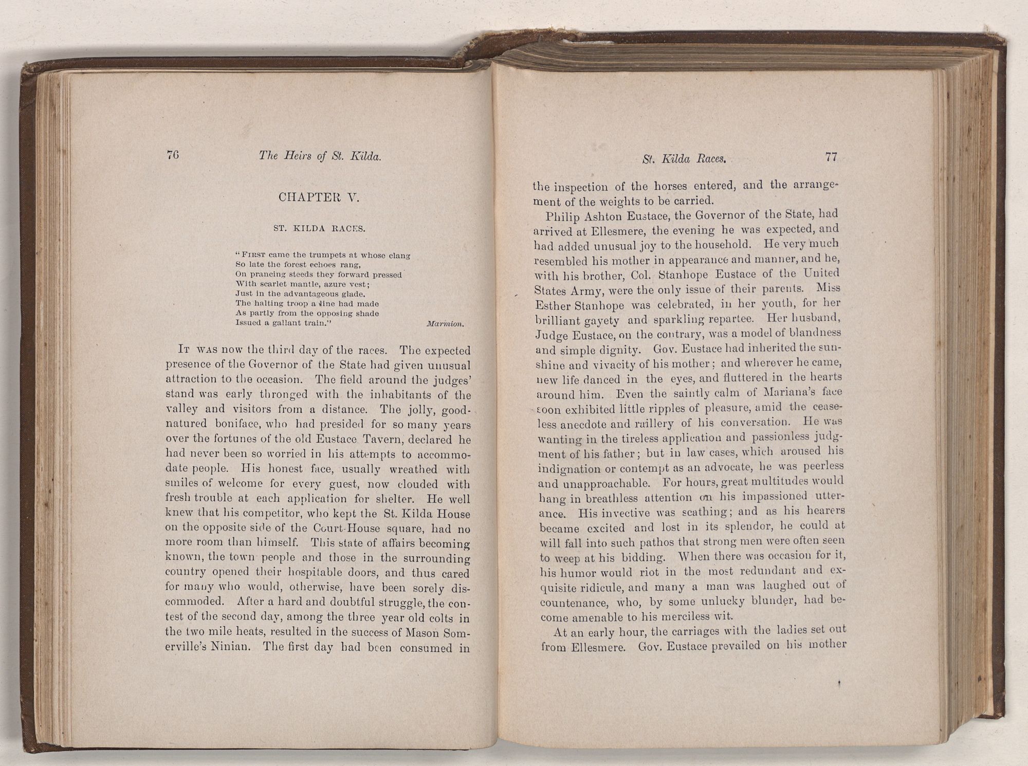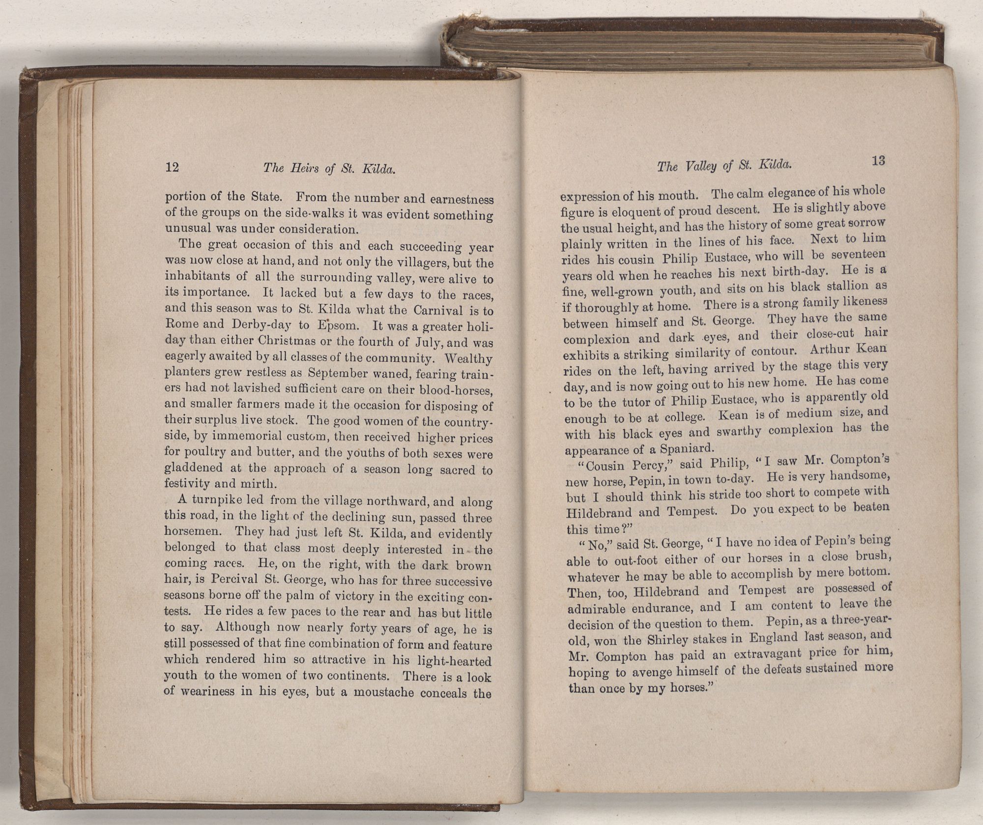 A turnpike led from the village northward, and along this road, in the light of the declining sun, passed three horsemen. They had just left St. Kilda, and evidently belonged to that class most deeply interested in the coming races. He, on the right, with the dark brown hair, is Percival St. George, who has for three successive seasons borne off the palm of victory in the exciting contests. He rides a few paces to the rear and has but little to say. Although now nearly forty years of age, he is still possessed of that fine combination of form and feature which rendered him so attractive in his light-hearted youth to the women of two continents. There is a look of weariness in his eyes, but a moustache conceals the