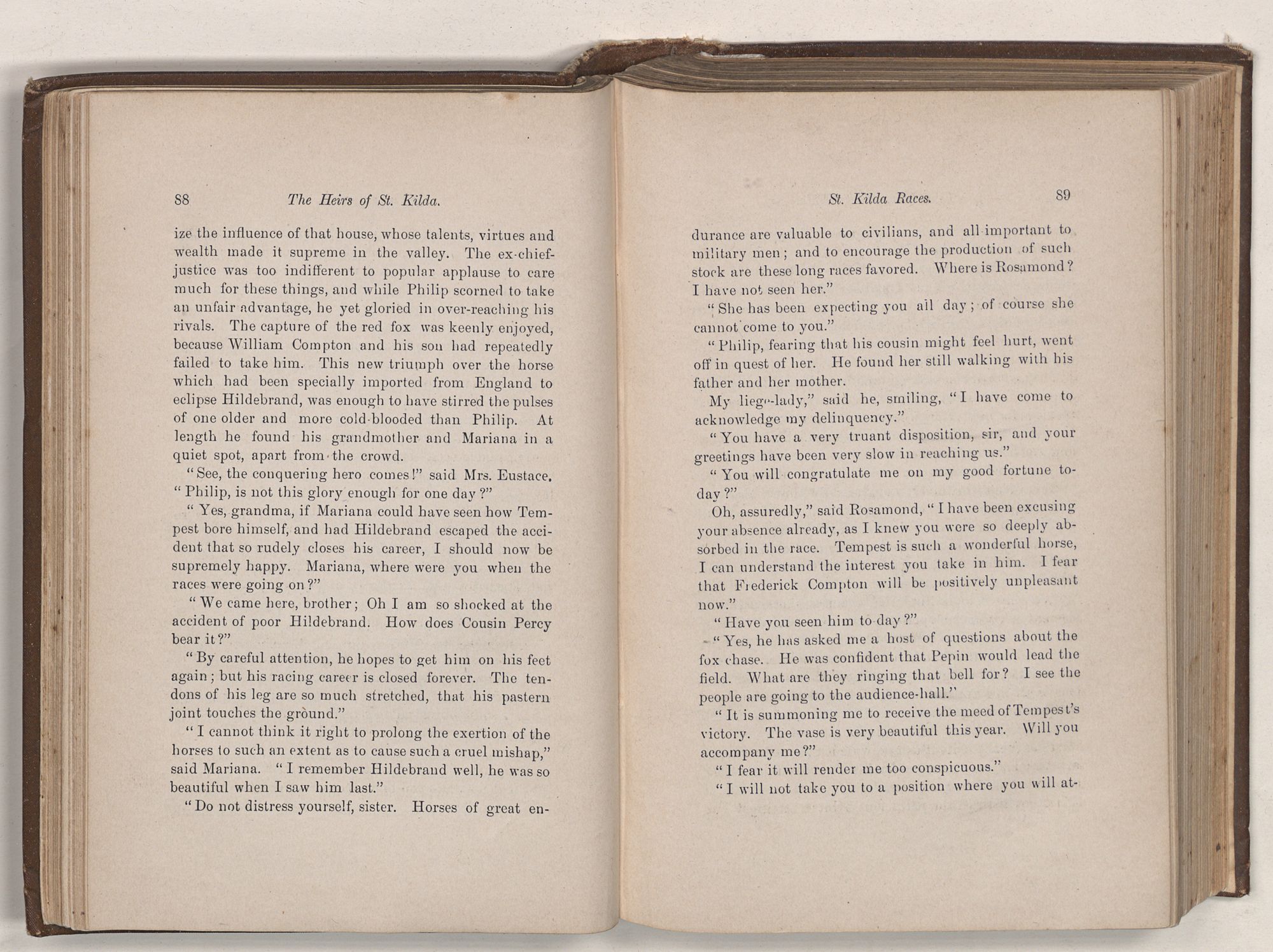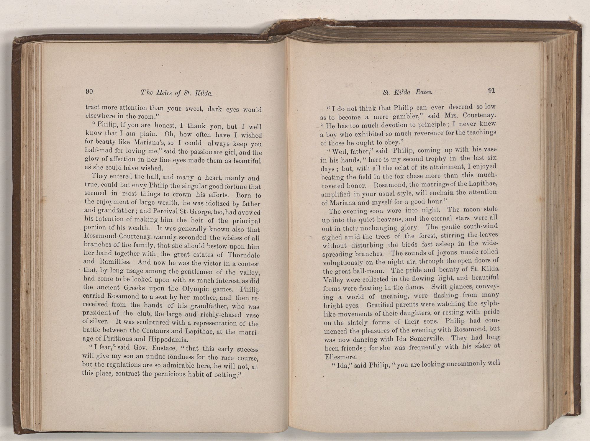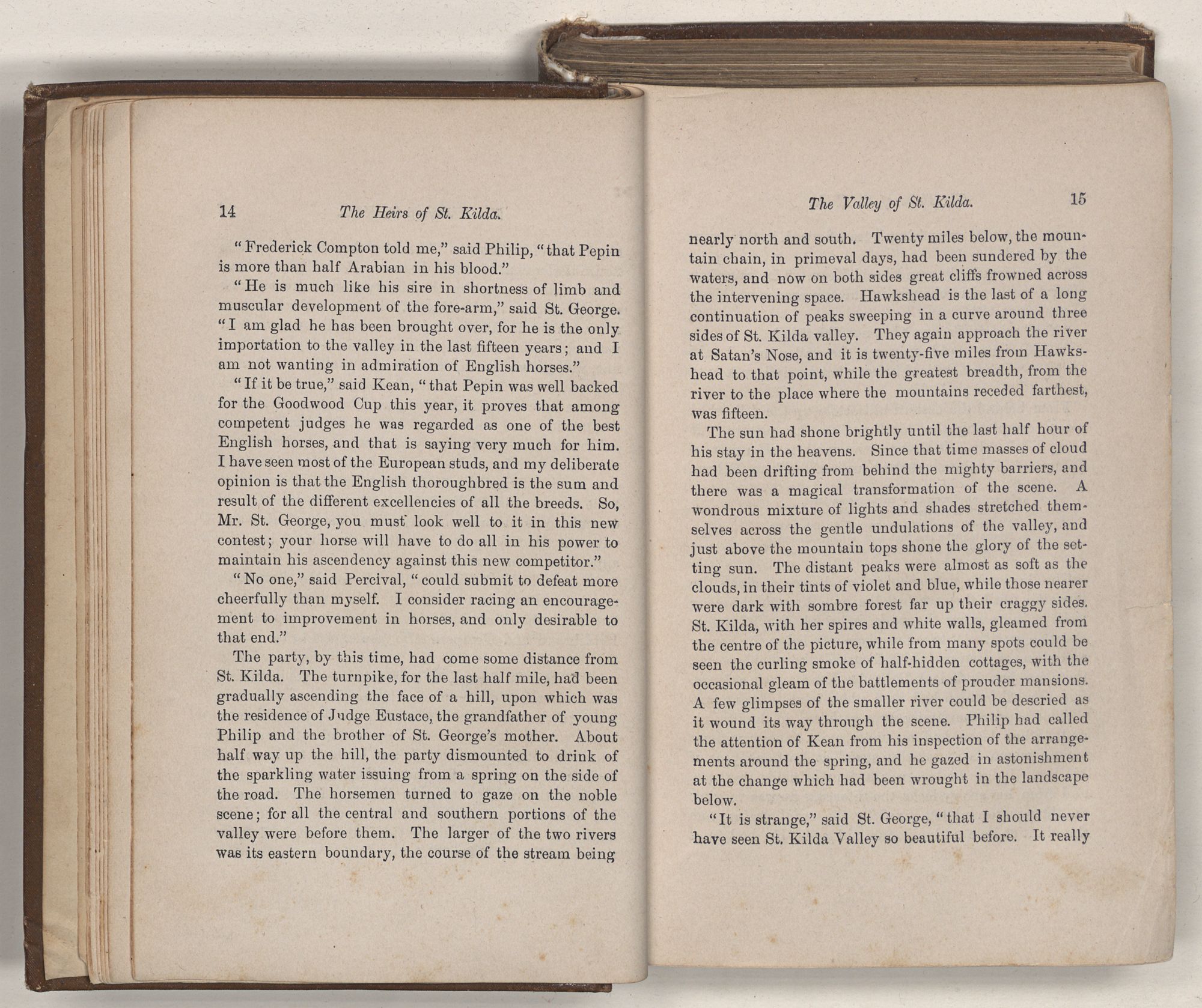 A turnpike led from the village northward, and along this road, in the light of the declining sun, passed three horsemen. They had just left St. Kilda, and evidently belonged to that class most deeply interested in the coming races. He, on the right, with the dark brown hair, is Percival St. George, who has for three successive seasons borne off the palm of victory in the exciting contests. He rides a few paces to the rear and has but little to say. Although now nearly forty years of age, he is still possessed of that fine combination of form and feature which rendered him so attractive in his light-hearted youth to the women of two continents. There is a look of weariness in his eyes, but a moustache conceals the
