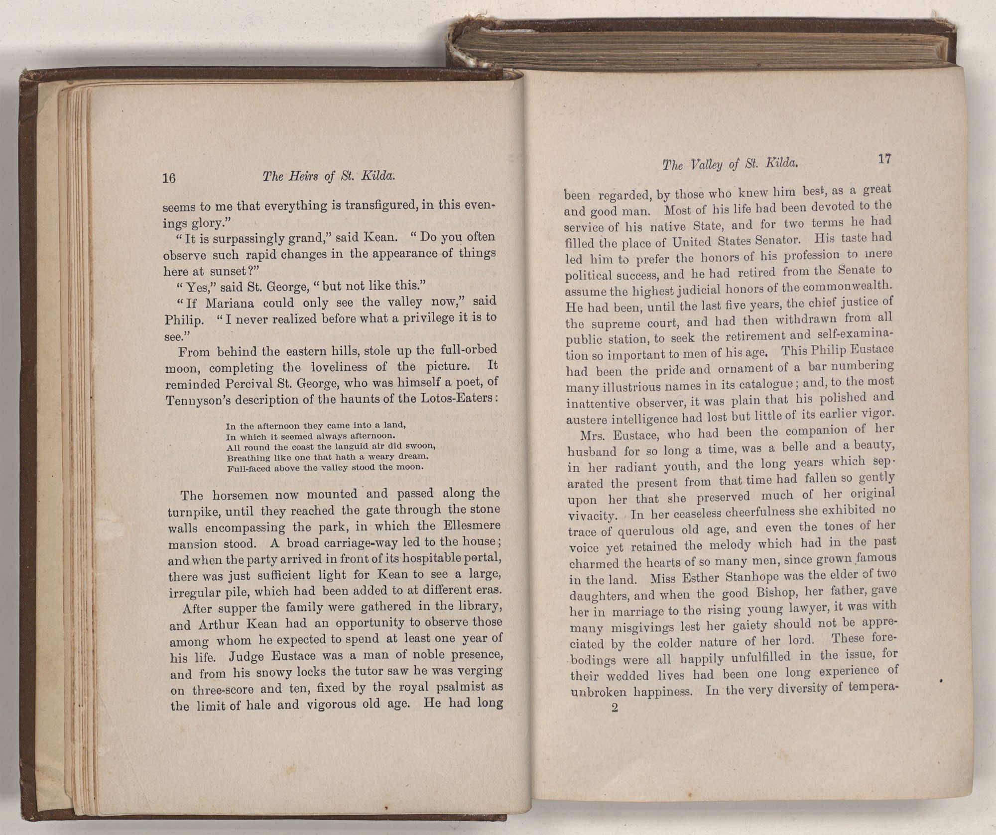 From behind the eastern hills, stole up the full-orbed moon, completing the loveliness of the picture. It reminded Percival St. George, who was himself a poet, of Tennyson's description of the haunts of the Lotos-Eaters: In the afternoon they came into a land,In which It seemed always afternoon.All round the coast the languid air did swoon,Breathing like ono that bath a weary dream. Full-faced above the valley stood the moon.