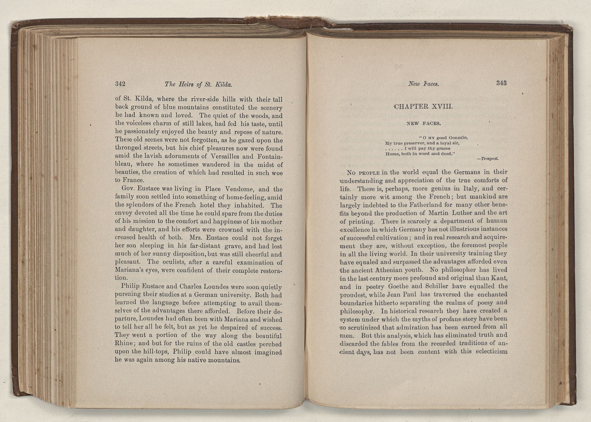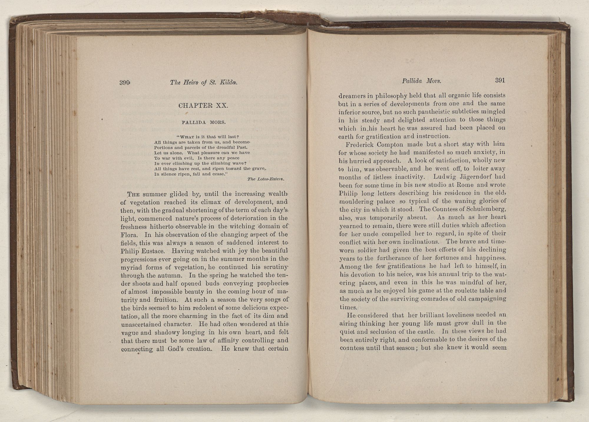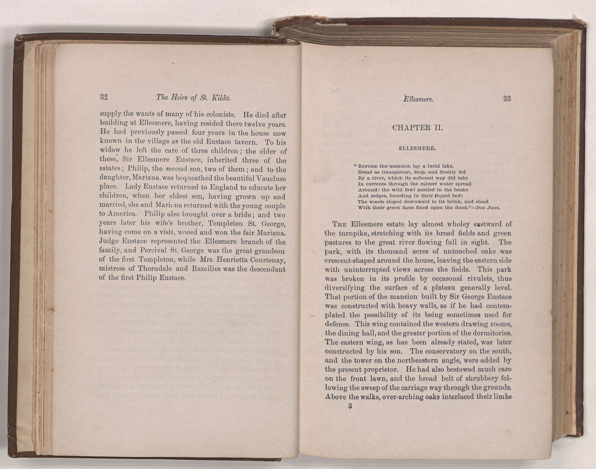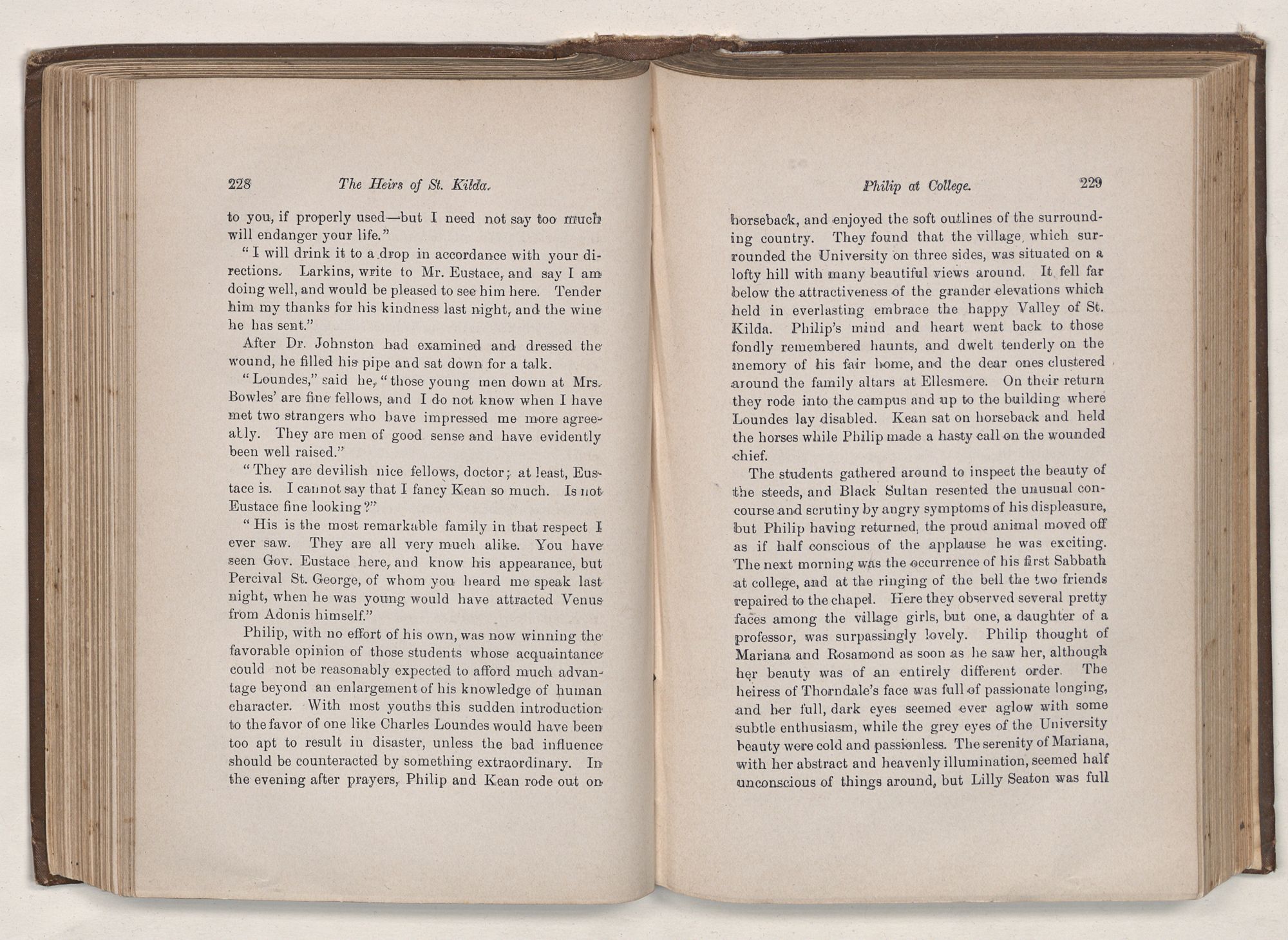 “Fixed figures for the time of scorn“To point a slow unmoving finger at.”This story will be found to contain but little of the real controversy between us and the people who so long and successfully sought our undoing. The effort was made to avoid those memorable differences of opinion, and the author has contented himself with the simple portrayal of Southern men and women as he knew them in the days of their peace and prosperity. The motives controlling such an essay may be, in all modesty, claimed as nobler than the production of a mere love story. It is hoped that the “Heirs of St. Kilda,” will justify the claim that it is a faithful picture of our lost civilization.