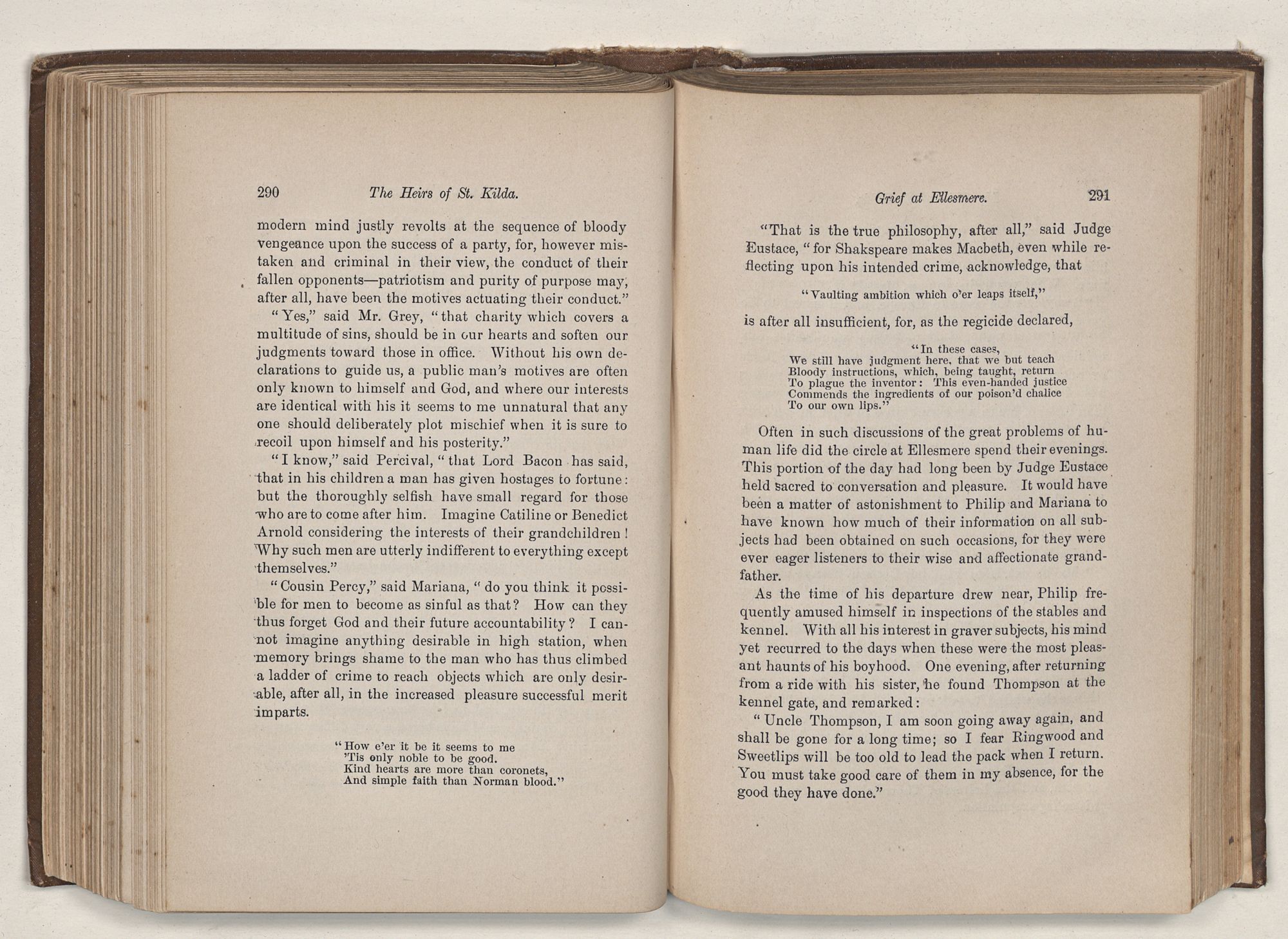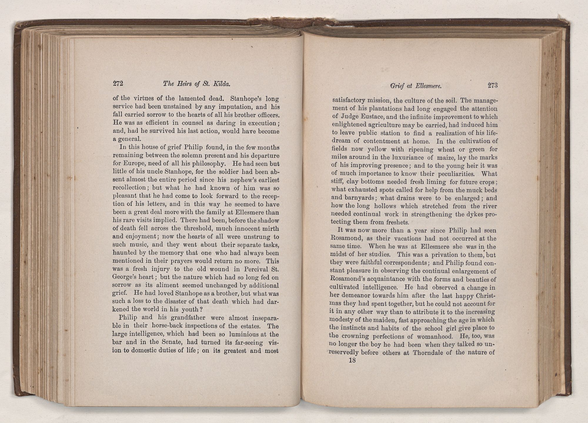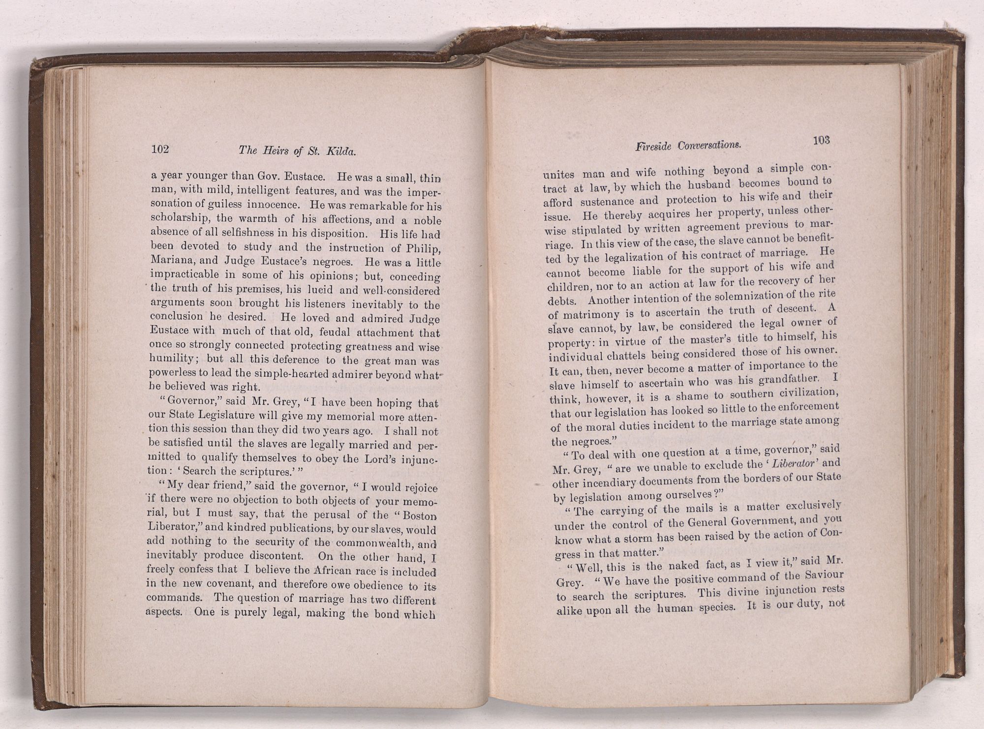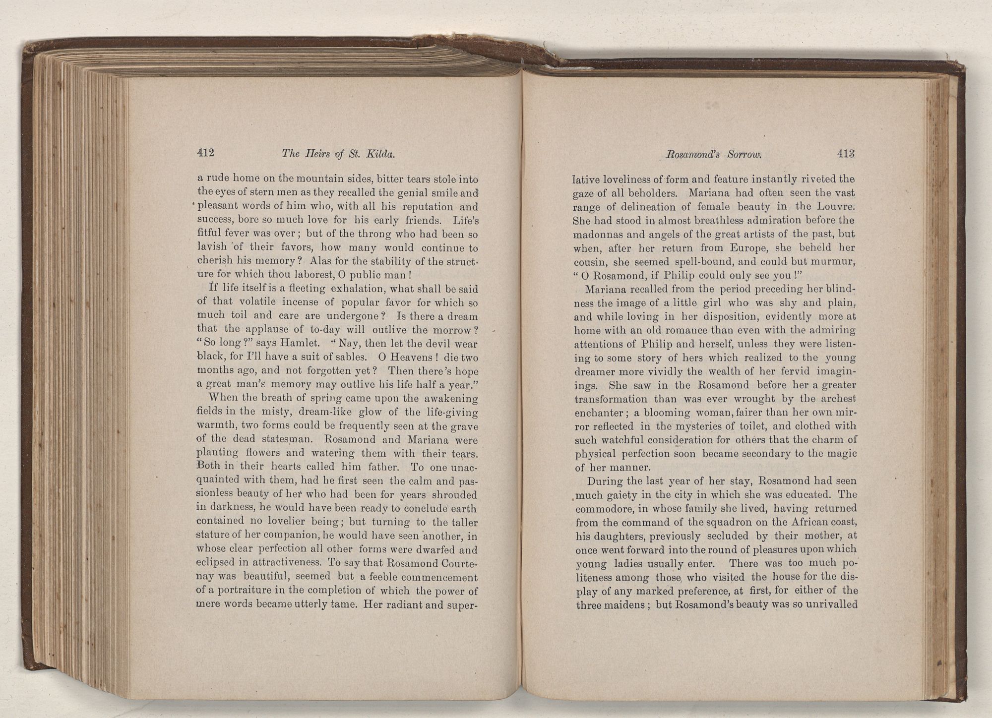 “Fixed figures for the time of scorn“To point a slow unmoving finger at.”This story will be found to contain but little of the real controversy between us and the people who so long and successfully sought our undoing. The effort was made to avoid those memorable differences of opinion, and the author has contented himself with the simple portrayal of Southern men and women as he knew them in the days of their peace and prosperity. The motives controlling such an essay may be, in all modesty, claimed as nobler than the production of a mere love story. It is hoped that the “Heirs of St. Kilda,” will justify the claim that it is a faithful picture of our lost civilization.