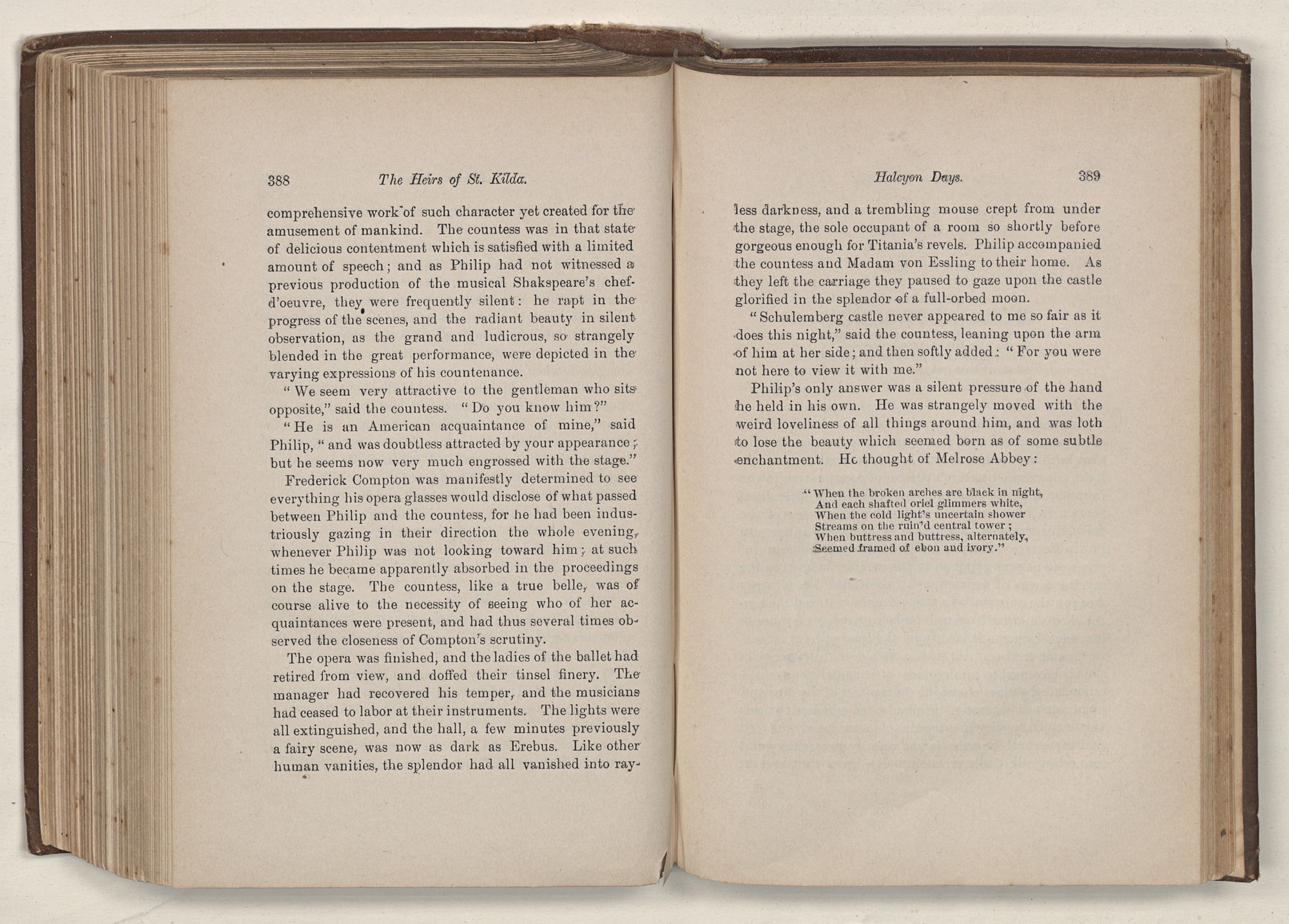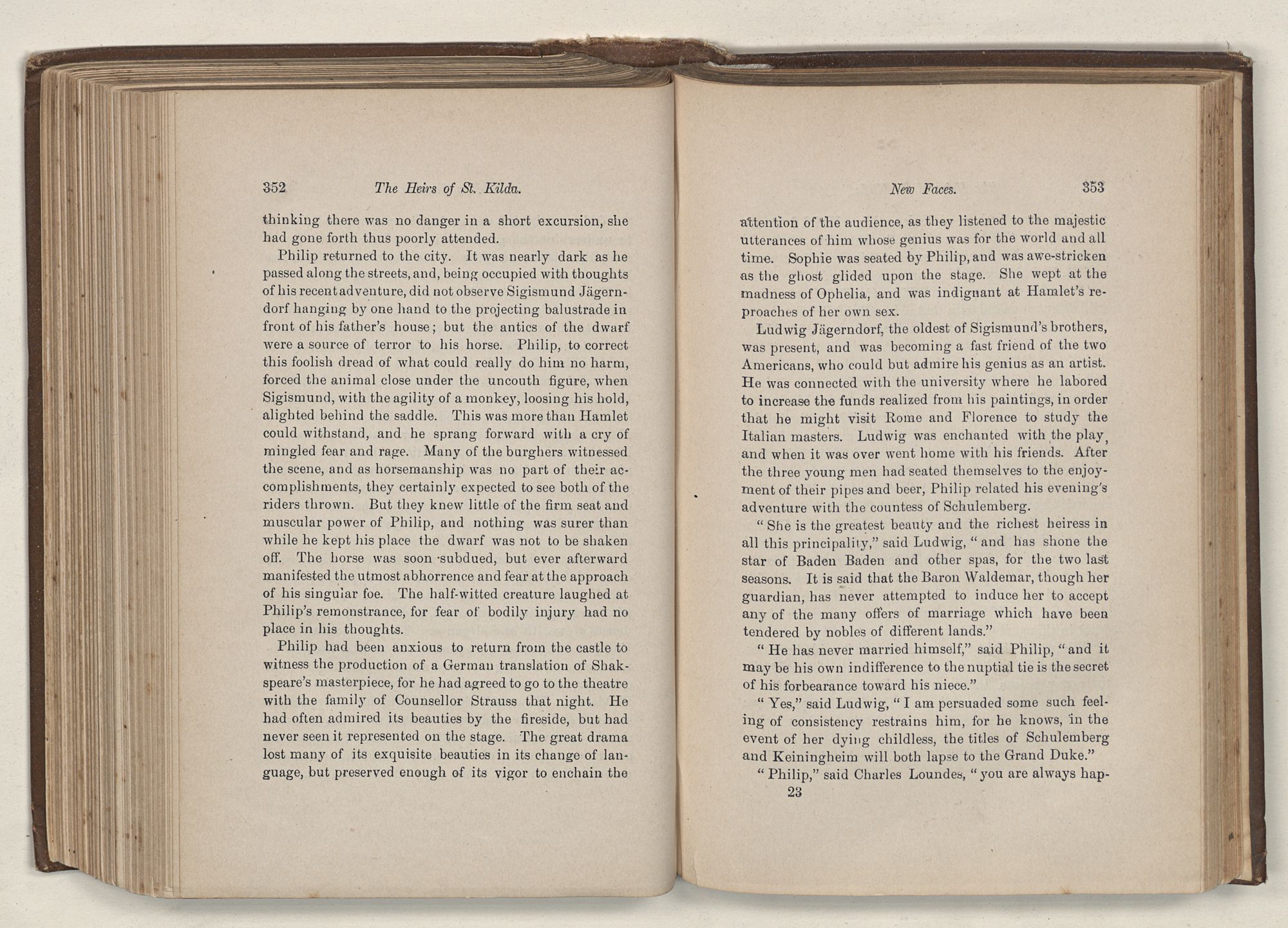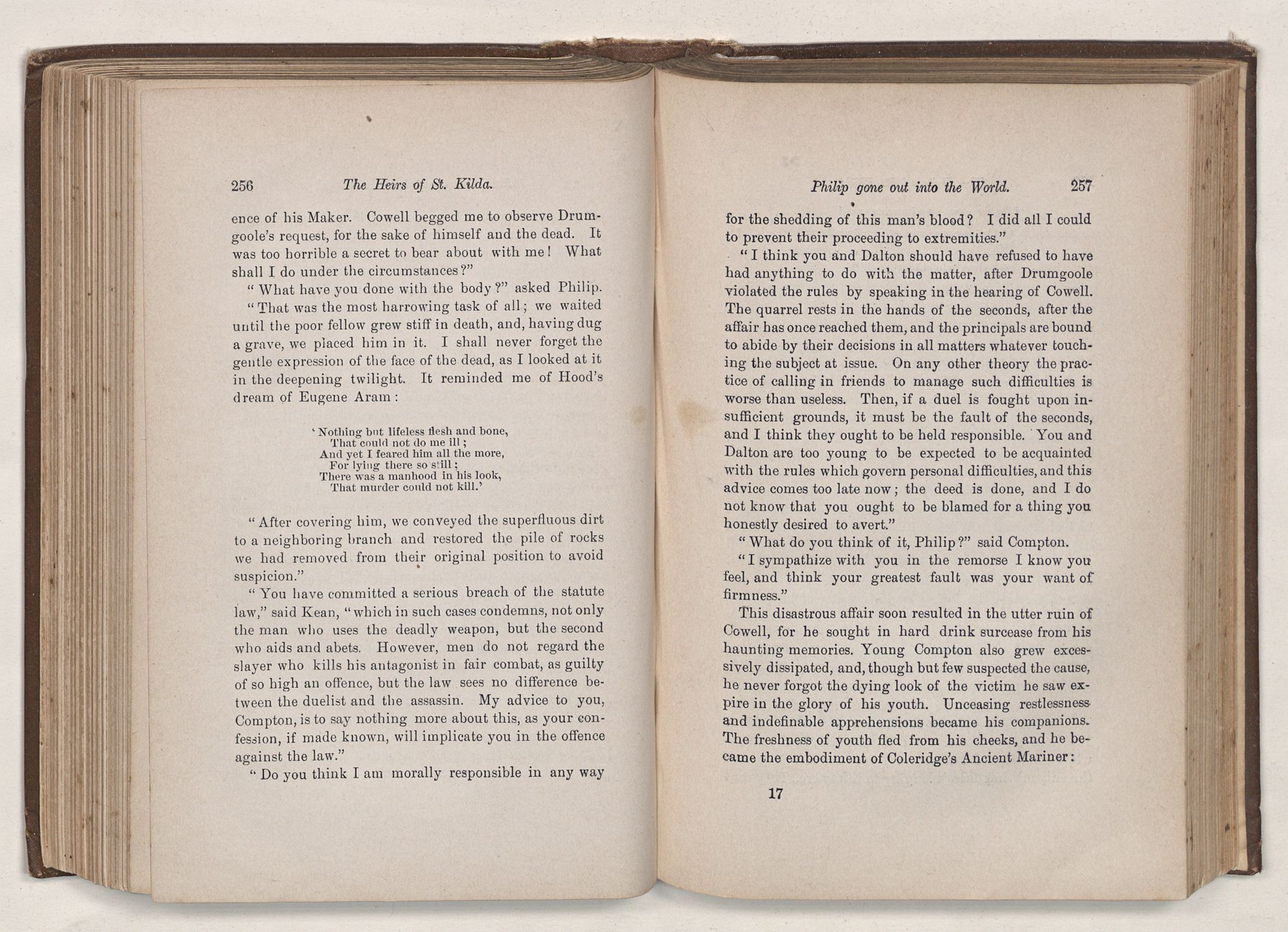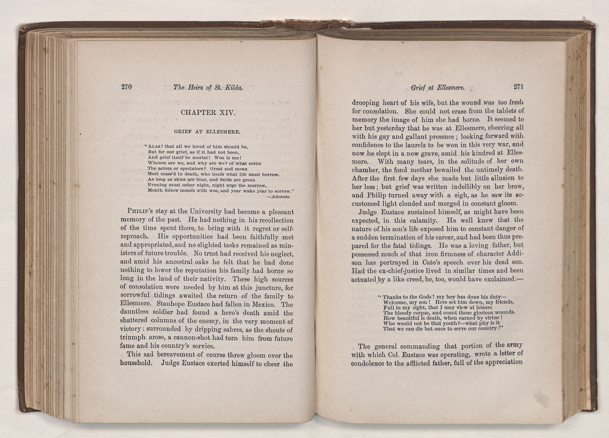 “Fixed figures for the time of scorn“To point a slow unmoving finger at.”This story will be found to contain but little of the real controversy between us and the people who so long and successfully sought our undoing. The effort was made to avoid those memorable differences of opinion, and the author has contented himself with the simple portrayal of Southern men and women as he knew them in the days of their peace and prosperity. The motives controlling such an essay may be, in all modesty, claimed as nobler than the production of a mere love story. It is hoped that the “Heirs of St. Kilda,” will justify the claim that it is a faithful picture of our lost civilization.