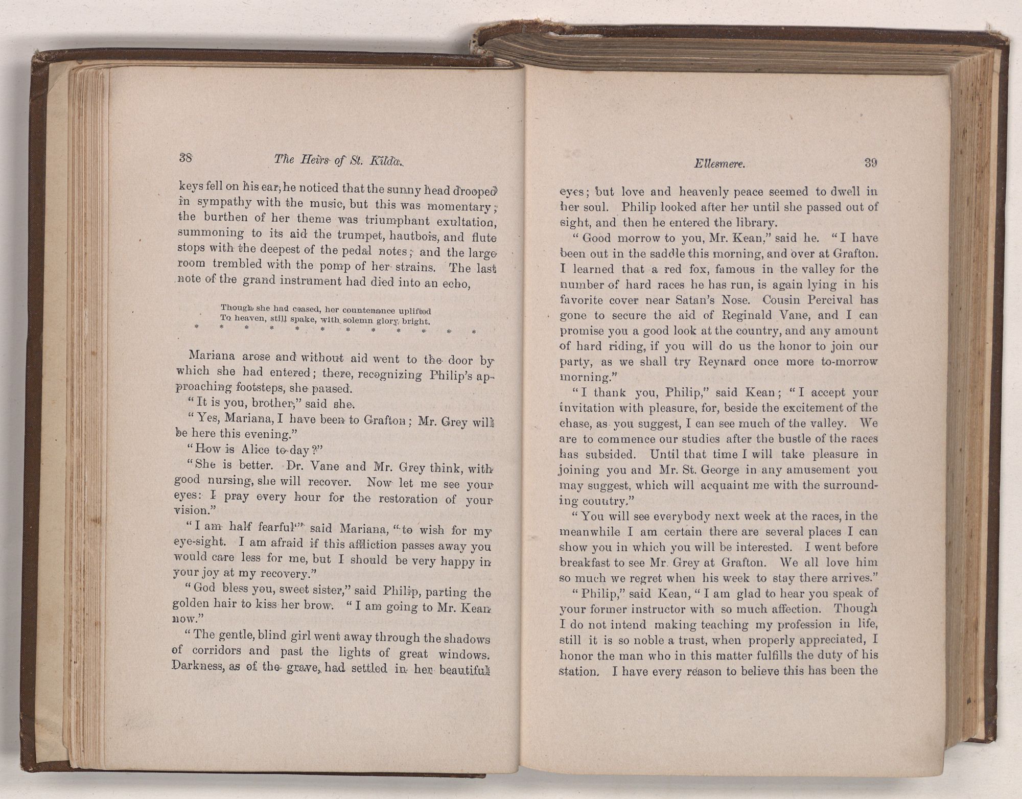 Kean went in the direction of the music and found the parties in one of a suit of elegant drawing rooms. He took his seat by Miss Somerville, and when Mariana and St. George had finished their duet - "Home to our mountains" - Ida remarked: