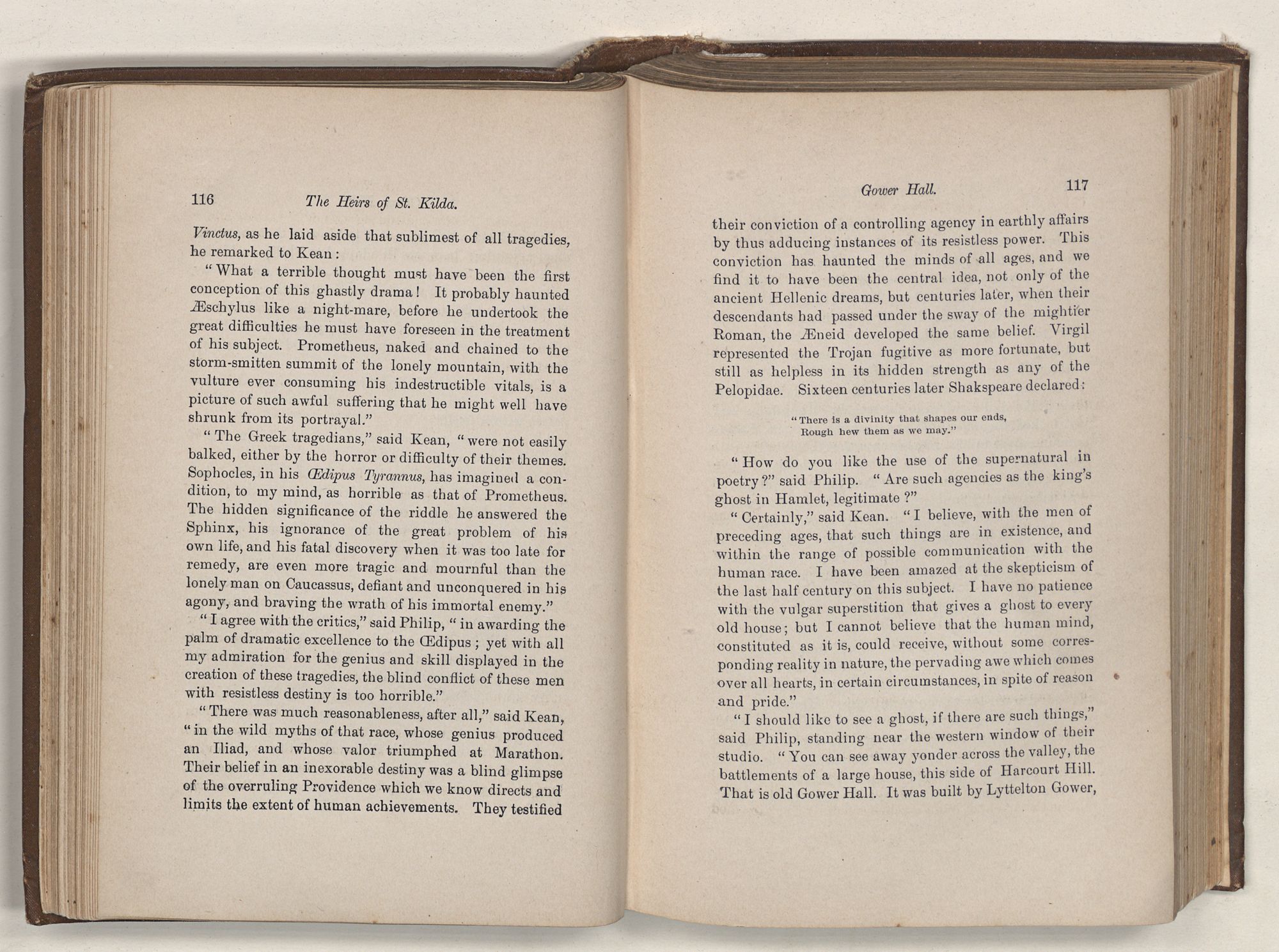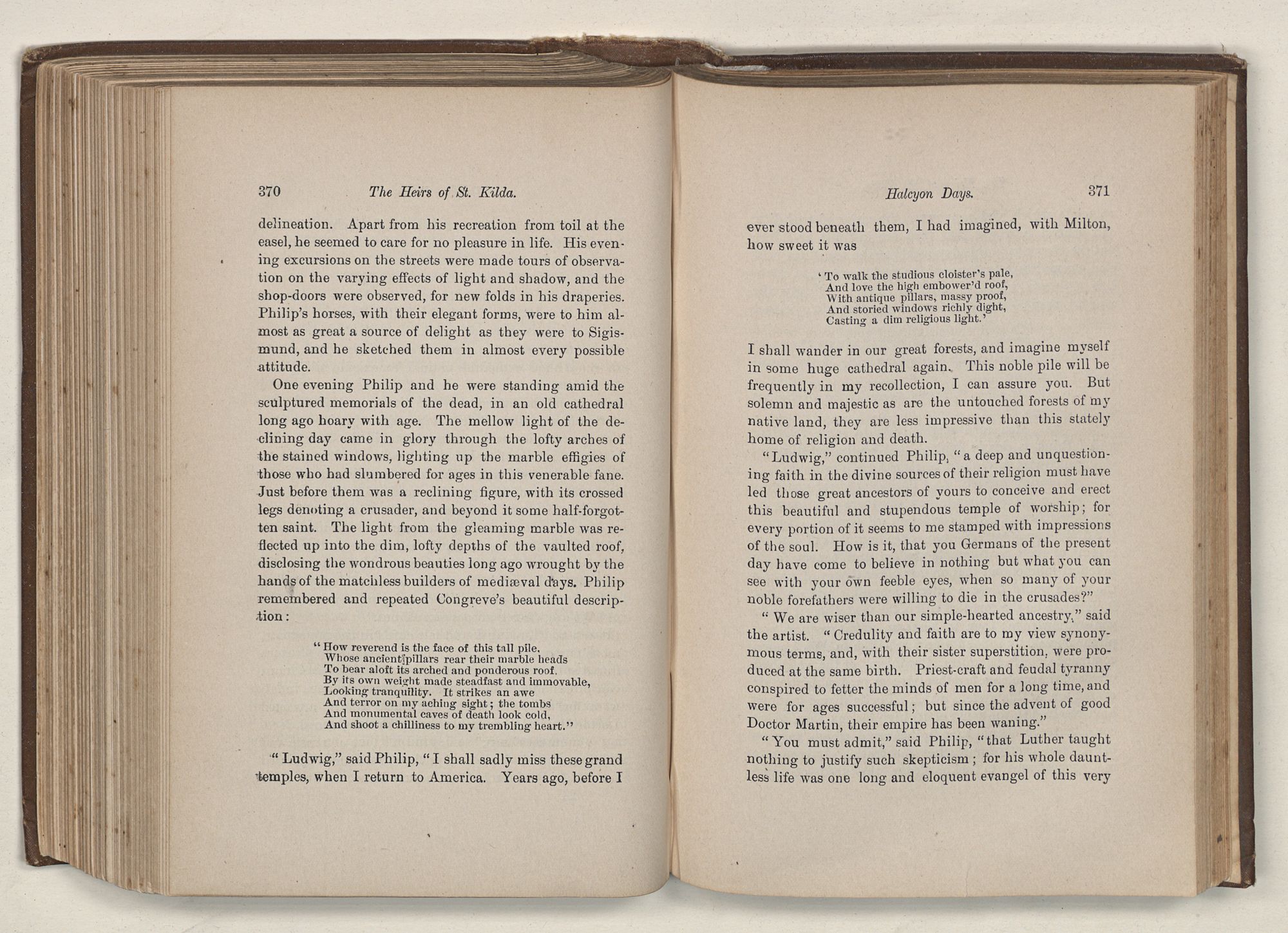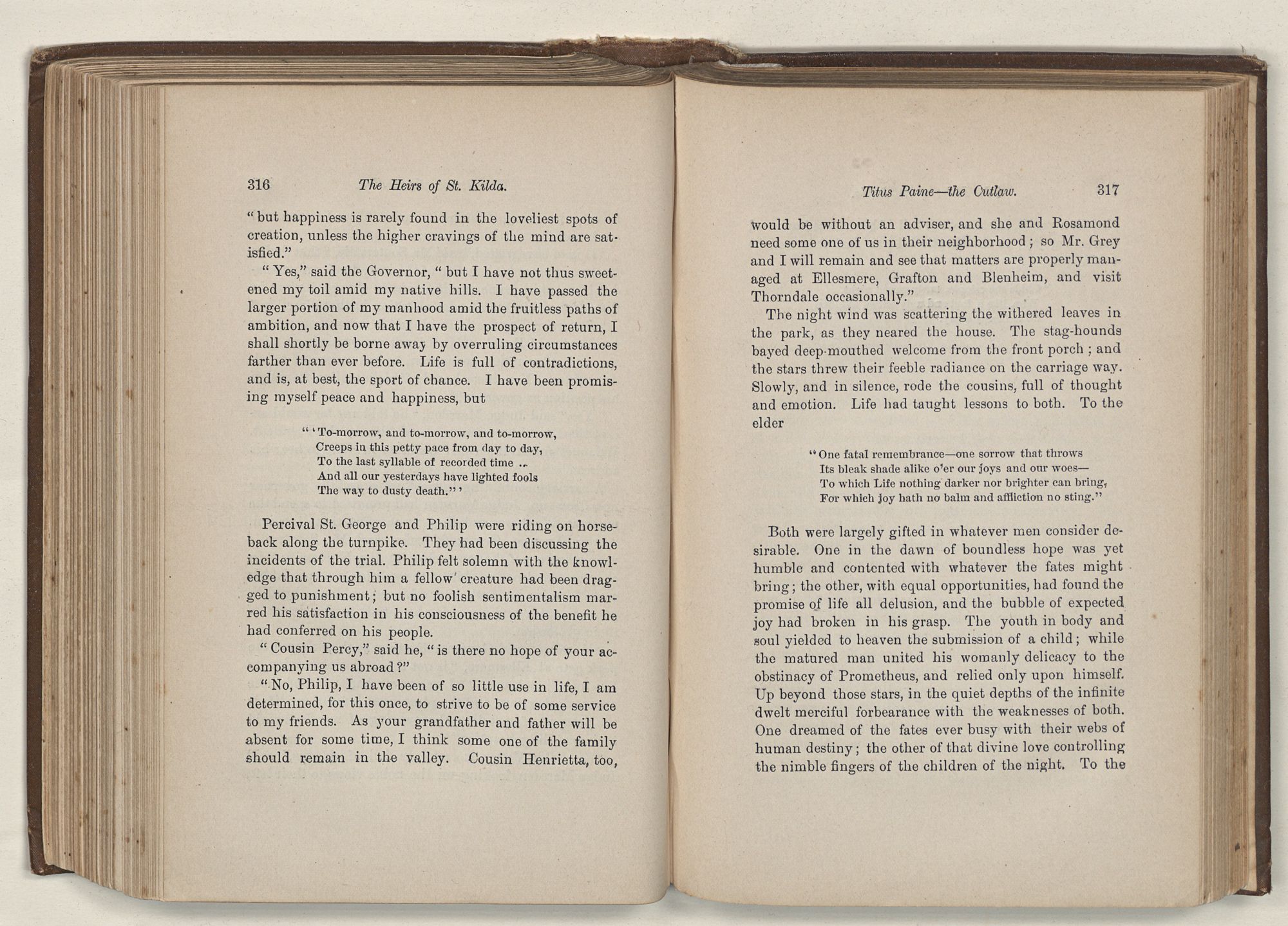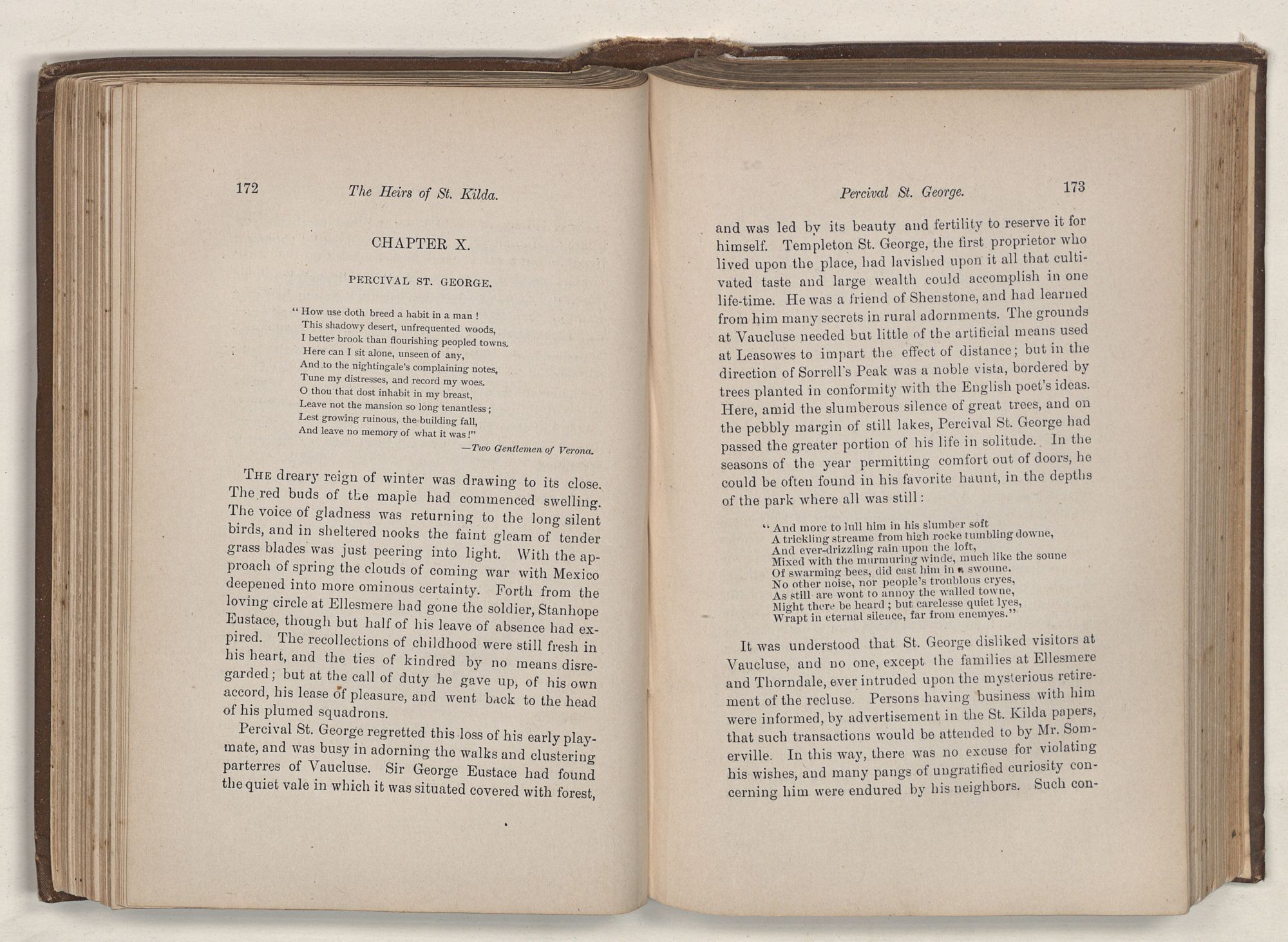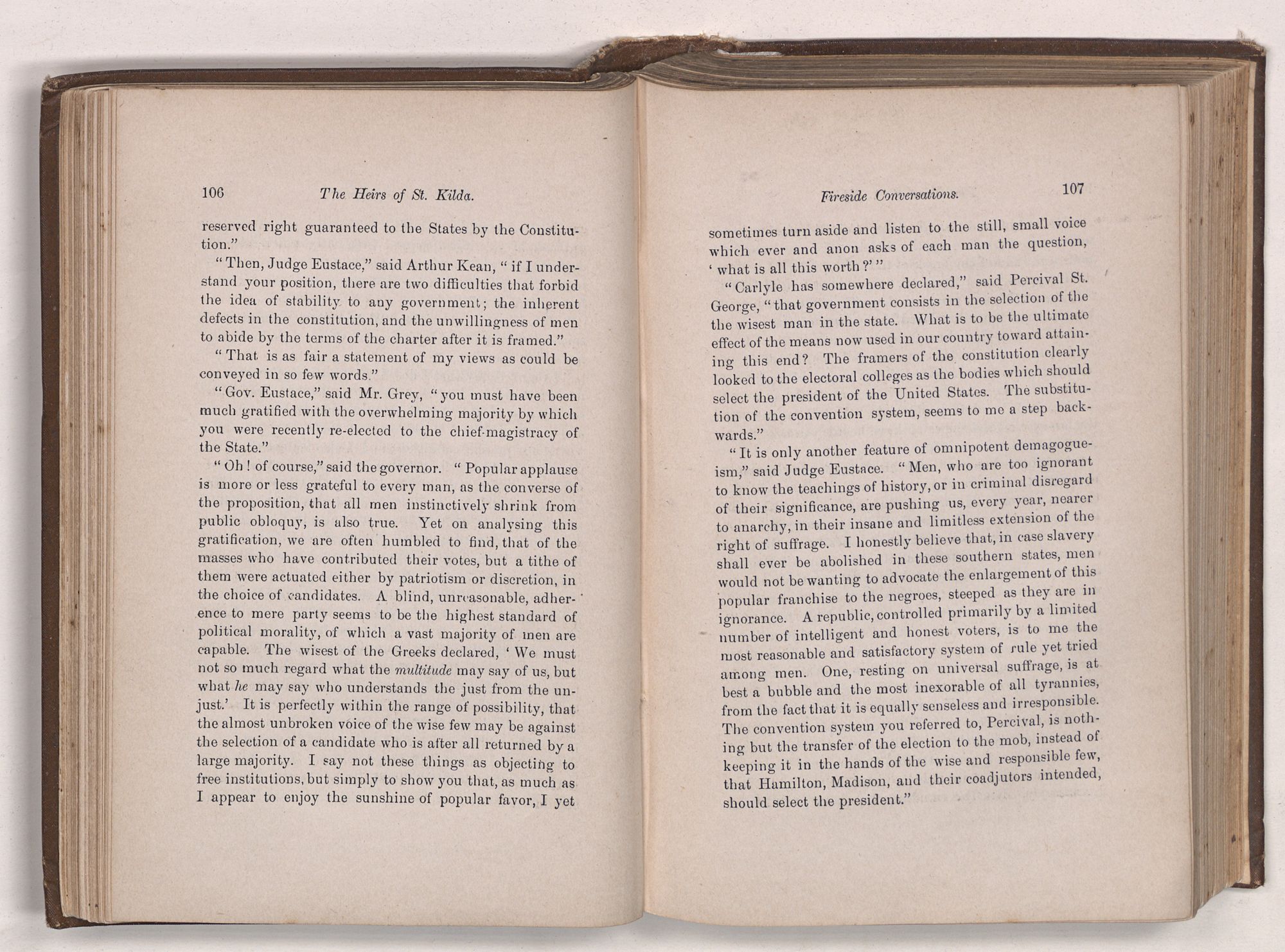 In the elaboration of the structure, the ordinary resources of the literary artist were found insufficient, and unusual agencies have been invoked to fill out the canvas. Many novel readers will be doubtless shocked at the introduction of Gov. Eustace’s valedictory, but the burden of his discourse contained so much of themes then filling the popular mind that their omission would have marred the completeness of the exposition. The nature of the plot and the customs of wealthy people required the removal of the leading character from the earlier scenes. It was said by Edmund Spenser