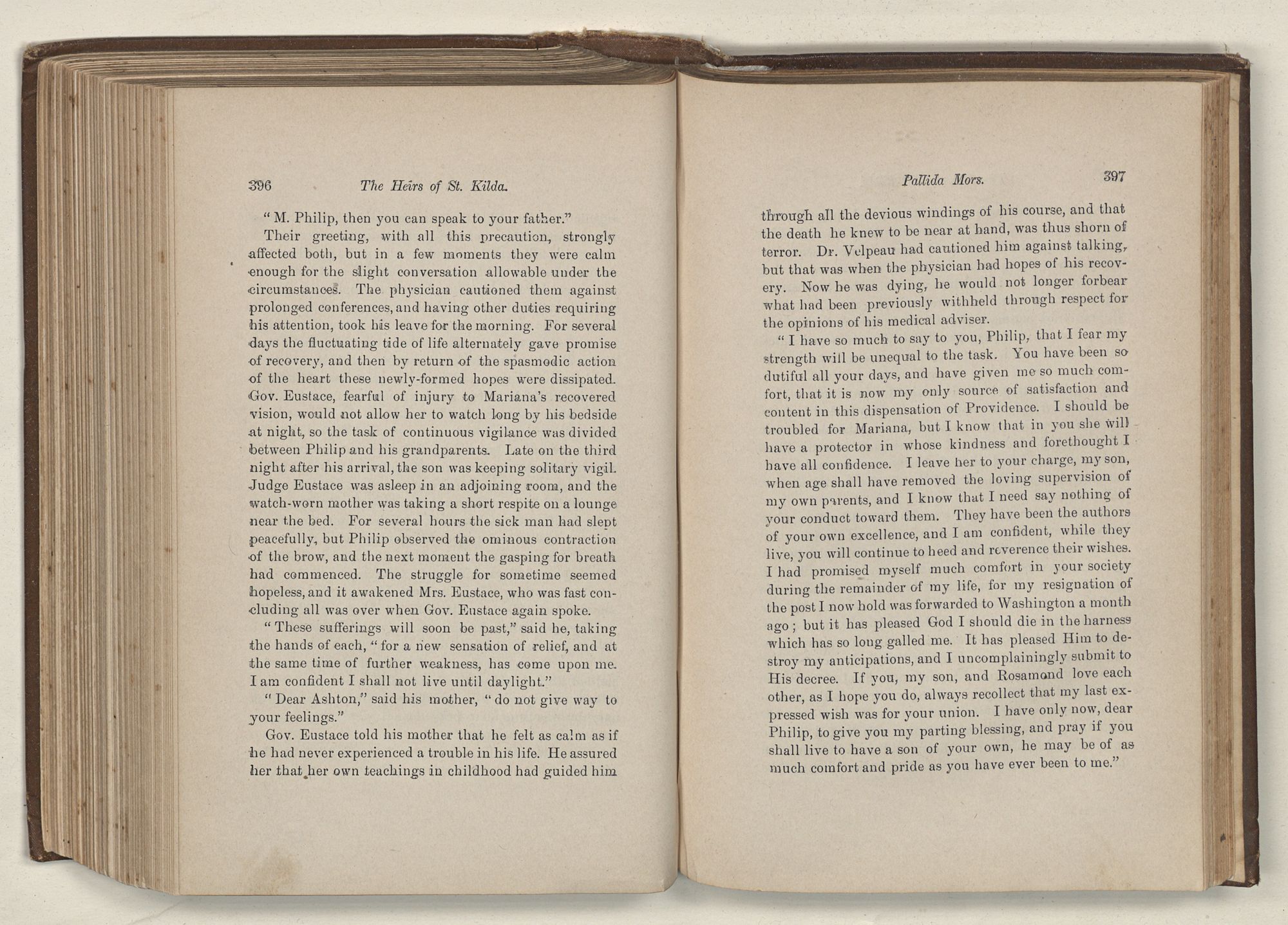 "Arthur Kean," said the Judge, "I am no fatalist, but there seems some dreadful curse hanging over our house for the last quarter of a century. My own wedded life, thank God, has been thrice blessed, but my dearest friends have been singularly unfortunate. My oldest son lost his lovely young wife soon after his marriage. Mrs. Courtenay was a widow in less than a year from her bridals. Percy did not even become a bridegroom before he was a widower, and Stanhope, though I have frequently urged him to leave the army and marry, yet broods over a jilting at the hands of a heartless coquette he has not seen in ten years. My dear sir, you can now appreciate my anxiety as to training Philip. I wish to arm him against these morbid tendencies which are threatening to extinguish the name of Eustace in the St. Kilda Valley.