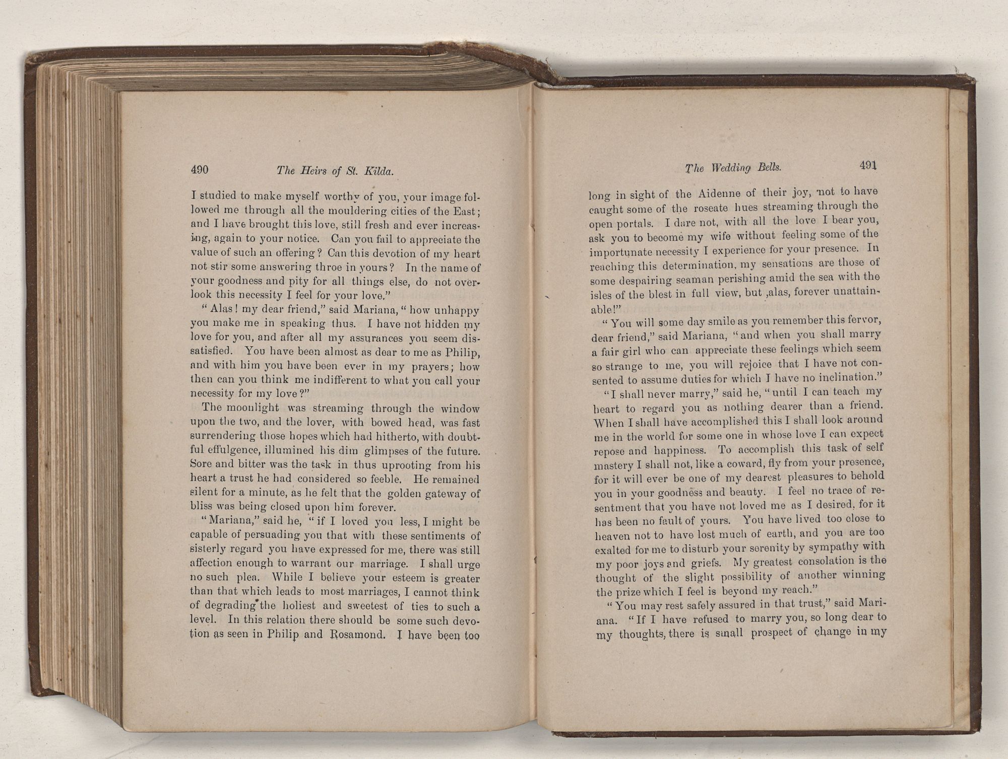 "Mariana," said he, "if I loved you less, I might be capable of persuading you that with those sentiments of sisterly regard you have expressed for me, there was still affection enough to warrant our marriage. I shall urge no such plea. While I believe your esteem is greater than that which leads to most marriages, I cannot think of degrading the holiest and sweetest of ties to such a level. In this relation there should be some such devotion as seen in Philip and Rosamond. I have been too