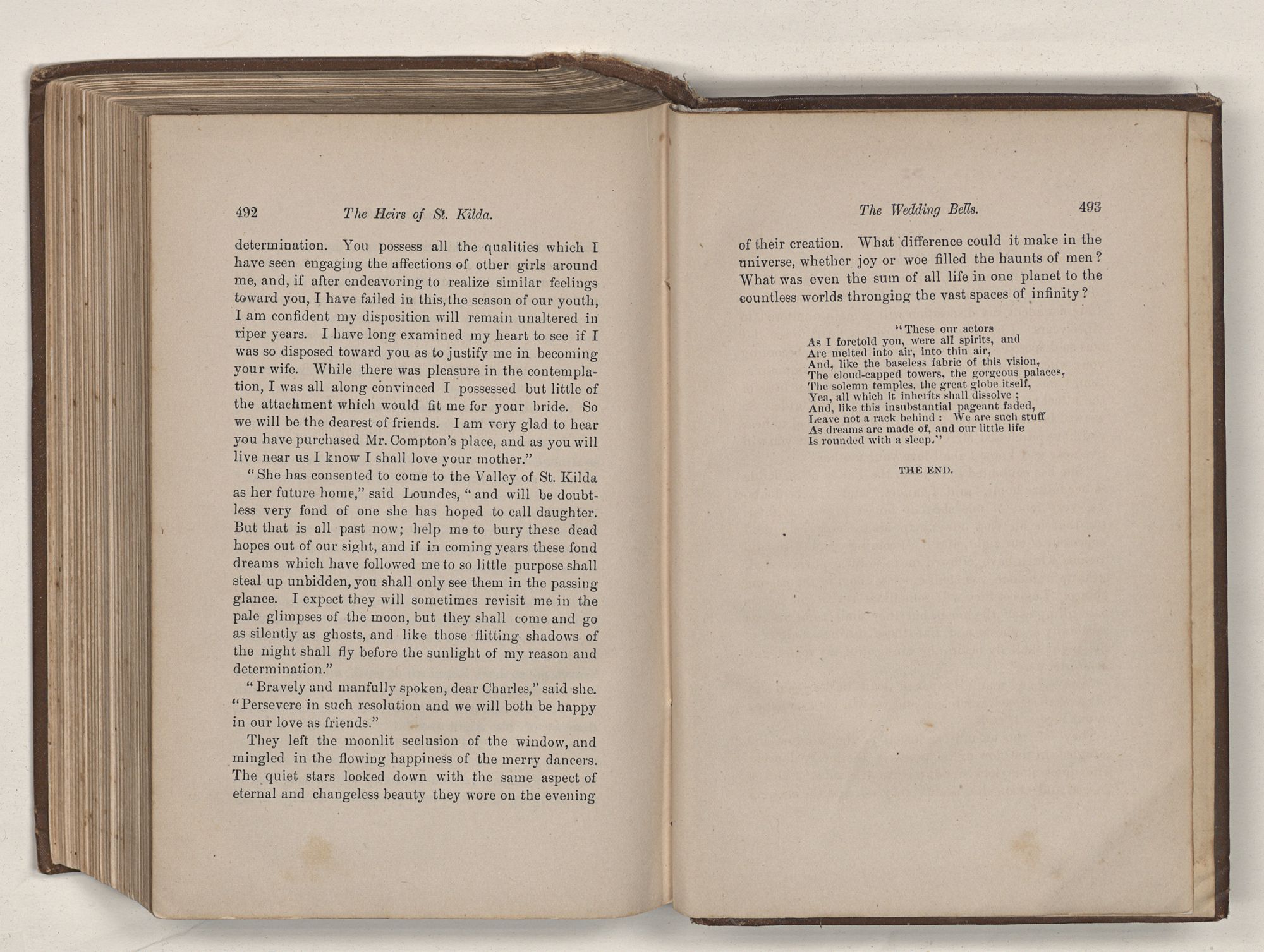 "These our actorsAs I foretold you, were all spirits, andAre melted into air, into thin air,And, like the baseless fabric of this vision,The cloud-capped towers, the gorgeous palaces,The solemn temples, the great globe itself,Yea, all which it inherits shall dissolve;And, like this insubstantial pageant faded,Leave not a rack behind: We are such stuffAs dreams are made of, and our little lifeIs rounded with a sleep."THE END.