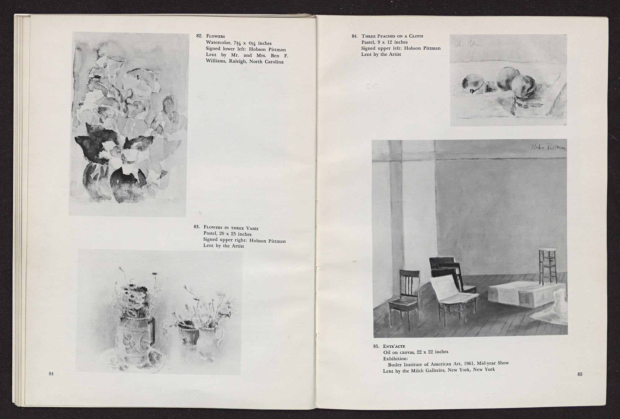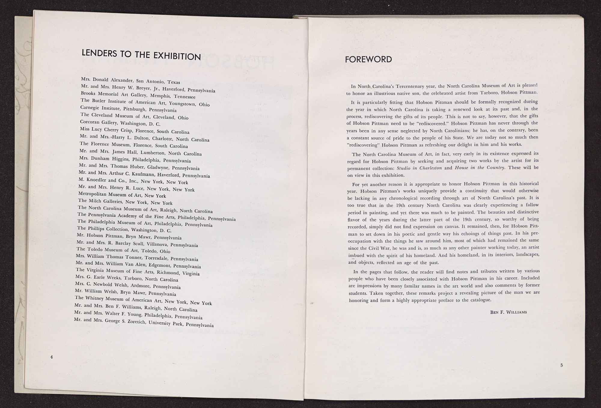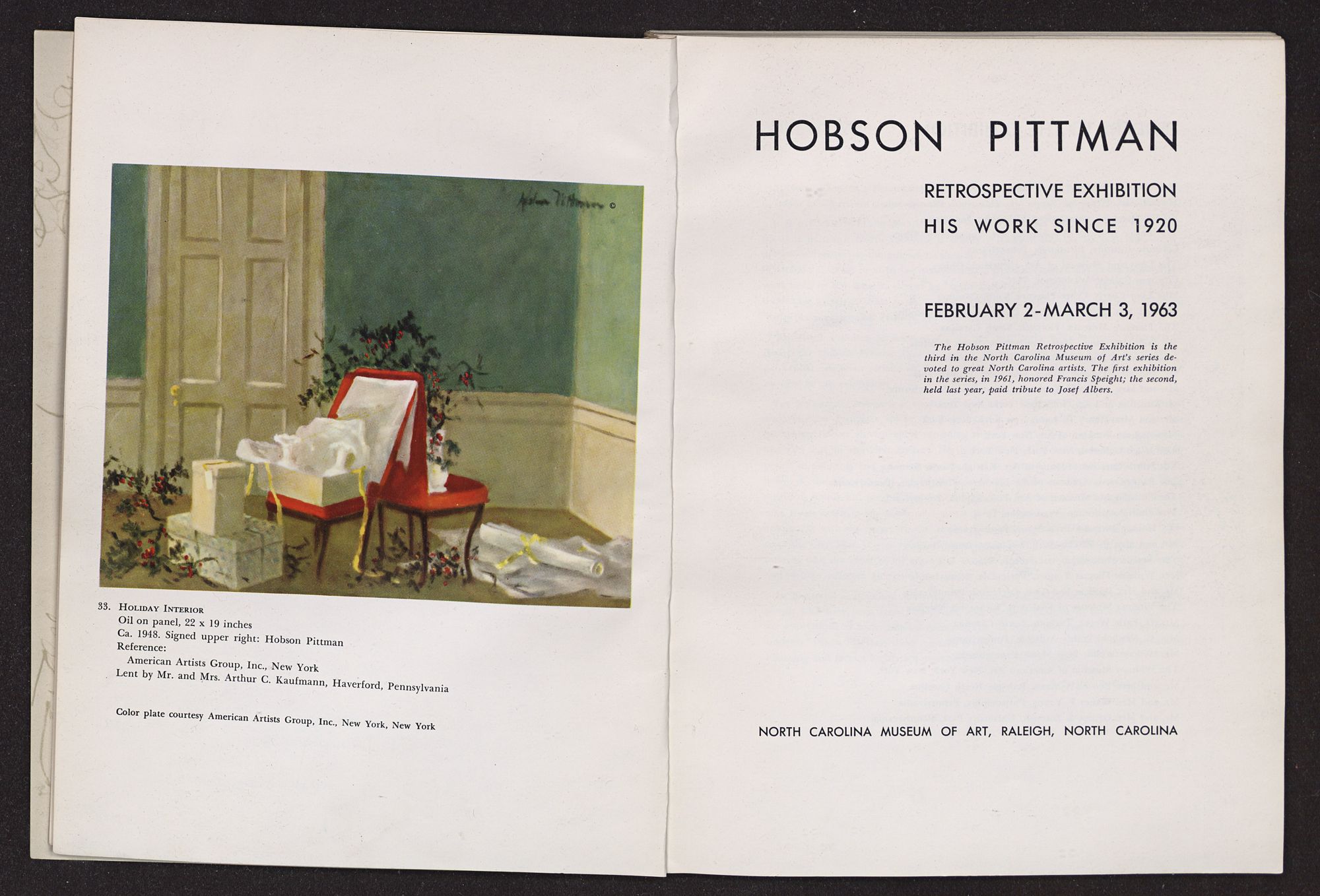 HOBSON PITTMANRETROSPECTIVE EXHIBITION HIS WORK SINCE 1920FEBRUARY 2-MARCH 3, 1963 The Hobson Pittman Retrospective Exhibition is the third in the North Carolina Museum of Art's series devoted to great North Carolina artists. The first exhibition in the series, in 1961, honored Francis Speight; the second, held last year, paid tribute to Josef Albers.NORTH CAROLINA MUSEUM OF ART, RALEIGH,NORTH CAROLINALENDERS TO THE EXHIBITION