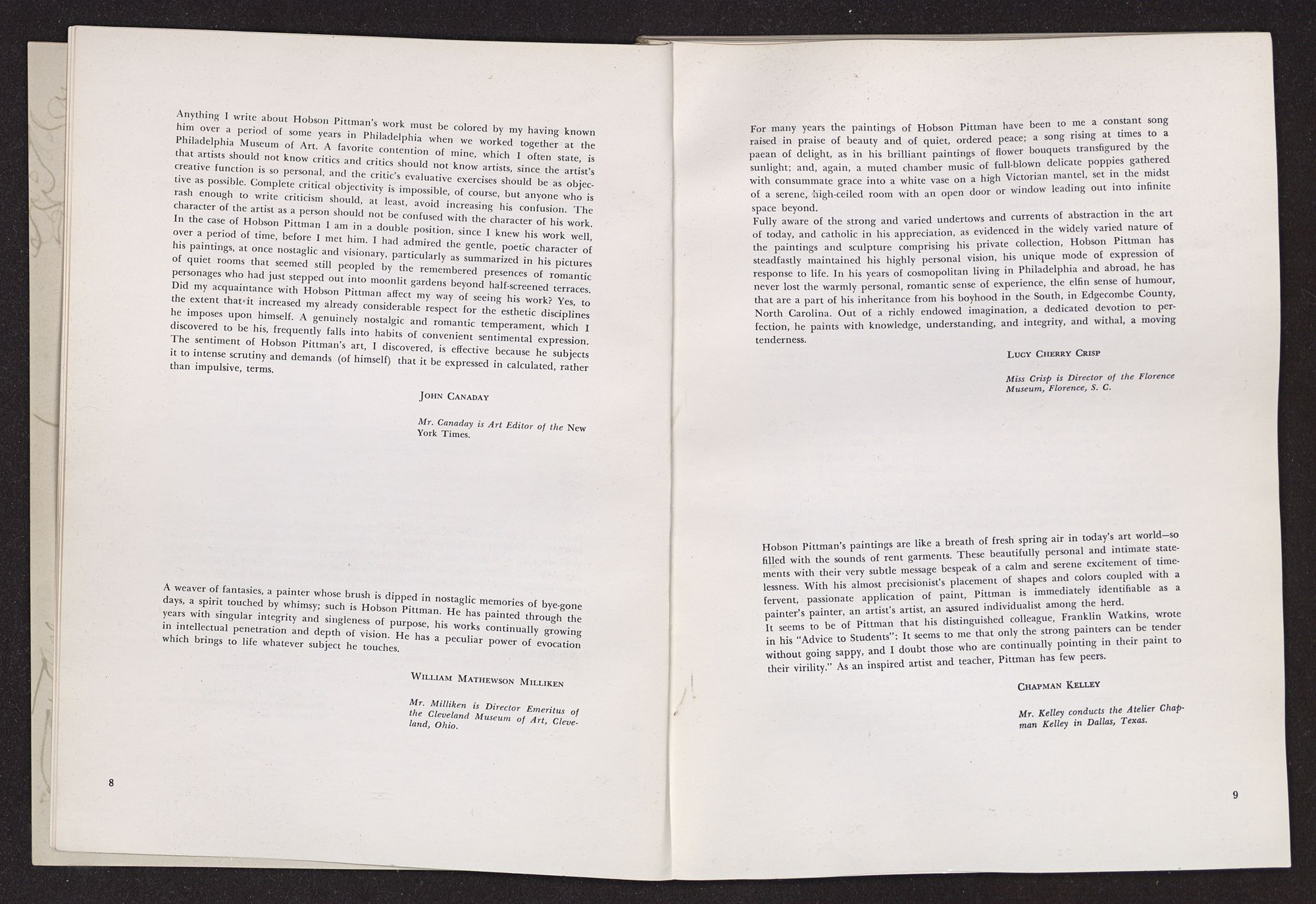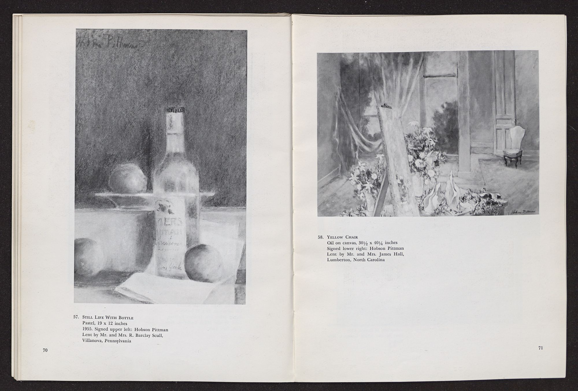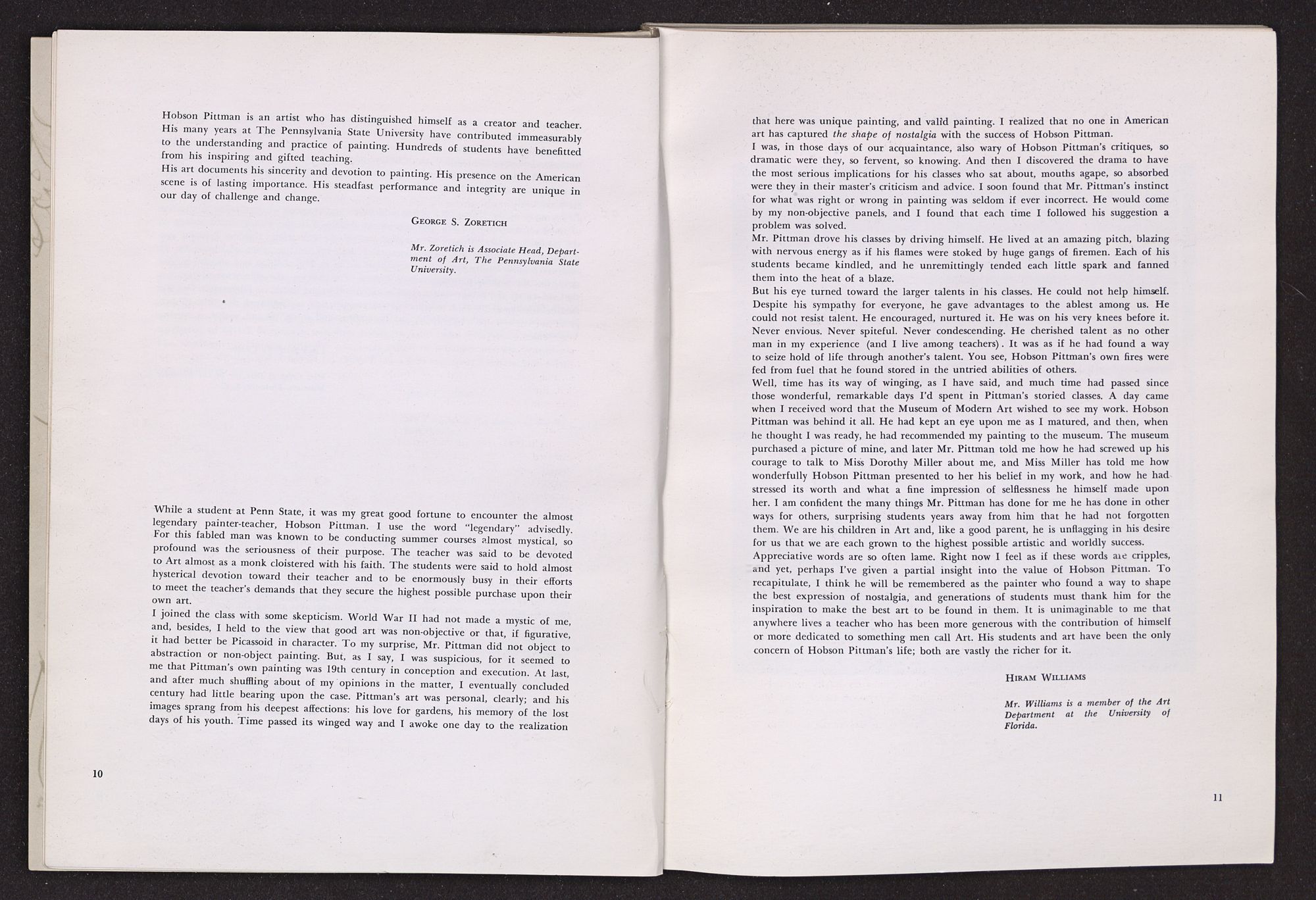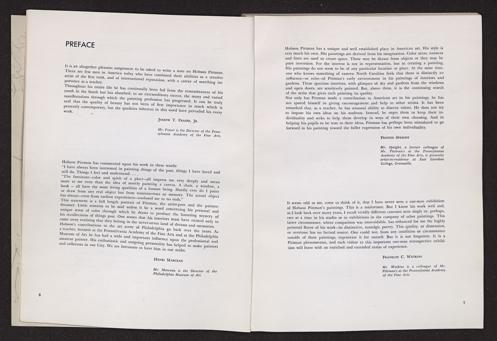 In the pages that follow, the reader will find notes and tributes written by various people who have been closely associated with Hobson Pittman in his career. Included are impressions by many familar names in the art world and also comments by former students. Taken together, these remarks project a revealing picture of the man we are honoring and form a highly appropriate preface to the catalogue.