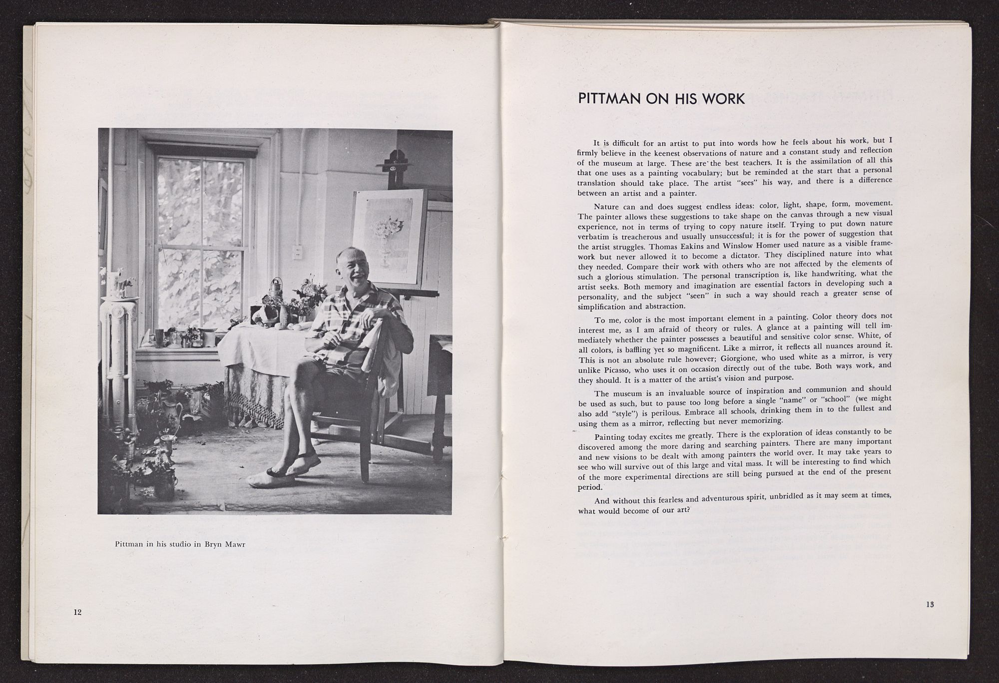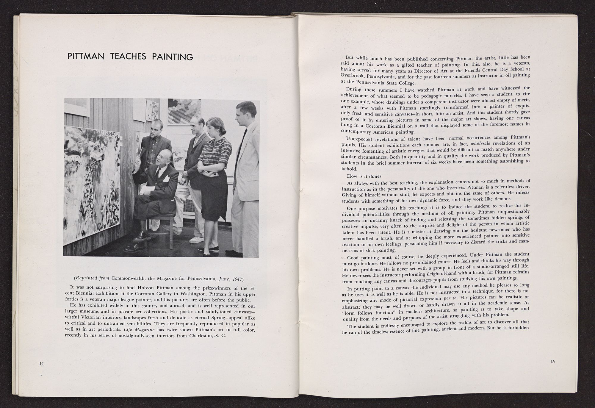 Not only has Pittman made a contribution to American art in his paintings, he has not spared himself in giving encouragement and help to other artists. It has been remarked that, as a teacher, he has unusual ability to discern talent. He does not try to impose his own ideas on his students. Instead, he urges them to keep their individuality and seeks to help them develop in ways of their own choosing. And in helping his pupils to be true to their ideas, Pittman has perhaps been stimulated to go forward in his painting toward the fuller expression of his own individuality.