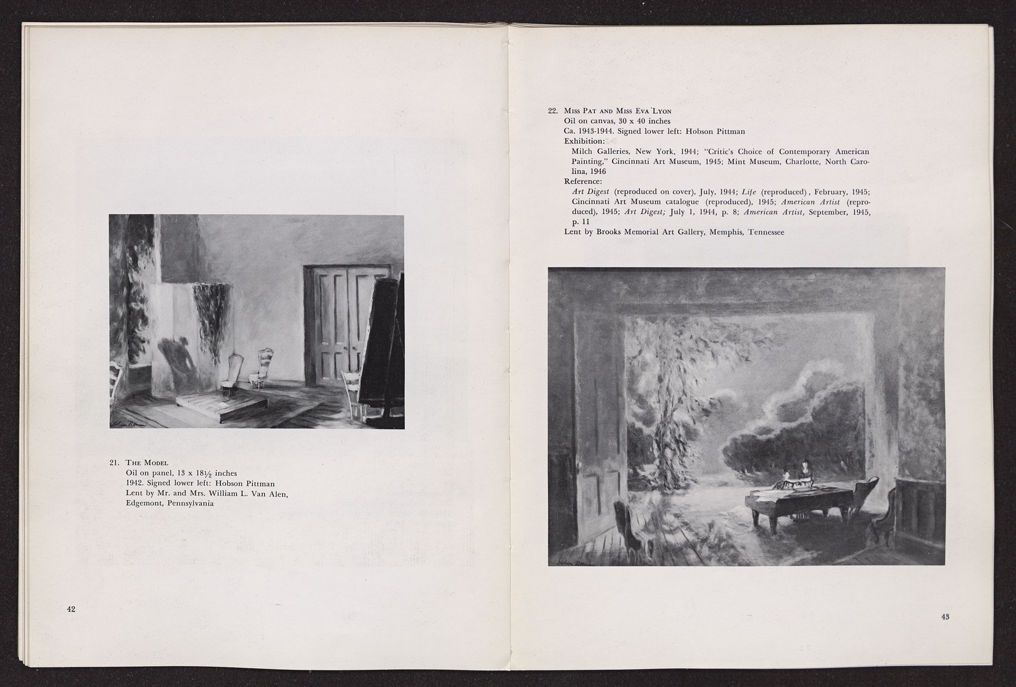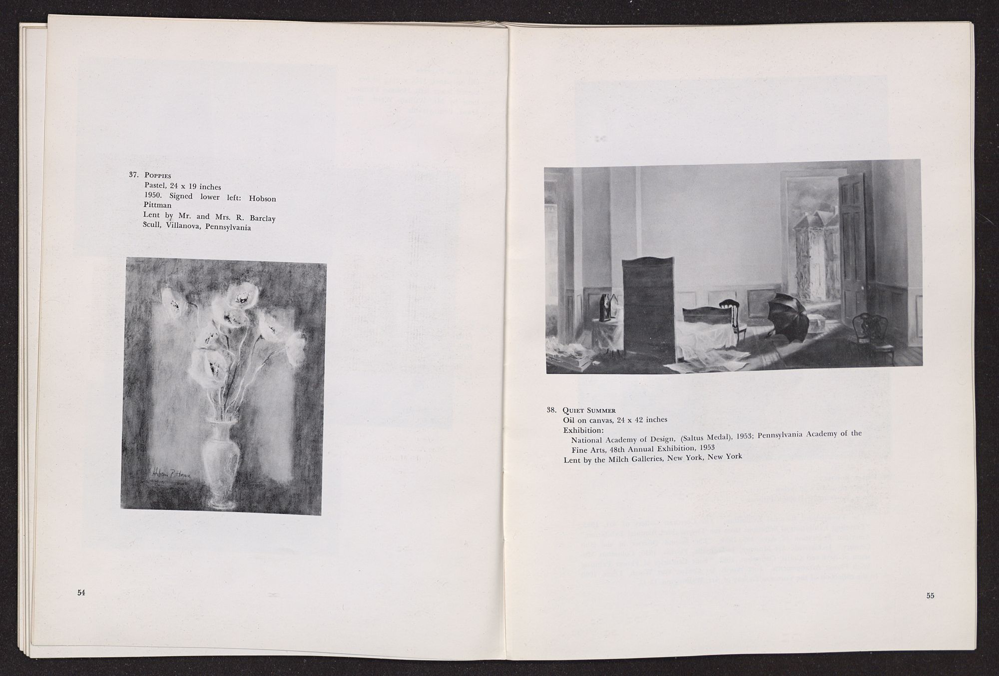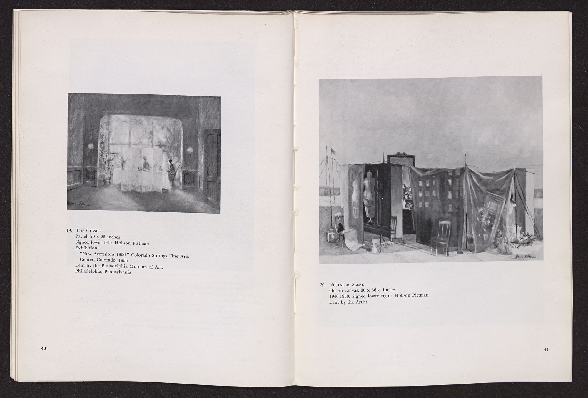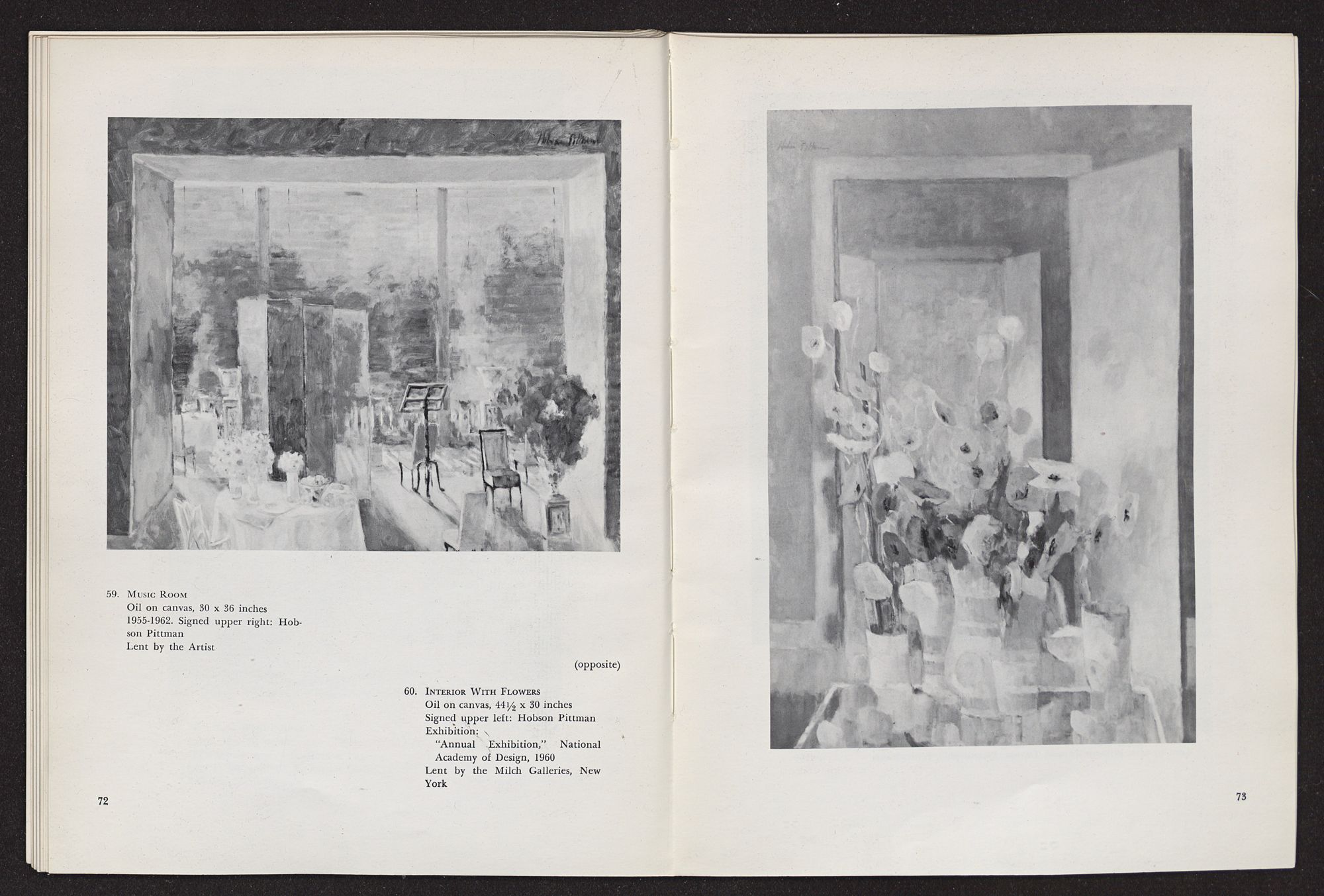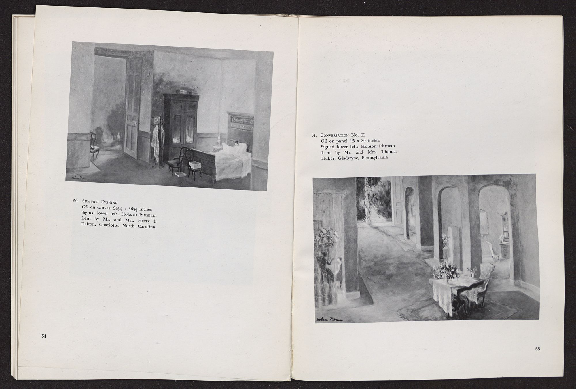 Anything I write about Hobson Pittman's work must be colored by my having known him over a period of some years in Philadelphia when we worked together at the Philadelphia Museum of Art. A favorite contention of mine, which I often state, is that artists should not know critics and critics should not know artists, since the artist's creative function is so personal, and the critic's evaluative exercises should be as objective as possible. Complete critical objectivity is impossible, of course, but anyone who is rash enough to write criticism should, at least, avoid increasing his confusion. The character of the artist as a person should not be confused with the character of his work. In the case of Hobson Pittman I am in a double position, since I knew his work well, over a period of time, before I met him. I had admired the gentle, poetic character of his paintings, at once nostaglic and visionary, particularly as summarized in his pictures of quiet rooms that seemed still peopled by the remembered presences of romantic personages who had just stepped out into moonlit gardens beyond half-screened terraces. Did my acquaintance with Hobson Pittman affect my way of seeing his work? Yes, to the extent that it increased my already considerable respect for the esthetic disciplines he imposes upon himself. A genuinely nostalgic and romantic temperament, which I discovered to be his, frequently falls into habits of convenient sentimental expression. The sentiment of Hobson Pittman's art, I discovered, is effective because he subjects it to intense scrutiny and demands (of himself) that it be expressed in calculated, rather than impulsive, terms.