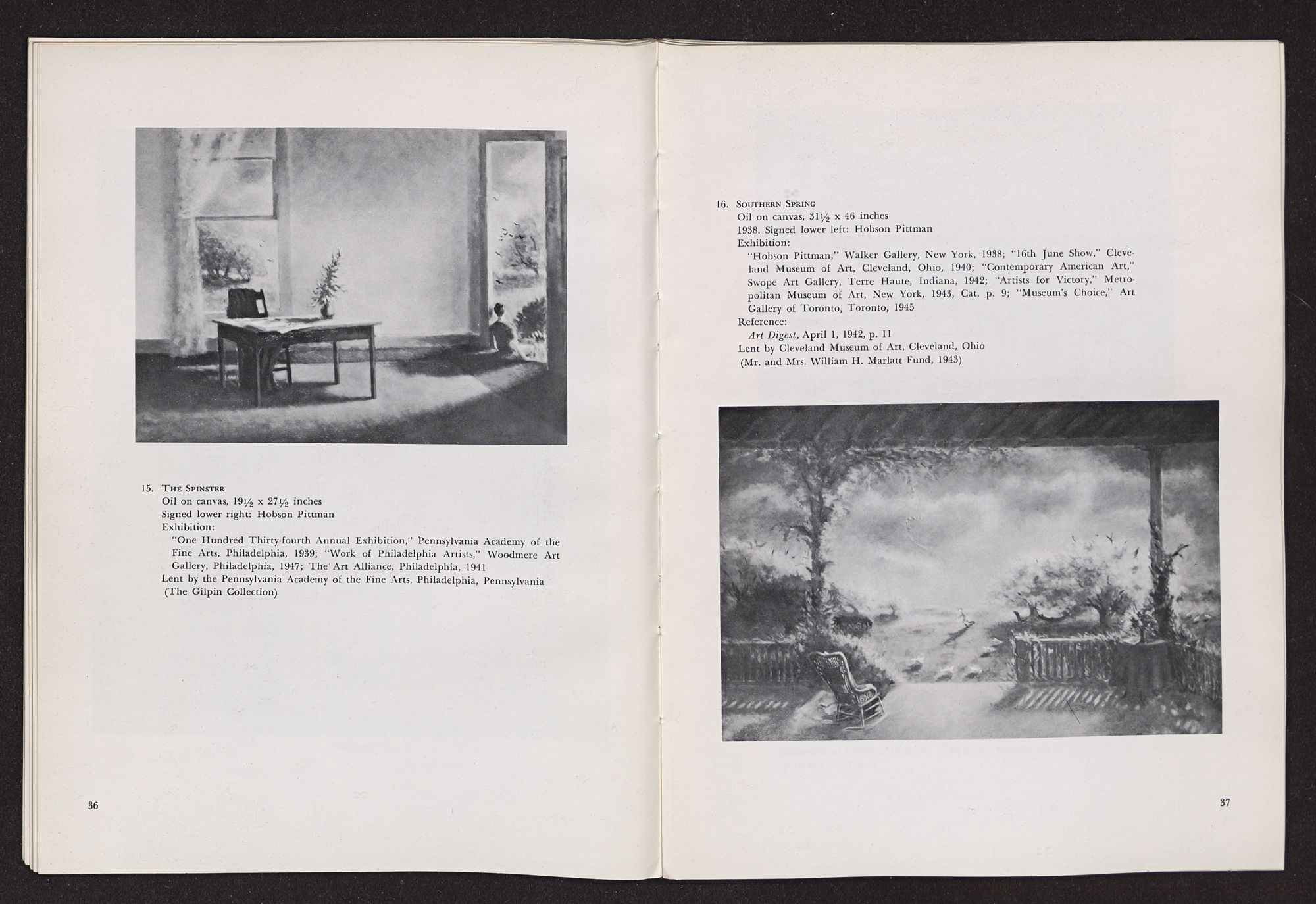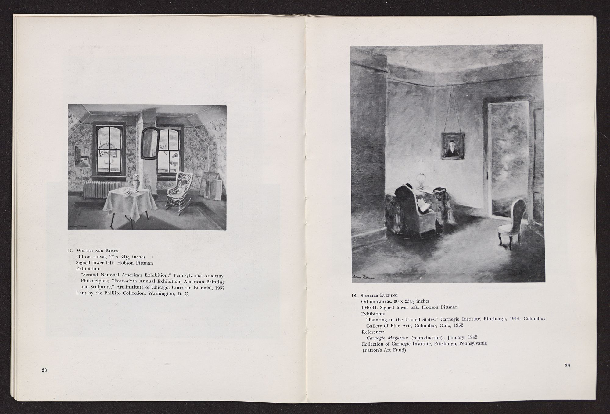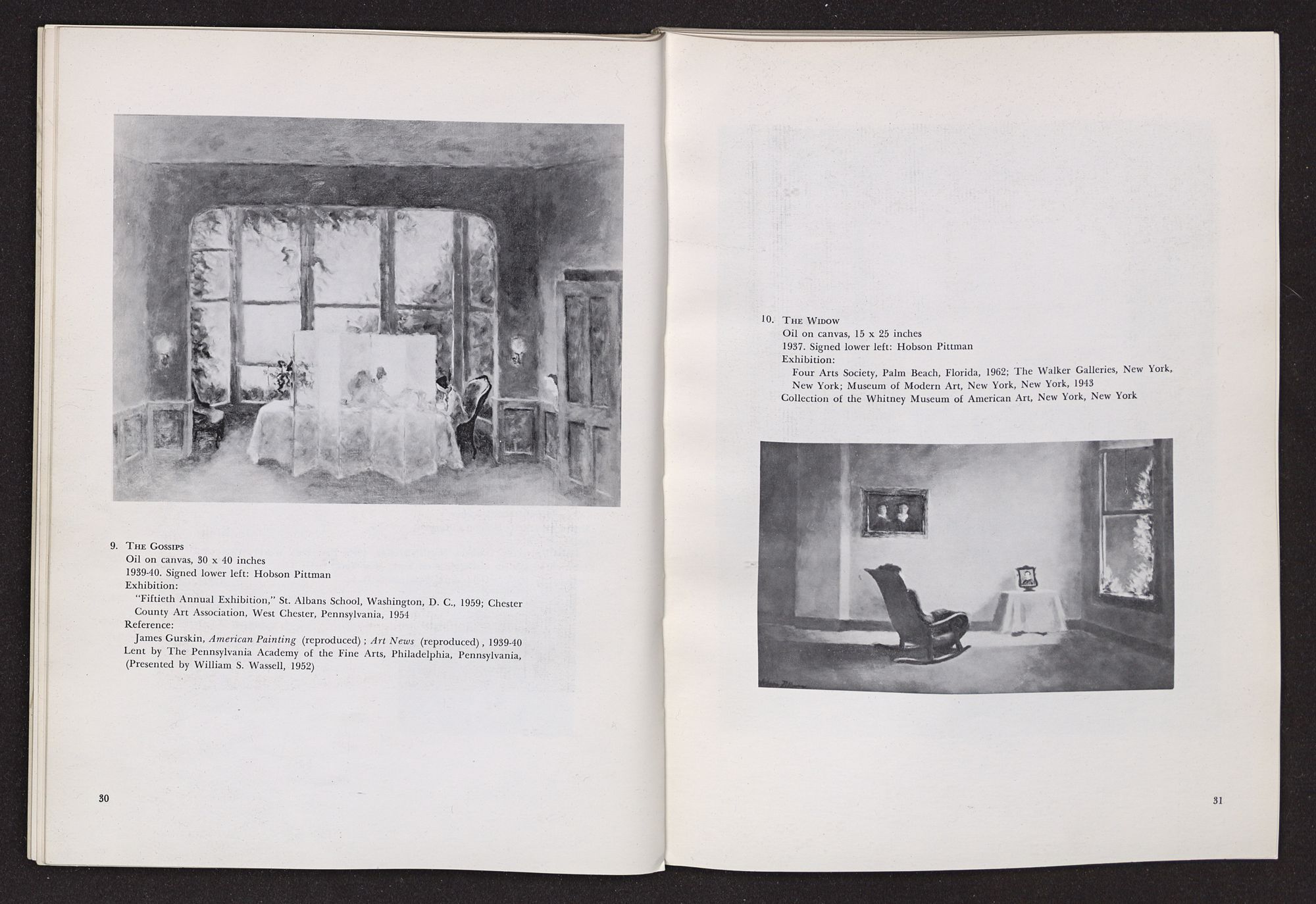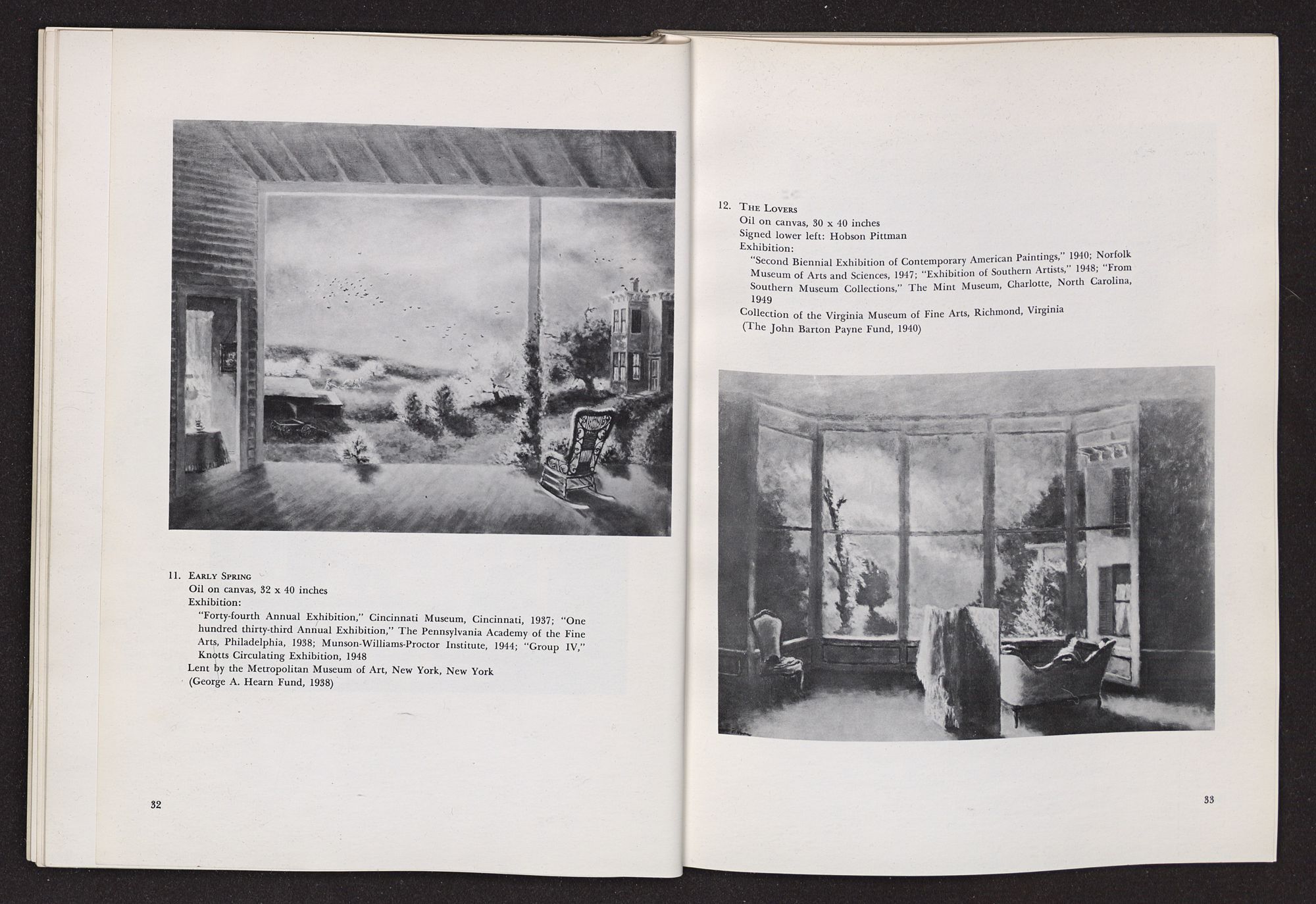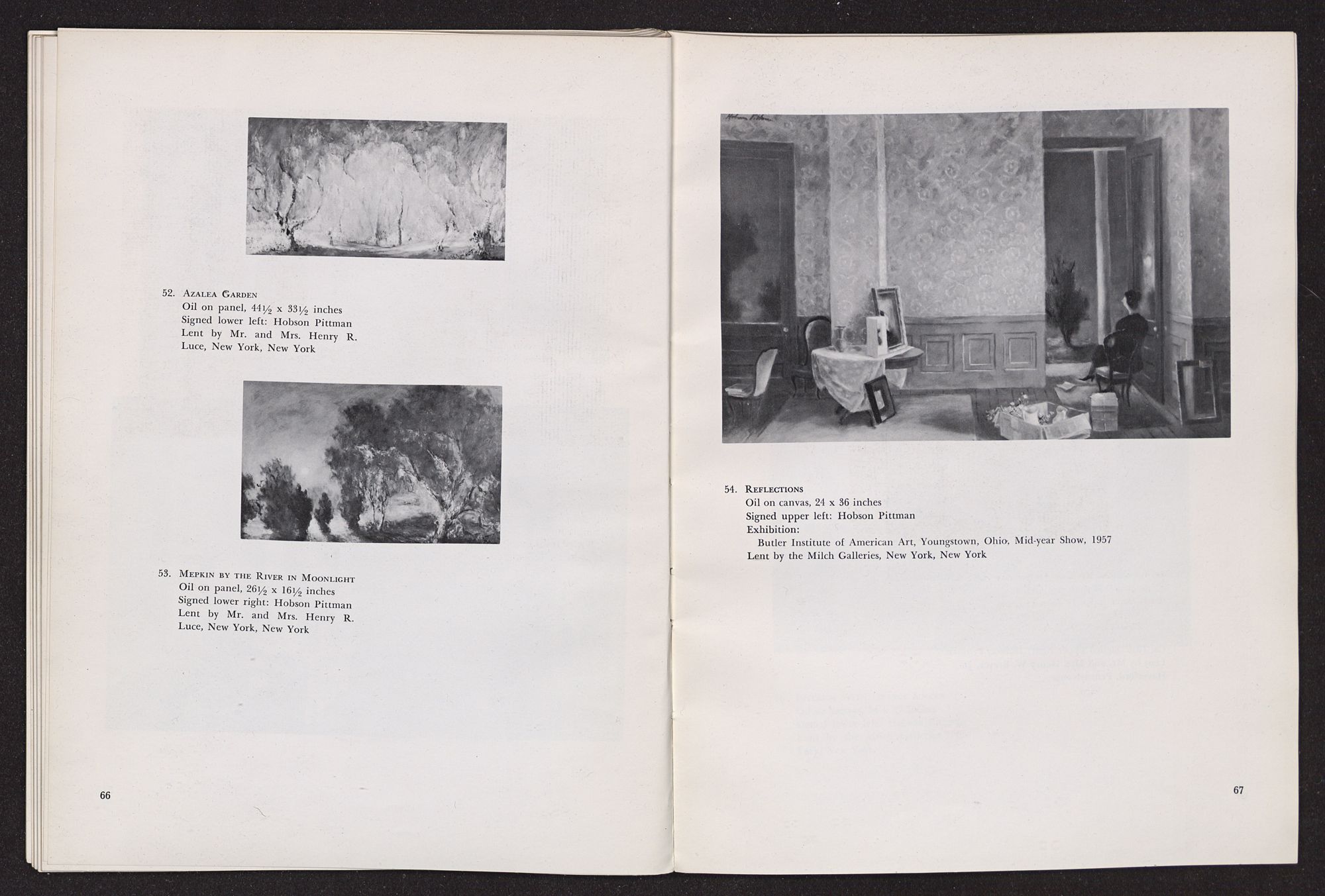 Anything I write about Hobson Pittman's work must be colored by my having known him over a period of some years in Philadelphia when we worked together at the Philadelphia Museum of Art. A favorite contention of mine, which I often state, is that artists should not know critics and critics should not know artists, since the artist's creative function is so personal, and the critic's evaluative exercises should be as objective as possible. Complete critical objectivity is impossible, of course, but anyone who is rash enough to write criticism should, at least, avoid increasing his confusion. The character of the artist as a person should not be confused with the character of his work. In the case of Hobson Pittman I am in a double position, since I knew his work well, over a period of time, before I met him. I had admired the gentle, poetic character of his paintings, at once nostaglic and visionary, particularly as summarized in his pictures of quiet rooms that seemed still peopled by the remembered presences of romantic personages who had just stepped out into moonlit gardens beyond half-screened terraces. Did my acquaintance with Hobson Pittman affect my way of seeing his work? Yes, to the extent that it increased my already considerable respect for the esthetic disciplines he imposes upon himself. A genuinely nostalgic and romantic temperament, which I discovered to be his, frequently falls into habits of convenient sentimental expression. The sentiment of Hobson Pittman's art, I discovered, is effective because he subjects it to intense scrutiny and demands (of himself) that it be expressed in calculated, rather than impulsive, terms.