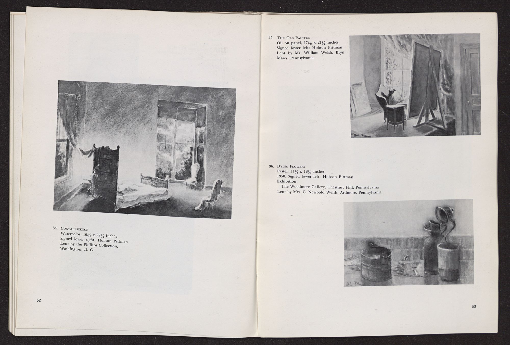 This statement is a full length portrait of Pittman, the artist-poet and the painter-dreamer. Little remains to be said unless it be a word concerning his personal and unique sense of color through which he draws to produce the haunting mystery of his recollections of things past. One senses that his interiors must have existed only to come away realizing that they belong in the never-never land of dreams and memories.