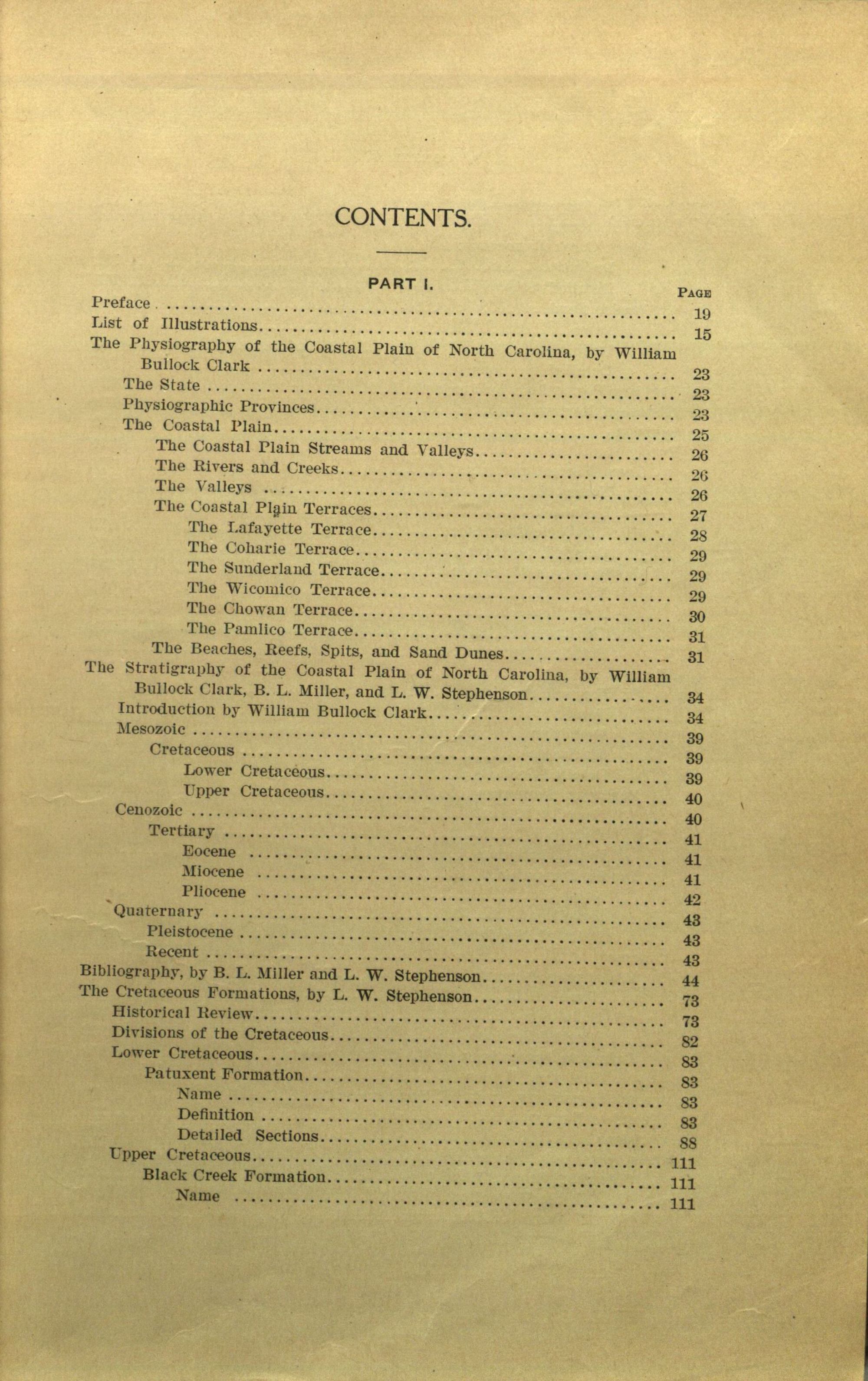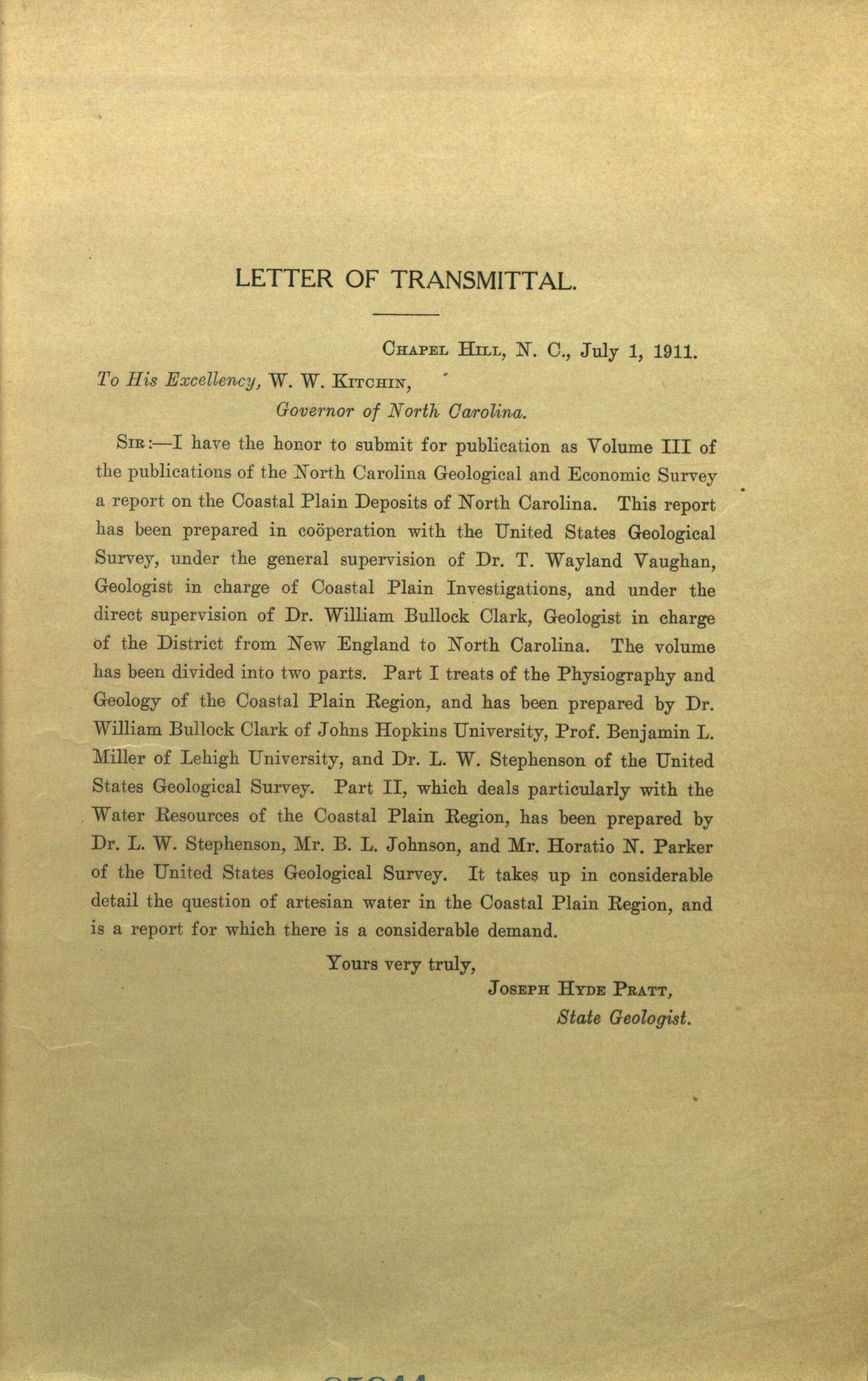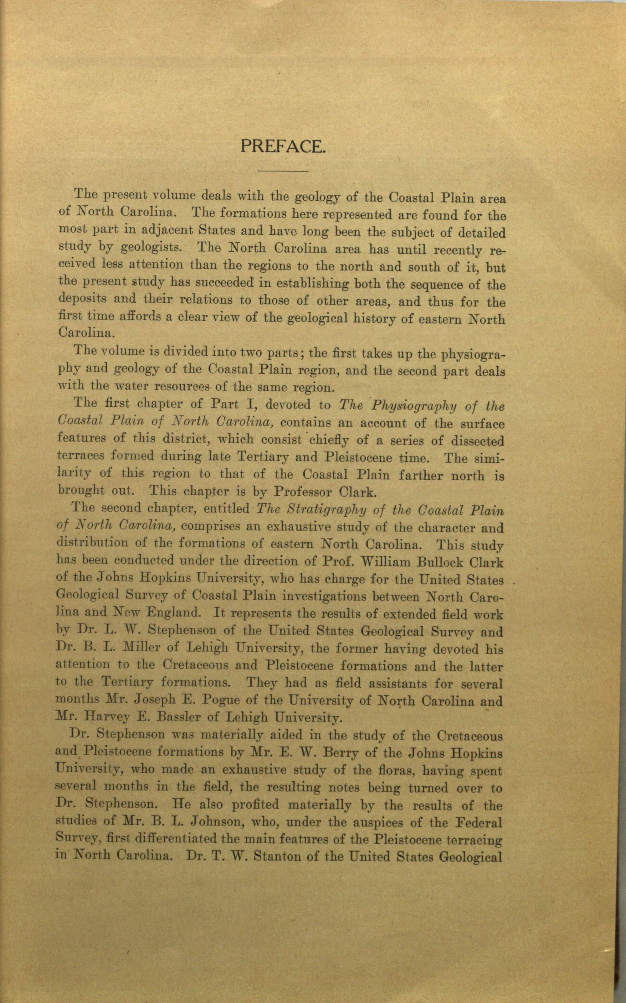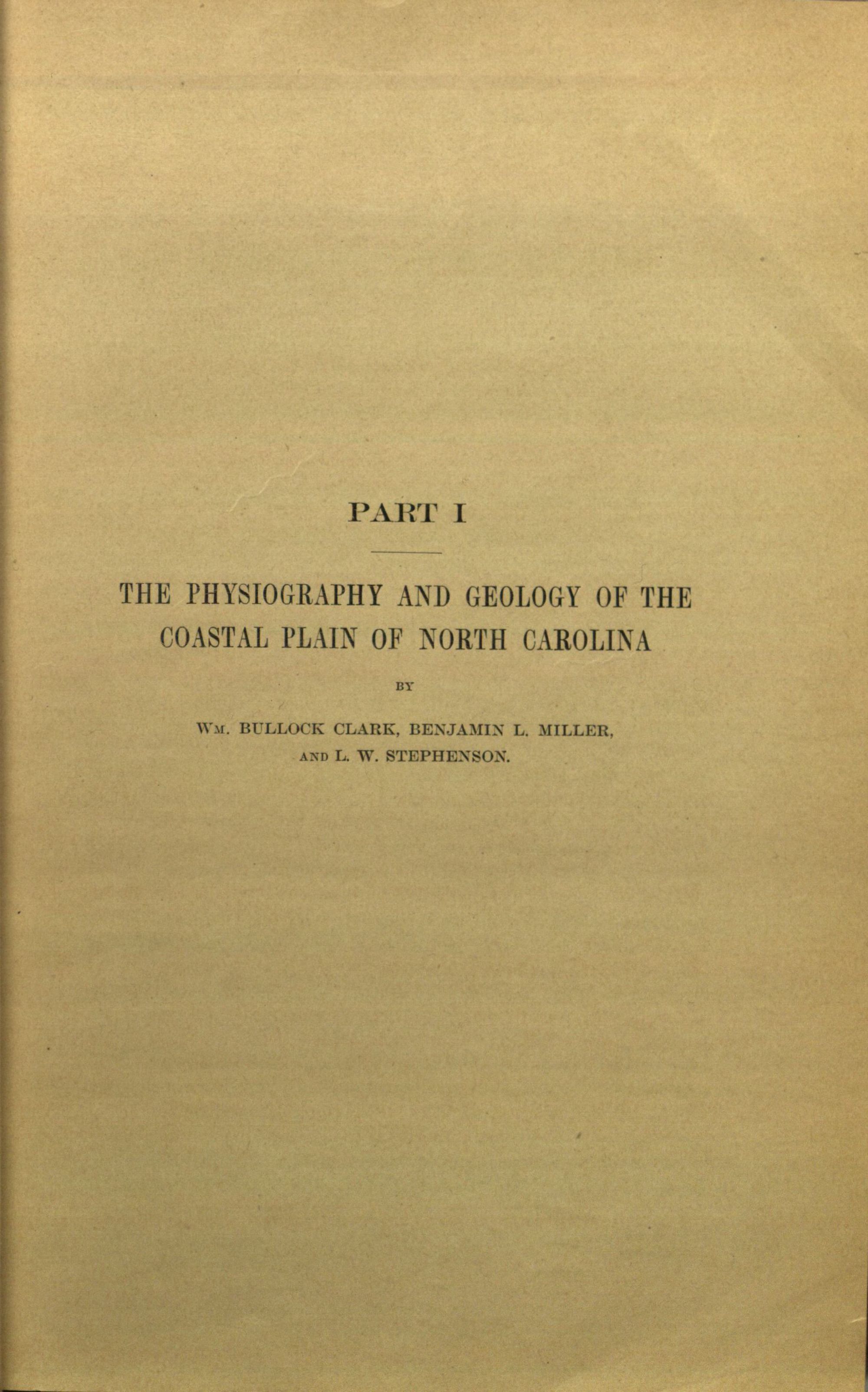 SIR:—I have the honor to submit for publication as Volume III of the publications of the North Carolina Geological and Economic Survey a report on the Coastal Plain Deposits of North Carolina. This report has been prepared in coöperation with the United States Geological Survey, under the general supervision of Dr. T. Wayland Vaughan, Geologist in charge of Coastal Plain Investigations, and under the direct supervision of Dr. William Bullock Clark, Geologist in charge of the District from New England to North Carolina. The volume has been divided into two parts. Part I treats of the Physiography and Geology of the Coastal Plain Region, and has been prepared by Dr. William Bullock Clark of Johns Hopkins University, Prof. Benjamin L. Miller of Lehigh University, and Dr. L. W. Stephenson of the United States Geological Survey. Part II, which deals particularly with the Water Resources of the Coastal Plain Region, has been prepared by Dr. L. W. Stephenson, Mr. B. L. Johnson, and Mr. Horatio N. Parker of the United States Geological Survey. It takes up in considerable detail the question of artesian water in the Coastal Plain Region, and is a report for which there is a considerable demand.