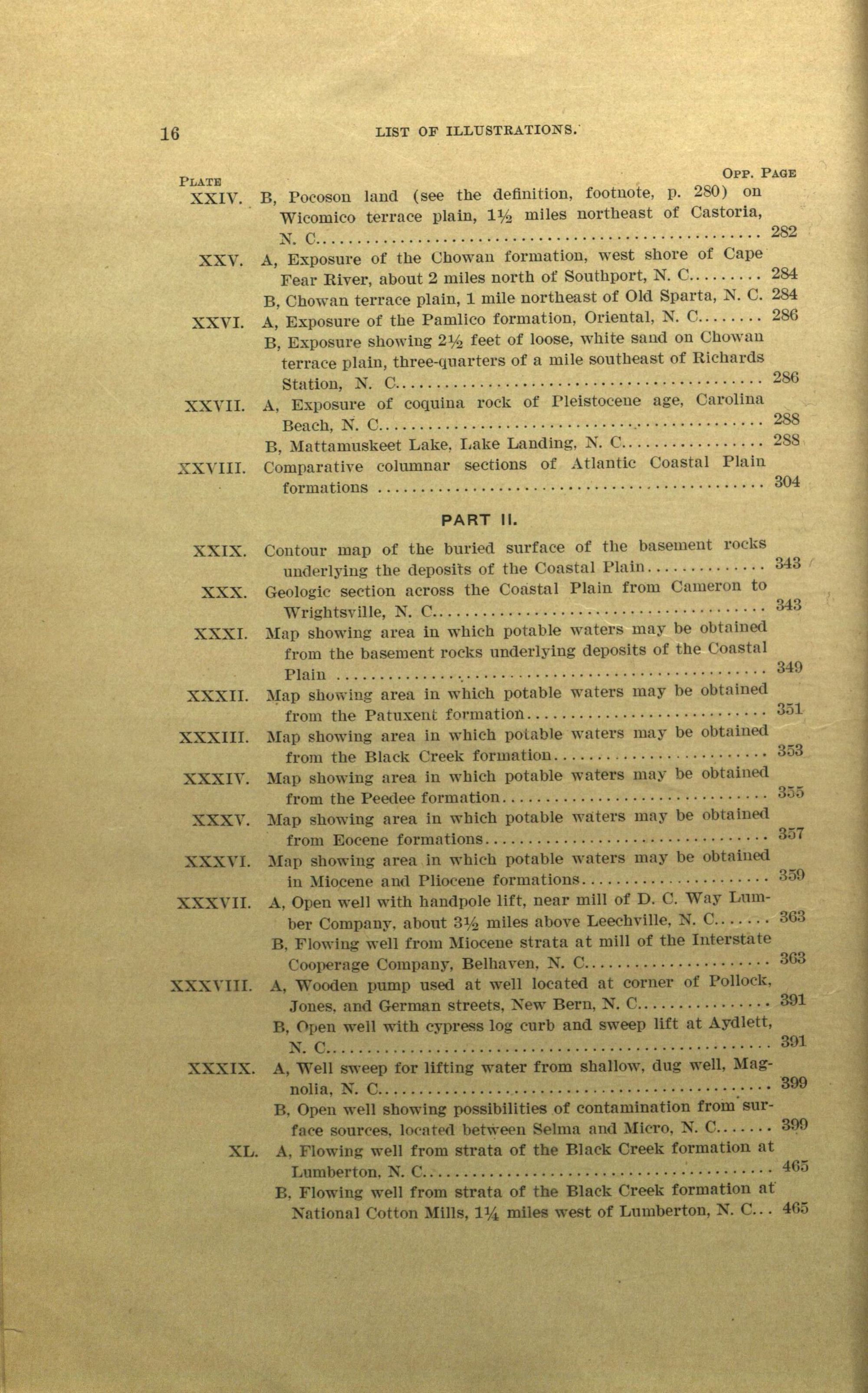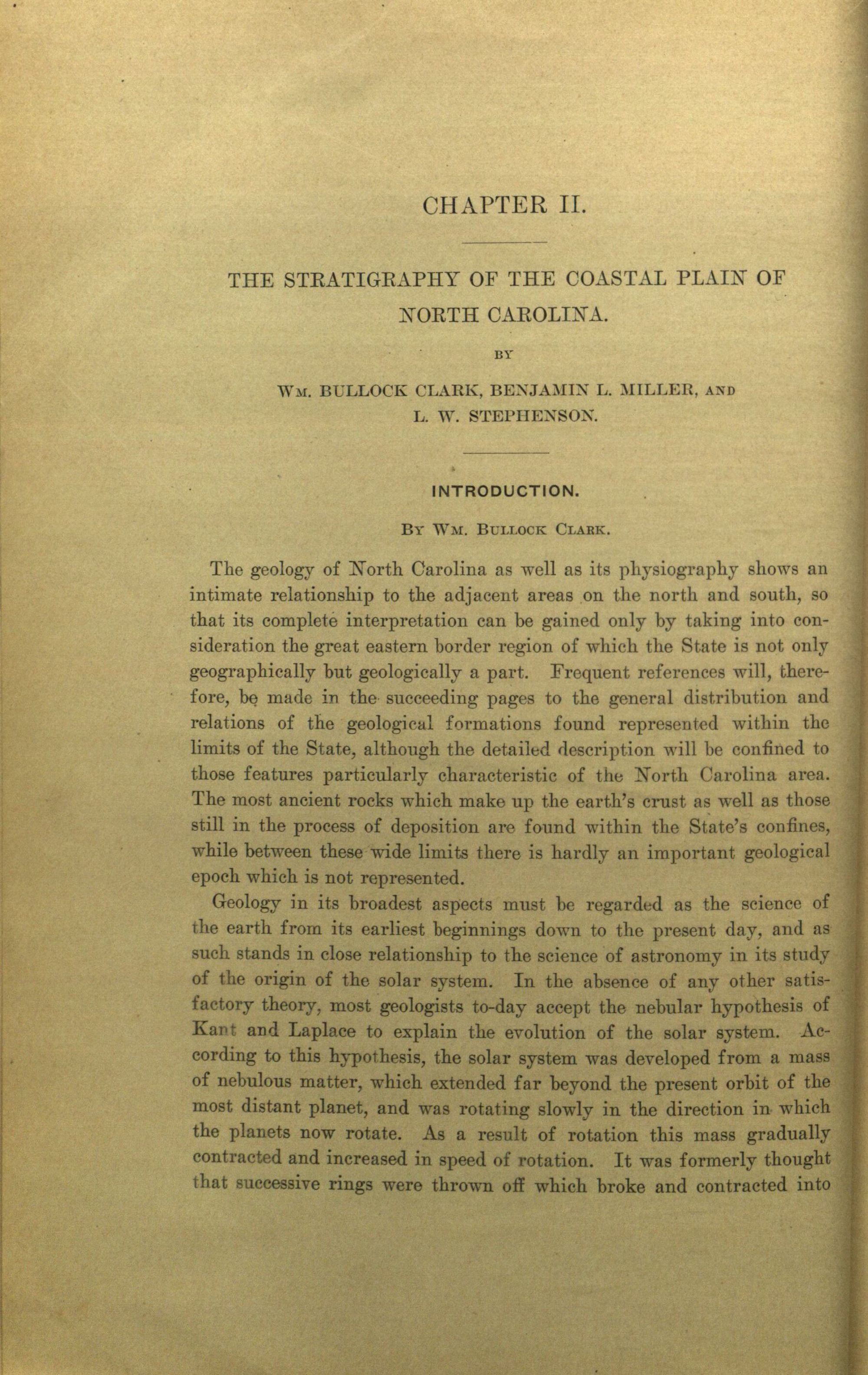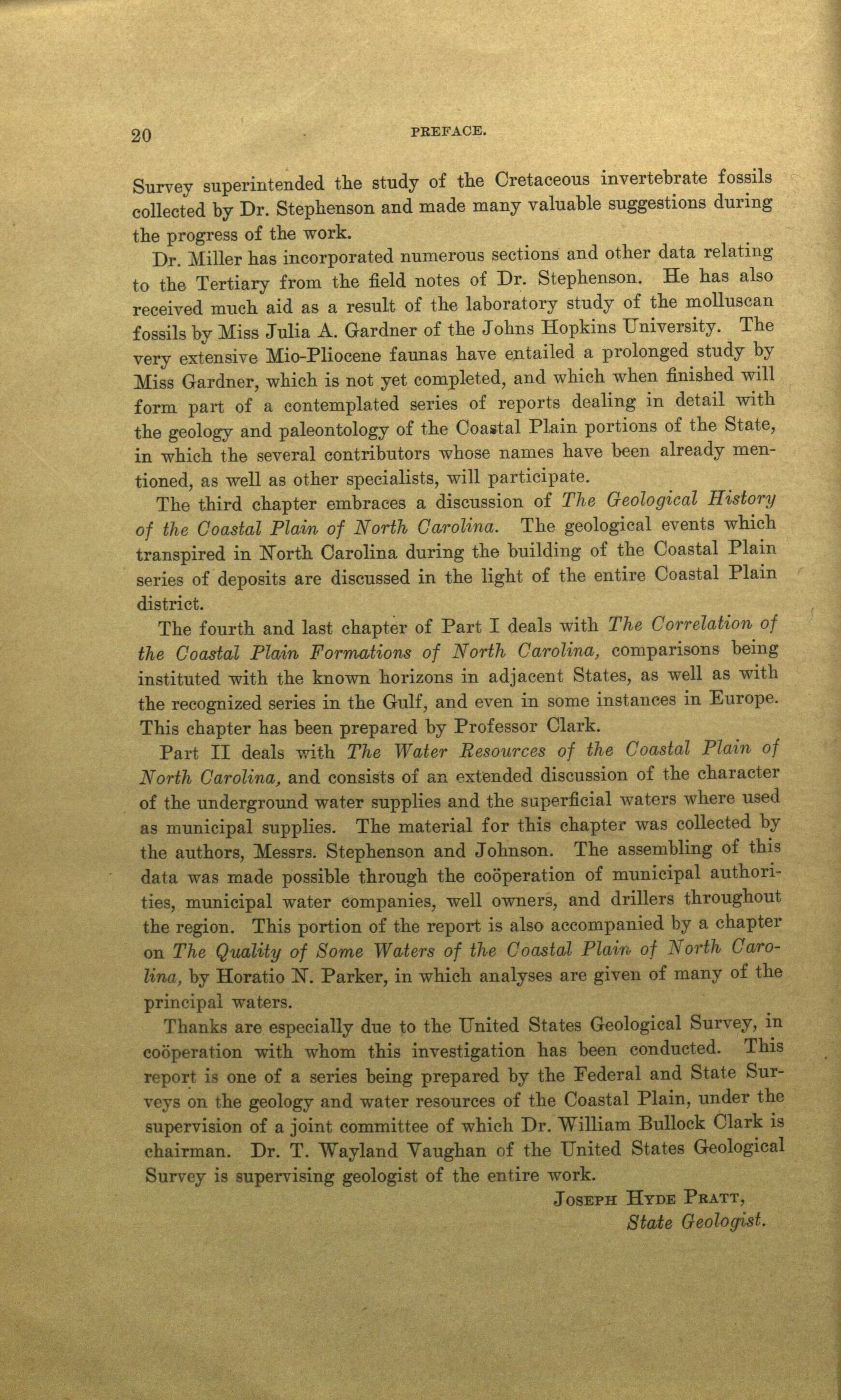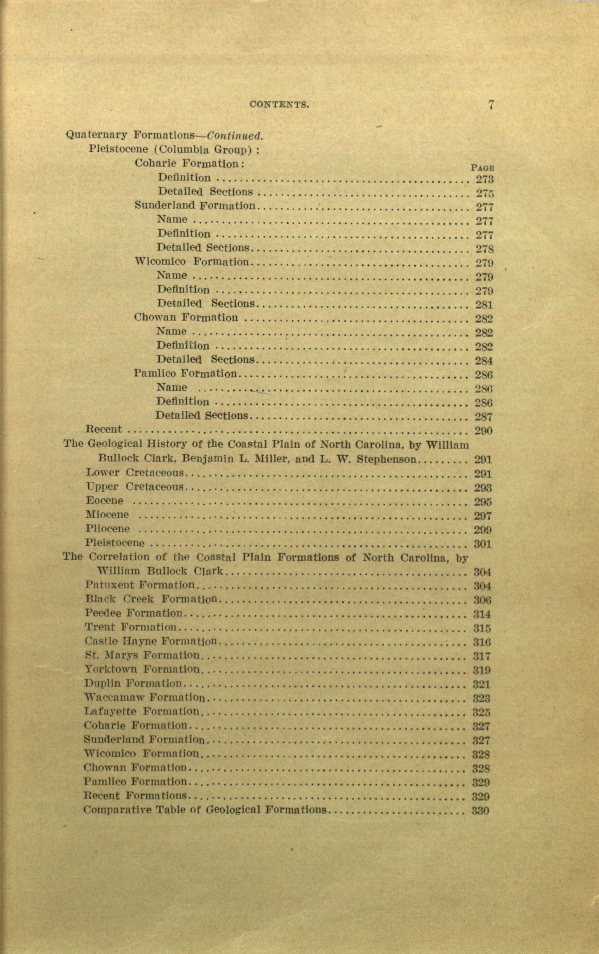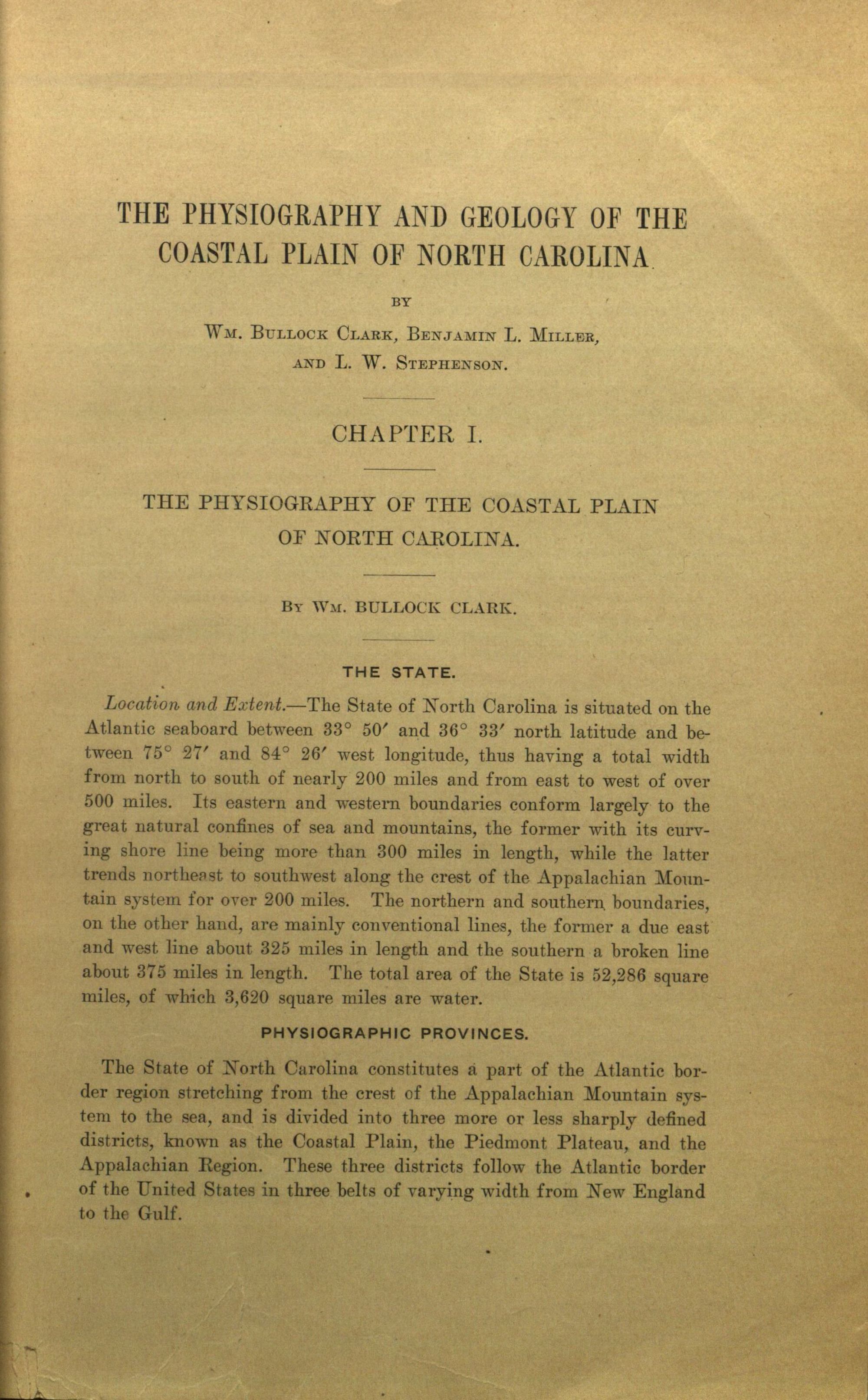 SIR:—I have the honor to submit for publication as Volume III of the publications of the North Carolina Geological and Economic Survey a report on the Coastal Plain Deposits of North Carolina. This report has been prepared in coöperation with the United States Geological Survey, under the general supervision of Dr. T. Wayland Vaughan, Geologist in charge of Coastal Plain Investigations, and under the direct supervision of Dr. William Bullock Clark, Geologist in charge of the District from New England to North Carolina. The volume has been divided into two parts. Part I treats of the Physiography and Geology of the Coastal Plain Region, and has been prepared by Dr. William Bullock Clark of Johns Hopkins University, Prof. Benjamin L. Miller of Lehigh University, and Dr. L. W. Stephenson of the United States Geological Survey. Part II, which deals particularly with the Water Resources of the Coastal Plain Region, has been prepared by Dr. L. W. Stephenson, Mr. B. L. Johnson, and Mr. Horatio N. Parker of the United States Geological Survey. It takes up in considerable detail the question of artesian water in the Coastal Plain Region, and is a report for which there is a considerable demand.
