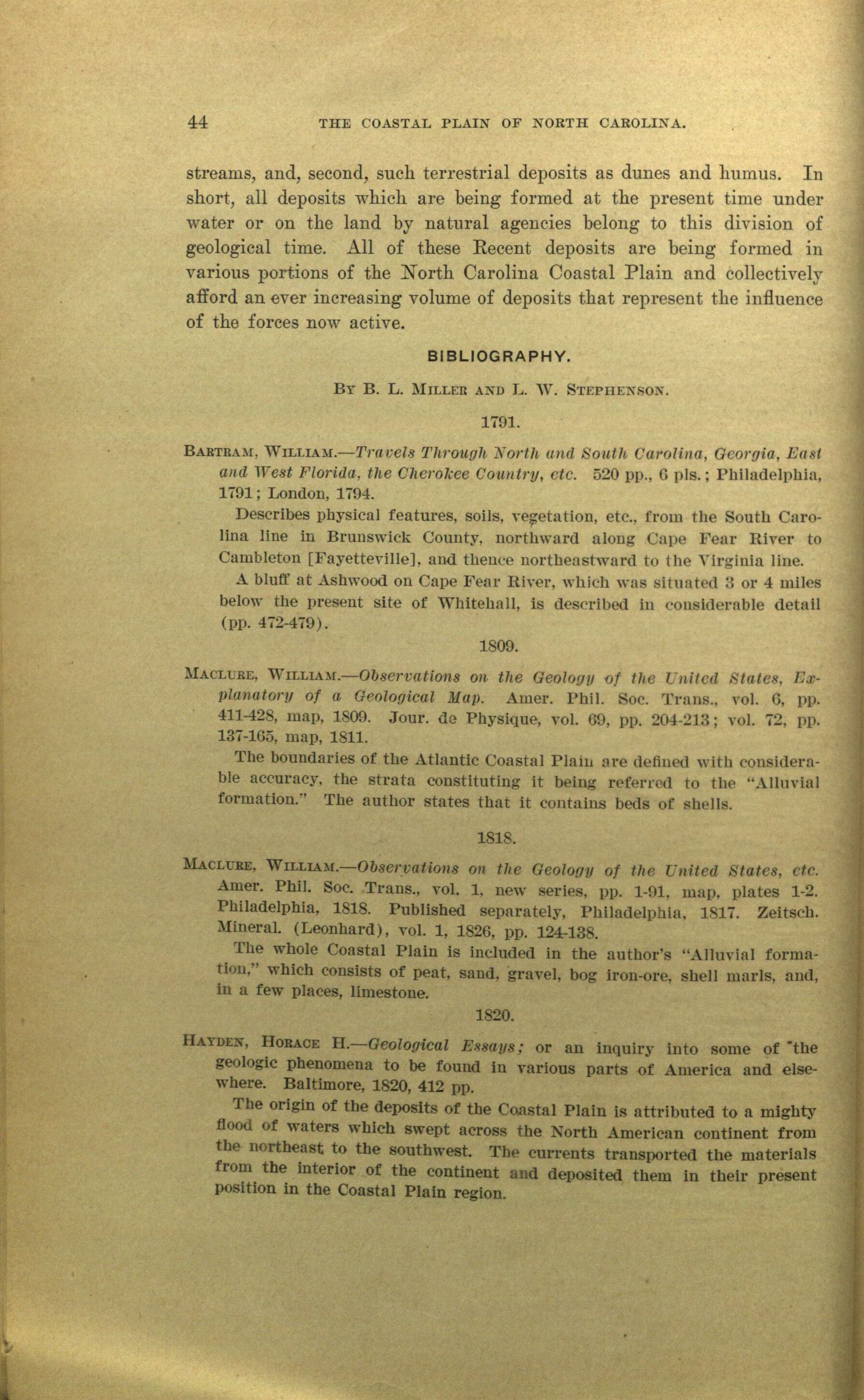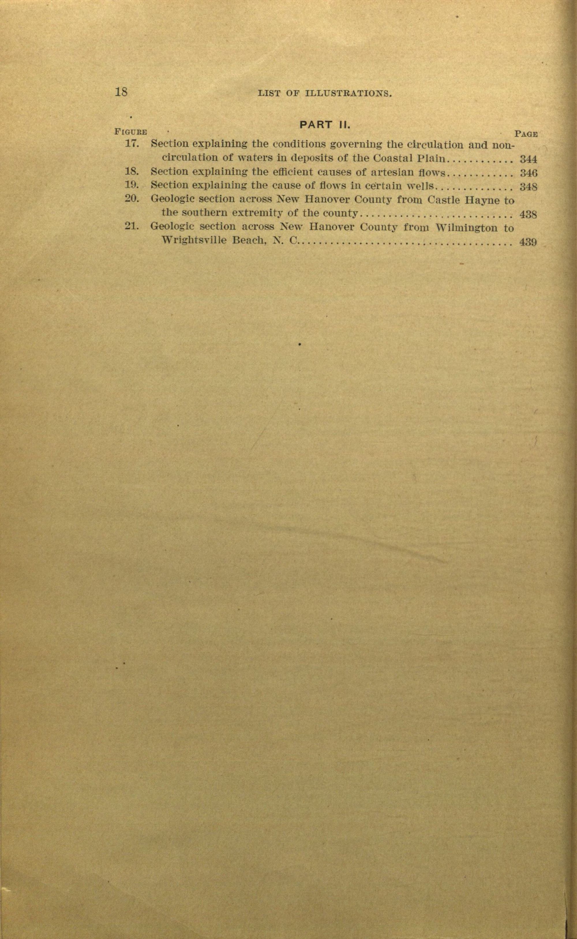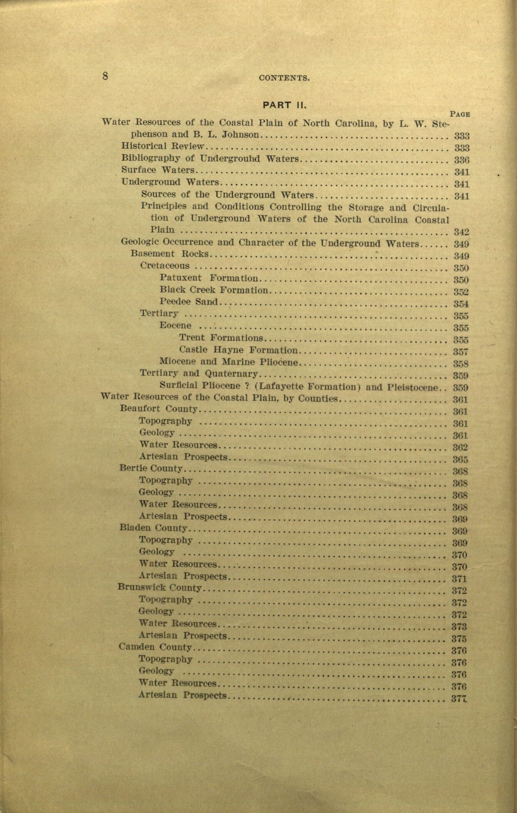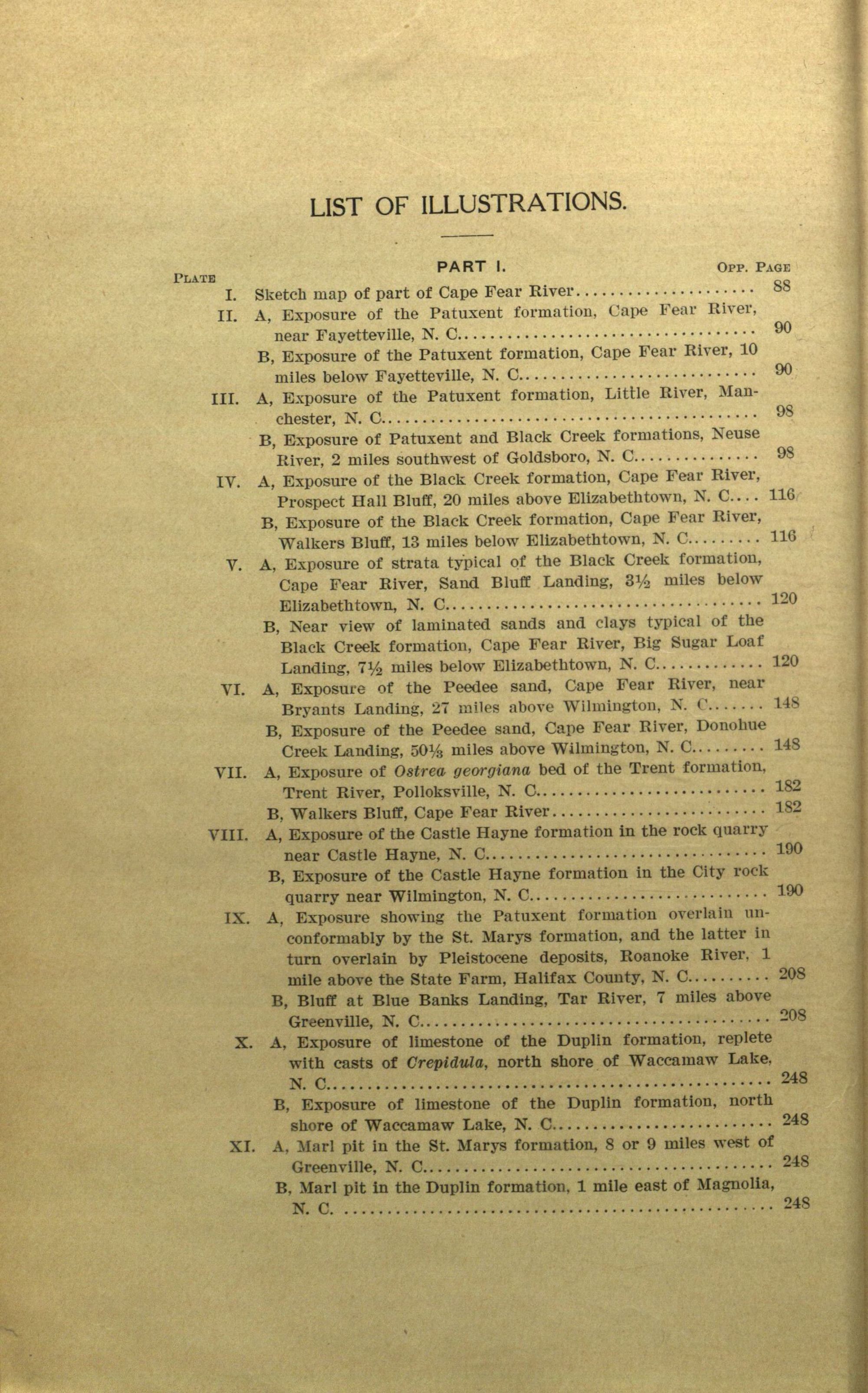 SIR:—I have the honor to submit for publication as Volume III of the publications of the North Carolina Geological and Economic Survey a report on the Coastal Plain Deposits of North Carolina. This report has been prepared in coöperation with the United States Geological Survey, under the general supervision of Dr. T. Wayland Vaughan, Geologist in charge of Coastal Plain Investigations, and under the direct supervision of Dr. William Bullock Clark, Geologist in charge of the District from New England to North Carolina. The volume has been divided into two parts. Part I treats of the Physiography and Geology of the Coastal Plain Region, and has been prepared by Dr. William Bullock Clark of Johns Hopkins University, Prof. Benjamin L. Miller of Lehigh University, and Dr. L. W. Stephenson of the United States Geological Survey. Part II, which deals particularly with the Water Resources of the Coastal Plain Region, has been prepared by Dr. L. W. Stephenson, Mr. B. L. Johnson, and Mr. Horatio N. Parker of the United States Geological Survey. It takes up in considerable detail the question of artesian water in the Coastal Plain Region, and is a report for which there is a considerable demand.