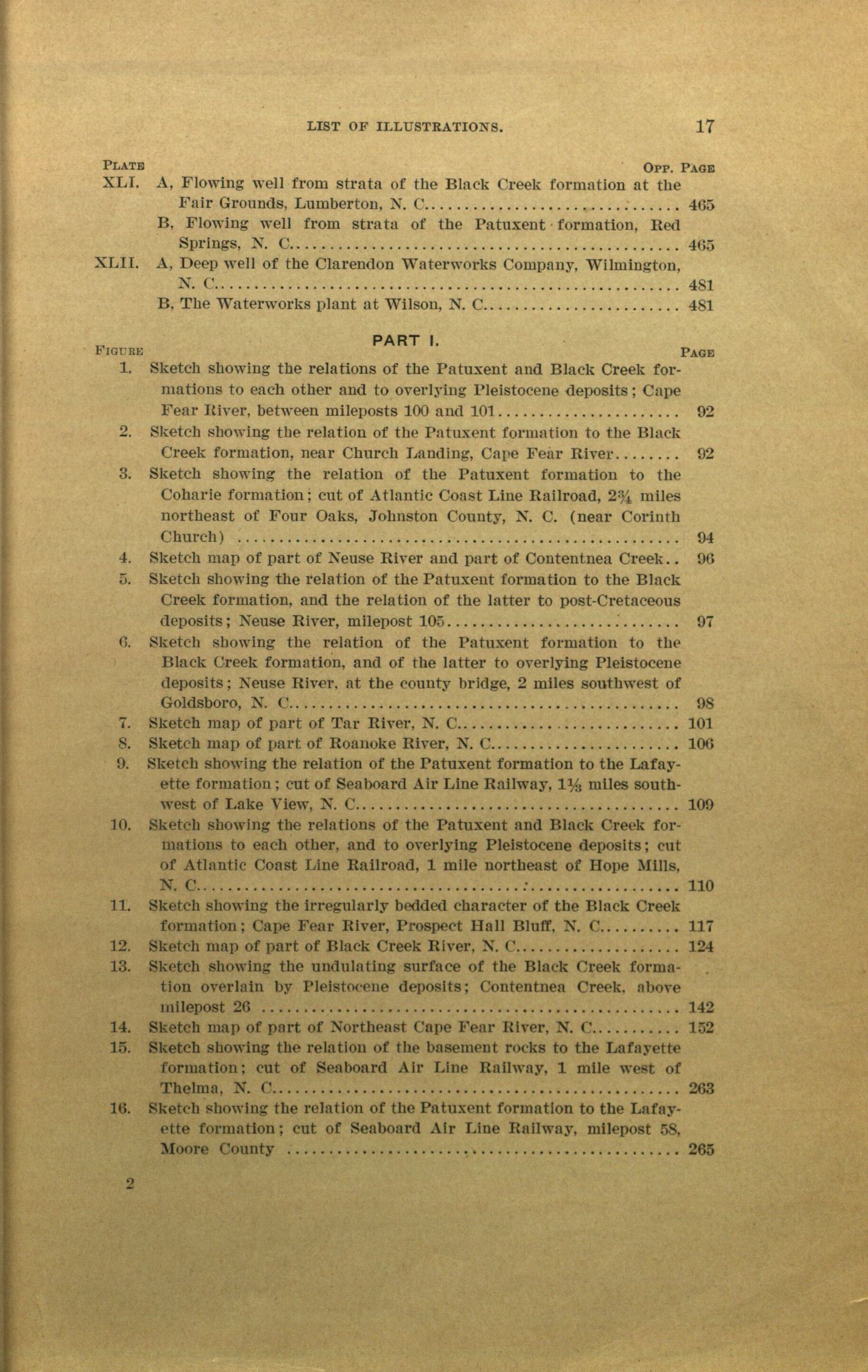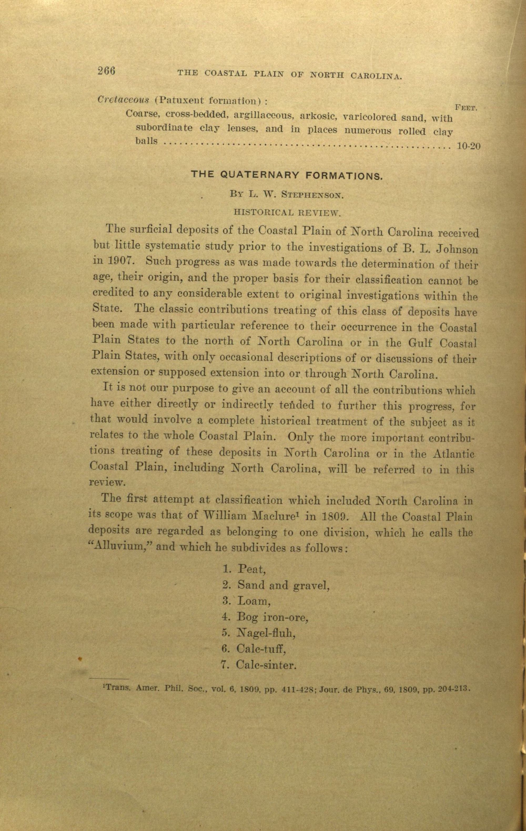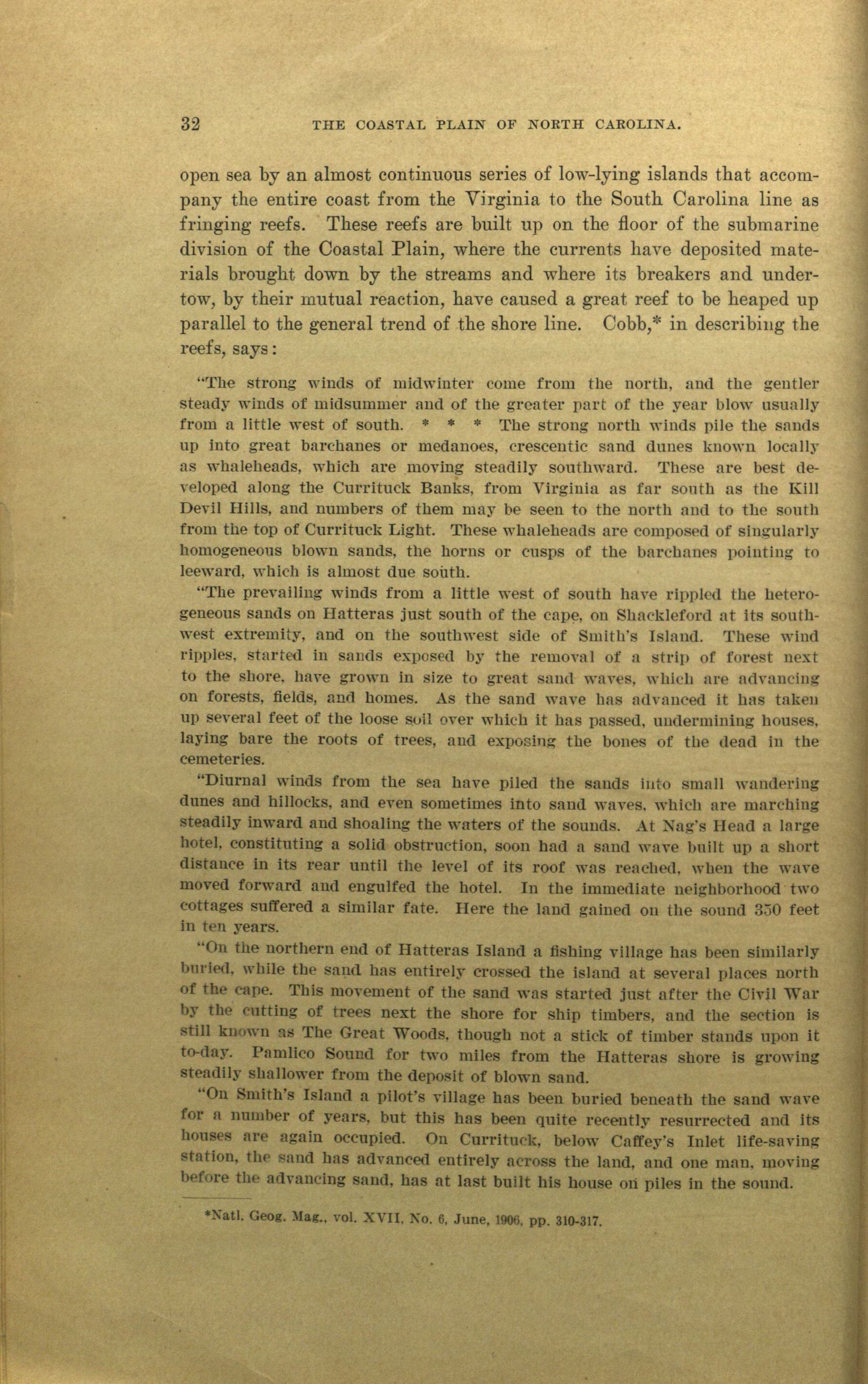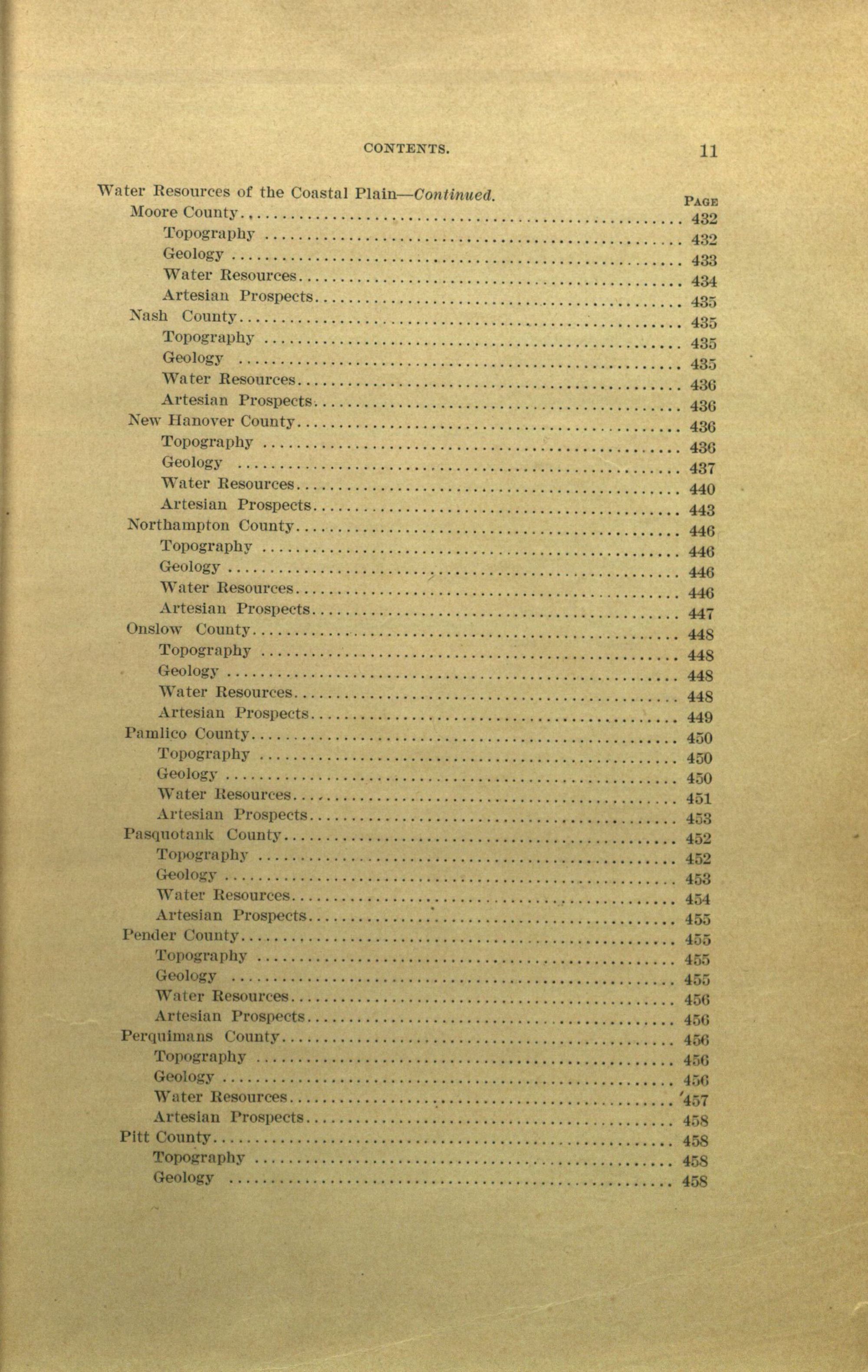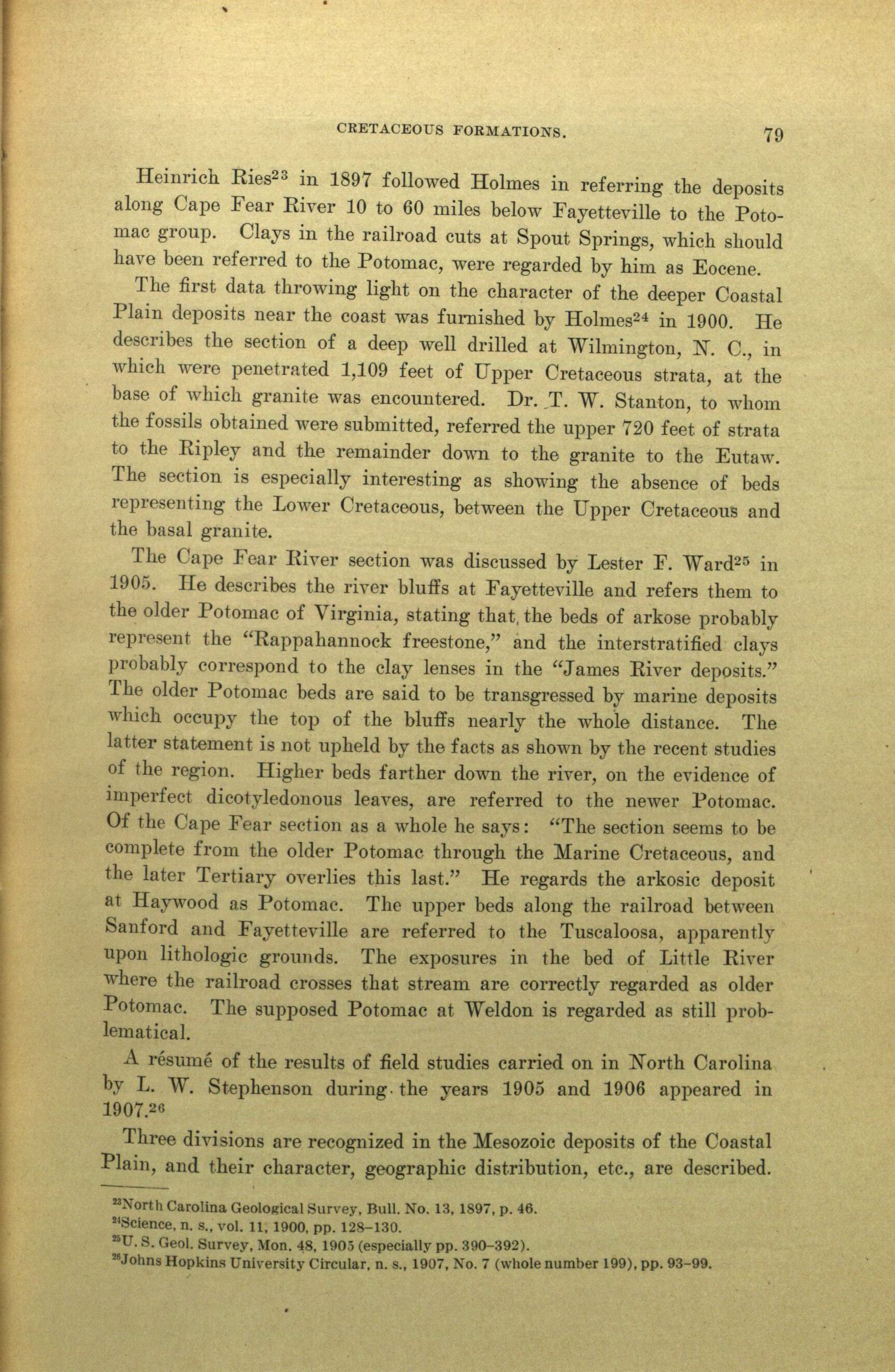 SIR:—I have the honor to submit for publication as Volume III of the publications of the North Carolina Geological and Economic Survey a report on the Coastal Plain Deposits of North Carolina. This report has been prepared in coöperation with the United States Geological Survey, under the general supervision of Dr. T. Wayland Vaughan, Geologist in charge of Coastal Plain Investigations, and under the direct supervision of Dr. William Bullock Clark, Geologist in charge of the District from New England to North Carolina. The volume has been divided into two parts. Part I treats of the Physiography and Geology of the Coastal Plain Region, and has been prepared by Dr. William Bullock Clark of Johns Hopkins University, Prof. Benjamin L. Miller of Lehigh University, and Dr. L. W. Stephenson of the United States Geological Survey. Part II, which deals particularly with the Water Resources of the Coastal Plain Region, has been prepared by Dr. L. W. Stephenson, Mr. B. L. Johnson, and Mr. Horatio N. Parker of the United States Geological Survey. It takes up in considerable detail the question of artesian water in the Coastal Plain Region, and is a report for which there is a considerable demand.
