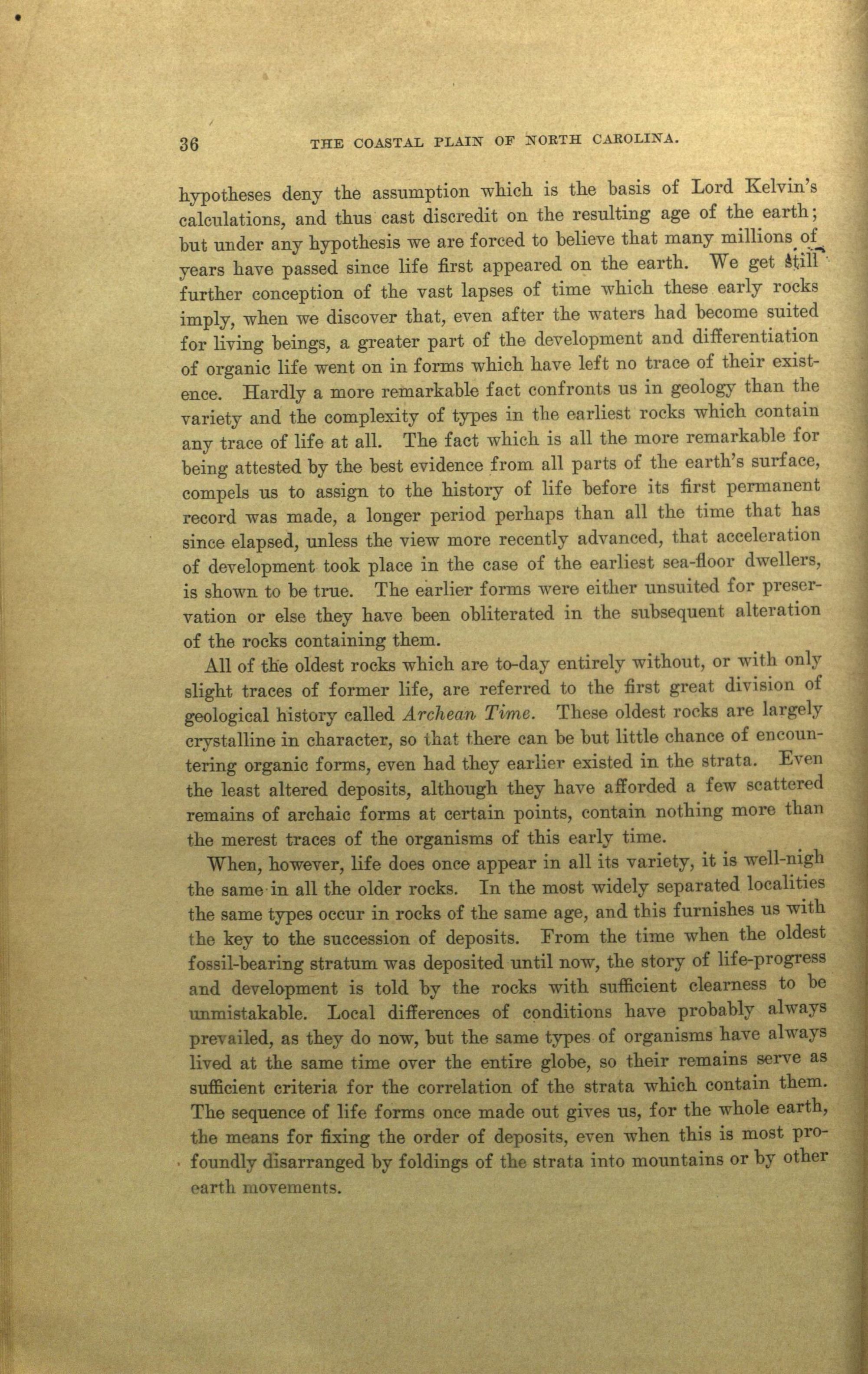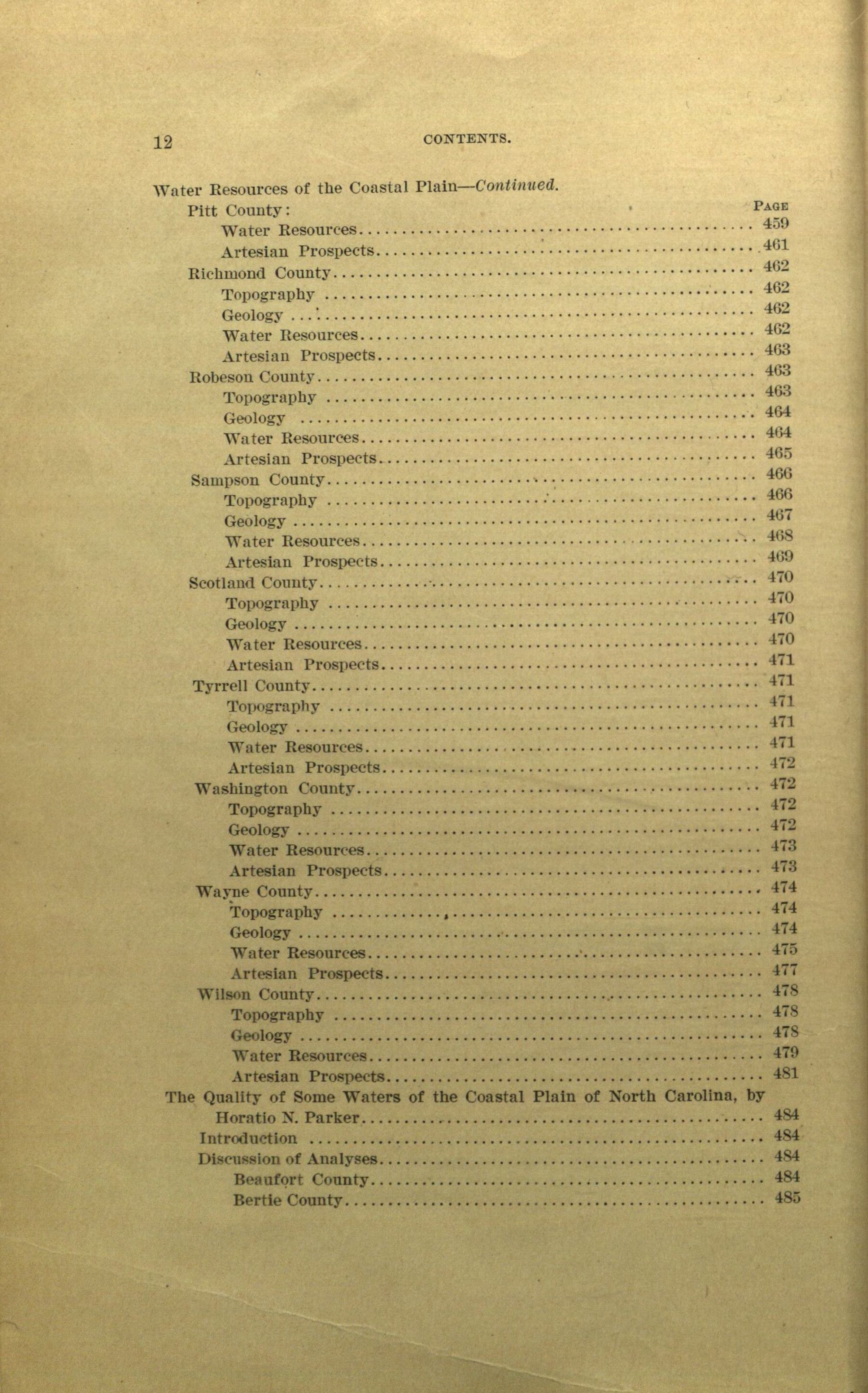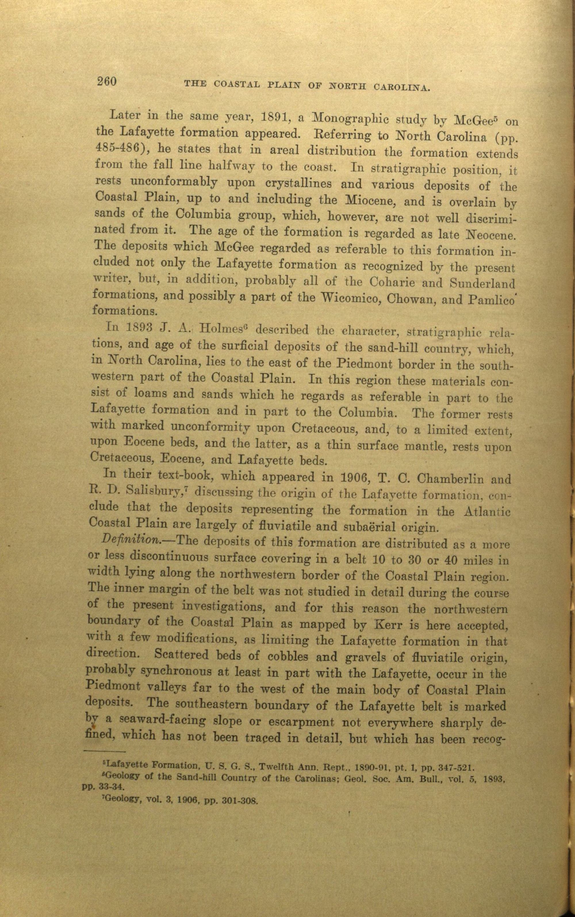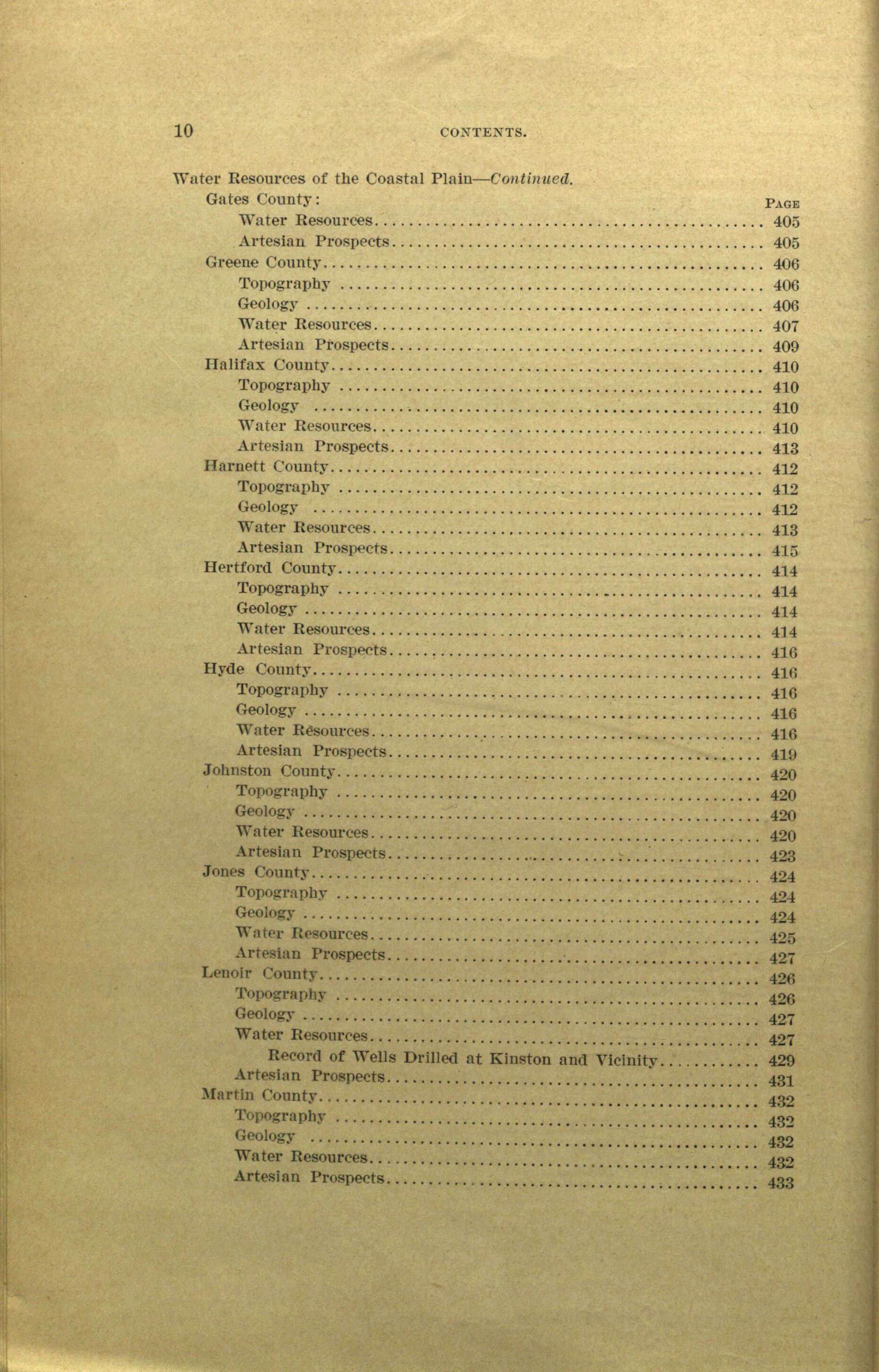 SIR:—I have the honor to submit for publication as Volume III of the publications of the North Carolina Geological and Economic Survey a report on the Coastal Plain Deposits of North Carolina. This report has been prepared in coöperation with the United States Geological Survey, under the general supervision of Dr. T. Wayland Vaughan, Geologist in charge of Coastal Plain Investigations, and under the direct supervision of Dr. William Bullock Clark, Geologist in charge of the District from New England to North Carolina. The volume has been divided into two parts. Part I treats of the Physiography and Geology of the Coastal Plain Region, and has been prepared by Dr. William Bullock Clark of Johns Hopkins University, Prof. Benjamin L. Miller of Lehigh University, and Dr. L. W. Stephenson of the United States Geological Survey. Part II, which deals particularly with the Water Resources of the Coastal Plain Region, has been prepared by Dr. L. W. Stephenson, Mr. B. L. Johnson, and Mr. Horatio N. Parker of the United States Geological Survey. It takes up in considerable detail the question of artesian water in the Coastal Plain Region, and is a report for which there is a considerable demand.