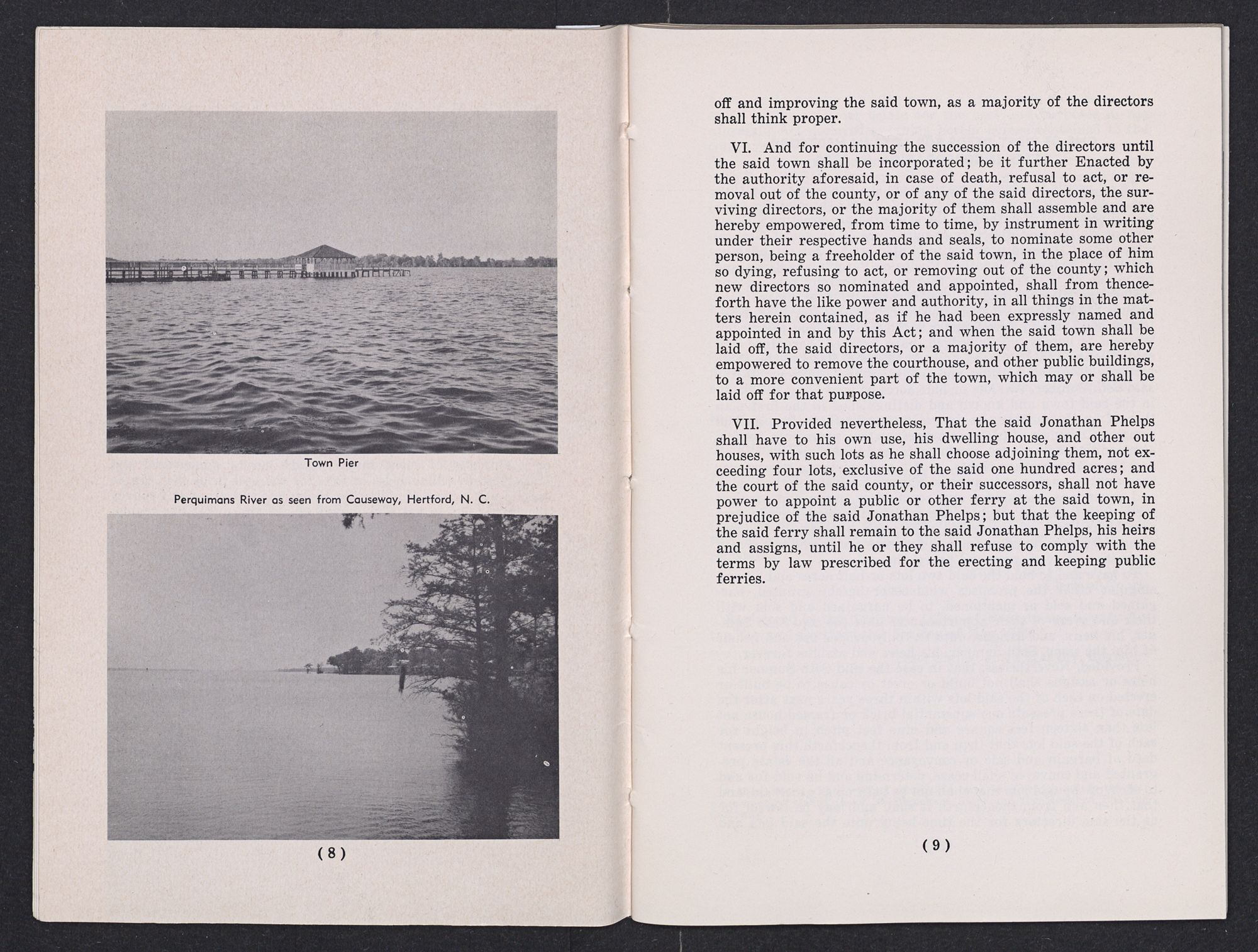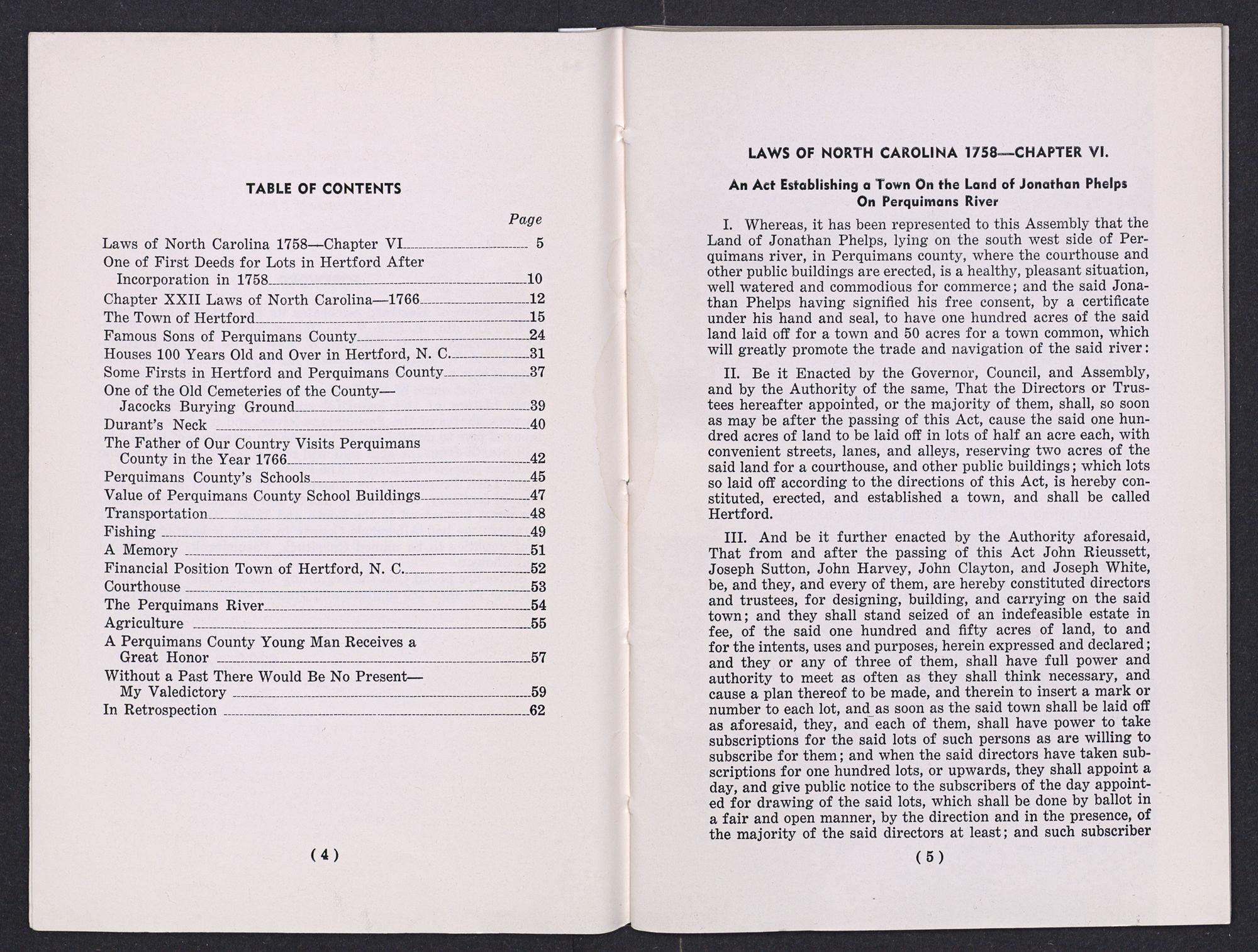 I. Whereas, it has been represented to this Assembly that the Land of Jonathan Phelps, lying on the south west side of Perquimans river, in Perquimans county, where the courthouse and other public buildings are erected, is a healthy, pleasant situation, well watered and commodious for commerce; and the said Jonathan Phelps having signified his free consent, by a certificate under his hand and seal, to have one hundred acres of the said land laid off for a town and 50 acres for a town common, which will greatly promote the trade and navigation of the said river: