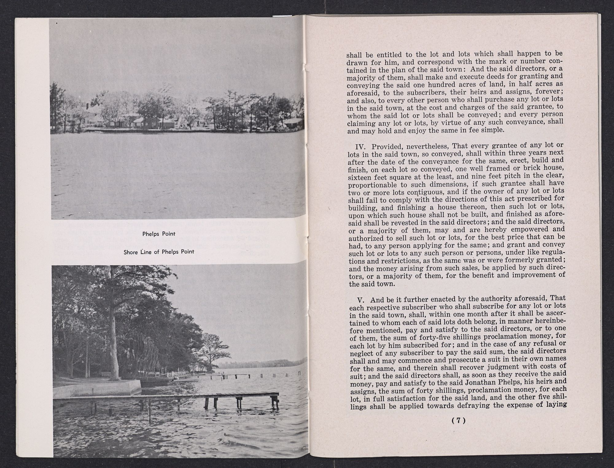 VII. Provided nevertheless, That the said Jonathan Phelps shall have to his own use, his dwelling house, and other out houses, with such lots as he shall choose adjoining them, not exceeding four lots, exclusive of the said one hundred acres; and the court of the said county, or their successors, shall not have power to appoint a public or other ferry at the said town, in prejudice of the said Jonathan Phelps; but that the keeping of the said ferry shall remain to the said Jonathan Phelps, his heirs and assigns, until he or they shall refuse to comply with the terms by law prescribed for the erecting and keeping public ferries.