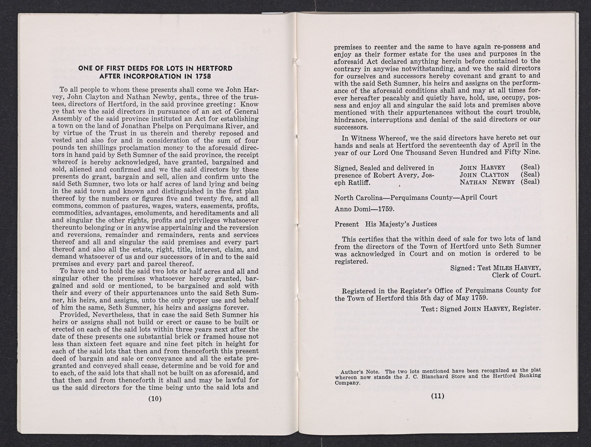 Author's Note. The two lots mentioned have been recognized as the plat whereon now stands the J. C. Blanchard Store and the Hertford Banking Company.