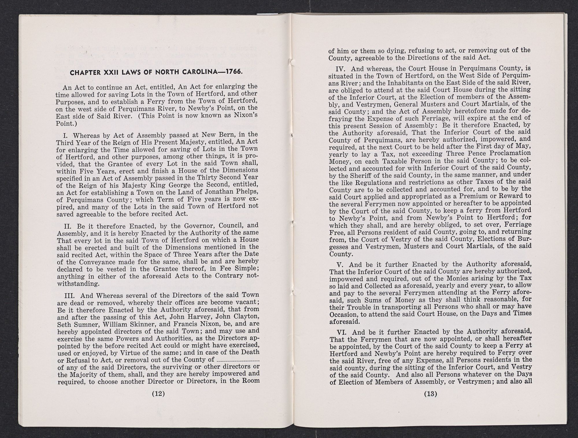 An Act to continue an Act, entitled, An Act for enlarging the time allowed for saving Lots in the Town of Hertford, and other Purposes, and to establish a Ferry from the Town of Hertford, on the west side of Perquimans River, to Newby's Point, on the East side of Said River. (This Point is now known as Nixon's Point.)