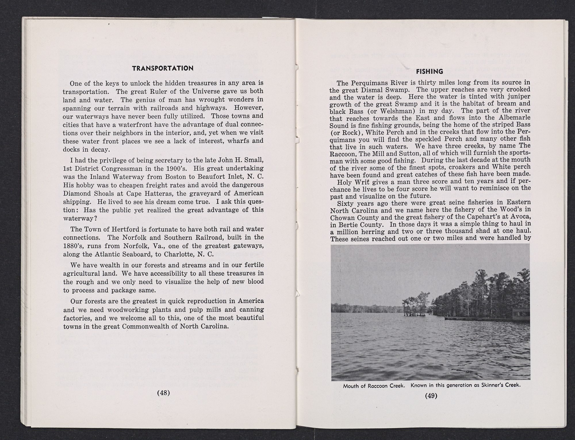 Where is all this wealth gone—it is not here any more. We beileve that out yonder in the blue of the Atlantic Ocean we have as many herring and shad as in the past. Let our Conservation Department work on this mystery. Perhaps we have dammed up so much of the fresh waters to the west and shoaled up our inlets in the east until we have ruined the spawning grounds in our sounds and rivers.