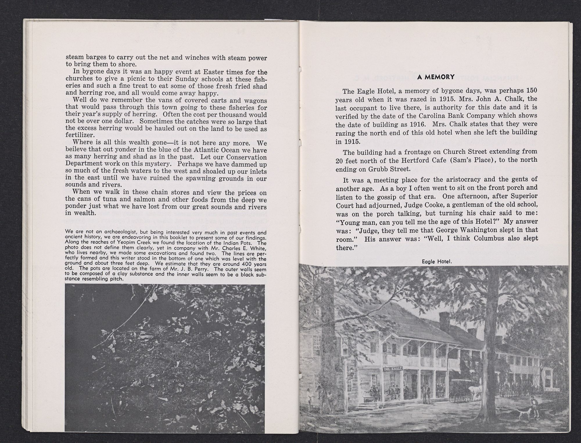 We are not an archaeologist, but being interested very much in past events and ancient history, we are endeavoring in this booklet to present some of our findings. Along the reaches of Yeopim Creek we found the location of the Indian Pots. The photo does not define them clearly, yet in company with Mr. Charles E. White, who lives nearby, we made some excavations and found two. The lines are perfectly formed and this writer stood in the bottom of one which was level with the ground and about three feet deep. We estimate that they are around 400 years old. The pots are located on the farm of Mr. J. B. Perry. The outer walls seem to be composed of a clay substance and the inner walls seem to be a black substance resembling pitch.