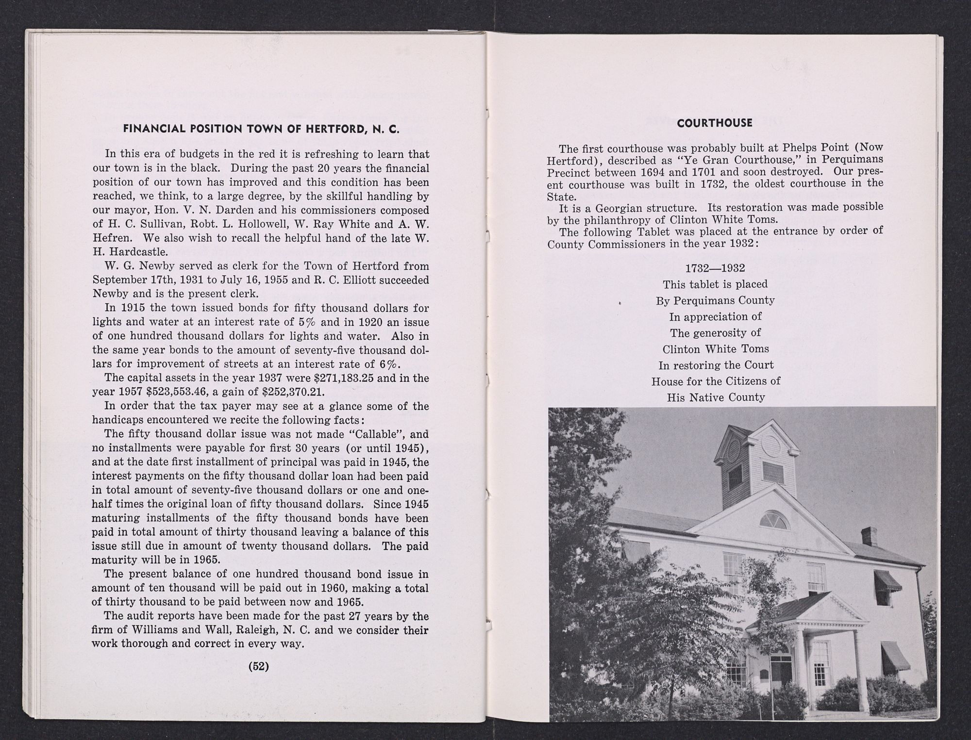 In this era of budgets in the red it is refreshing to learn that our town is in the black. During the past 20 years the financial position of our town has improved and this condition has been reached, we think, to a large degree, by the skillful handling by our mayor, Hon. V. N. Darden and his commissioners composed of H. C. Sullivan, Robt. L. Hollowell, W. Ray White and A. W. Hefren. We also wish to recall the helpful hand of the late W. H. Hardcastle.