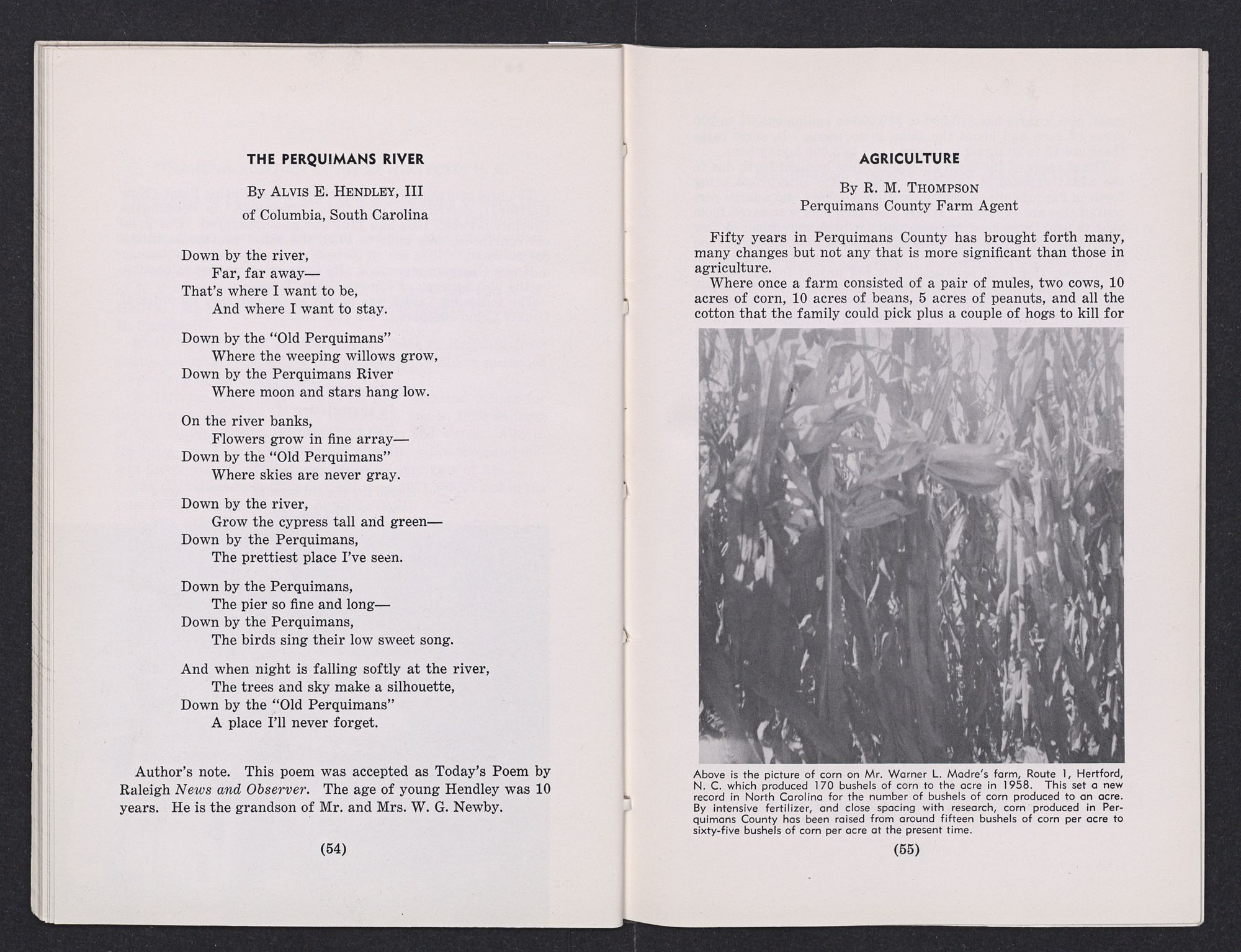 Down by the river,Far, far away—That's where I want to be,And where I want to stay.Down by the “Old Perquimans”Where the weeping willows grow,Down by the Perquimans RiverWhere moon and stars hang low.On the river banks,Flowers grow in fine array—Down by the “Old Perquimans”Where skies are never gray.Down by the river,Grow the cypress tall and green—Down by the Perquimans,The prettiest place I've seen.Down by the Perquimans,The pier so fine and long—Down by the Perquimans,The birds sing their low sweet song.And when night is falling softly at the river,The trees and sky make a silhouette,Down by the “Old Perquimans”A place I'll never forget.Author's note. This poem was accepted as Today's Poem by Raleigh News and Observer. The age of young Hendley was 10 years. He is the grandson of Mr. and Mrs. W. G. Newby.