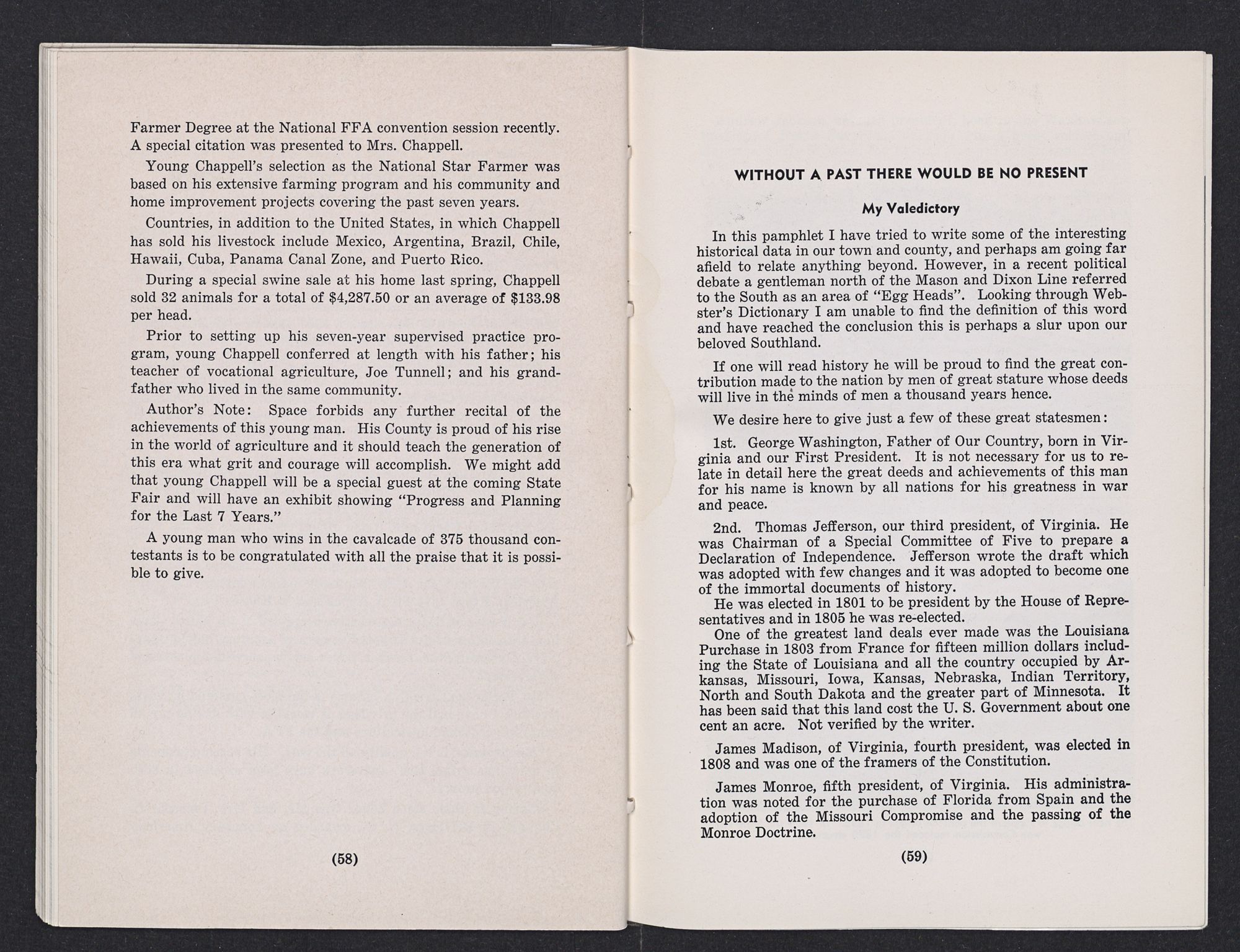 Author's Note: Space forbids any further recital of the achievements of this young man. His County is proud of his rise in the world of agriculture and it should teach the generation of this era what grit and courage will accomplish. We might add that young Chappell will be a special guest at the coming State Fair and will have an exhibit showing “Progress and Planning for the Last 7 Years.”