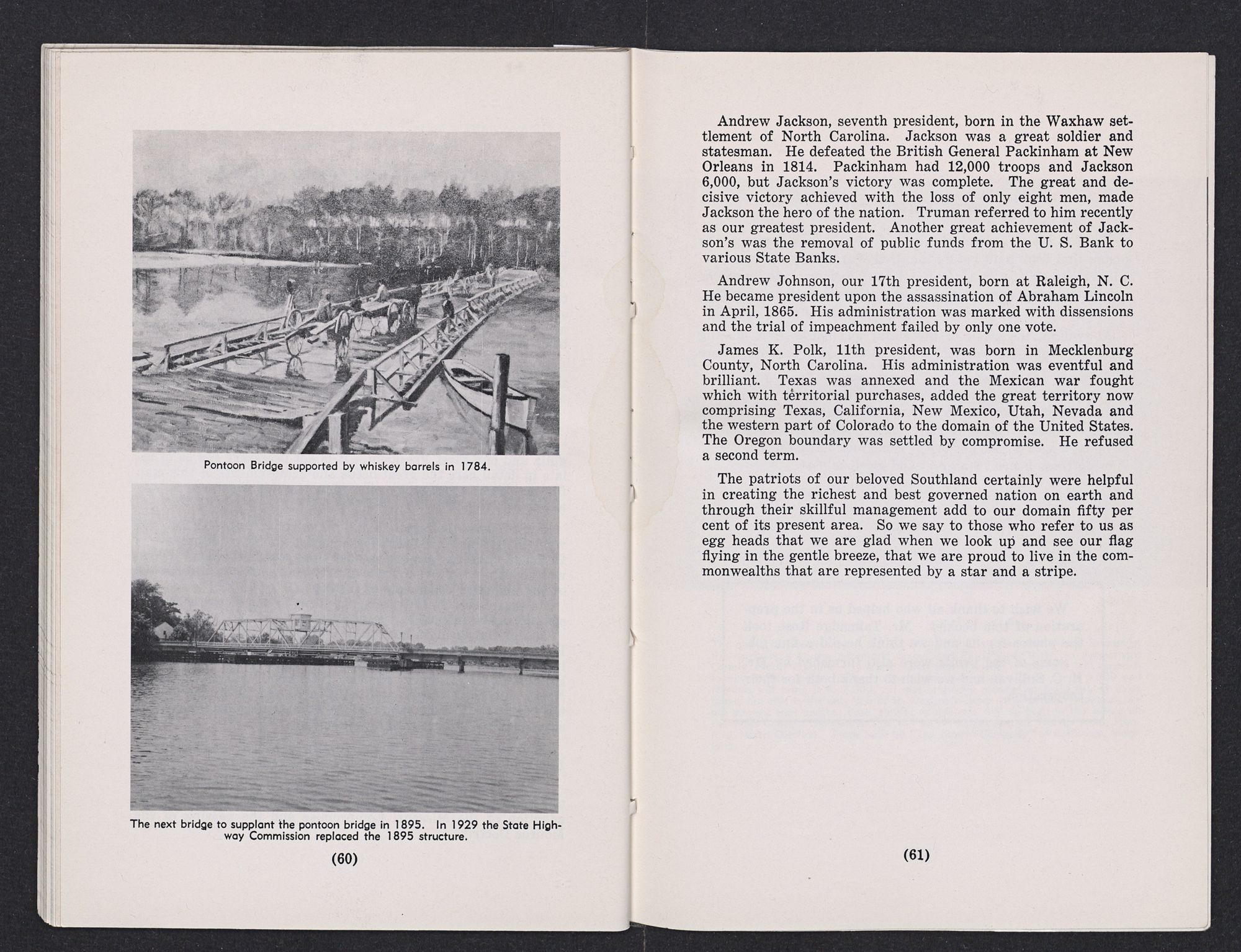 Andrew Jackson, seventh president, born in the Waxhaw settlement of North Carolina. Jackson was a great soldier and statesman. He defeated the British General Packinham at New Orleans in 1814. Packinham had 12,000 troops and Jackson 6,000, but Jackson's victory was complete. The great and decisive victory achieved with the loss of only eight men, made Jackson the hero of the nation. Truman referred to him recently as our greatest president. Another great achievement of Jackson's was the removal of public funds from the U. S. Bank to various State Banks.