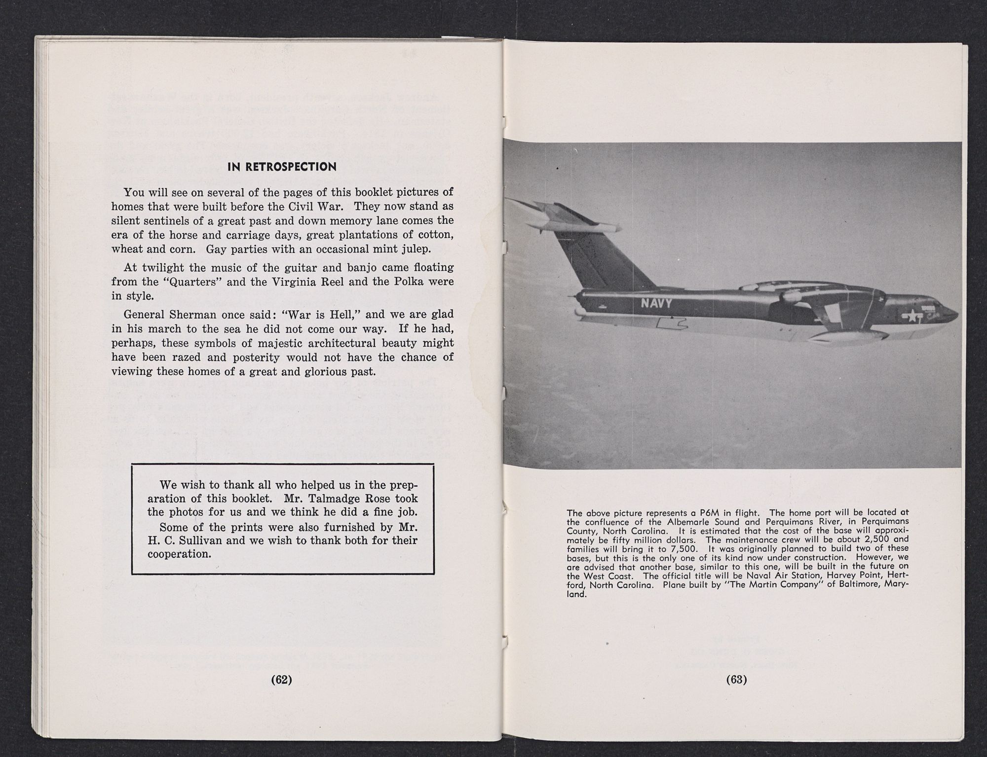 The above picture represents a P6M in flight. The home part will be located at the confluence of the Albemarle Sound and Perquimans River, in Perquimans County, North Carolina. It is estimated that the cost of the base will approximately be fifty million dollars. The maintenance crew will be about 2,500 and families will bring it to 7,500. It was originally planned to build two of these bases, but this is the only one of its kind now under construction. However, we are advised that another base, similar to this one, will be built in the future on the West Coast. The official title will be Naval Air Station, Harvey Point, Hertford, North Carolina. Plane built by “The Martin Company” of Baltimore, Maryland.