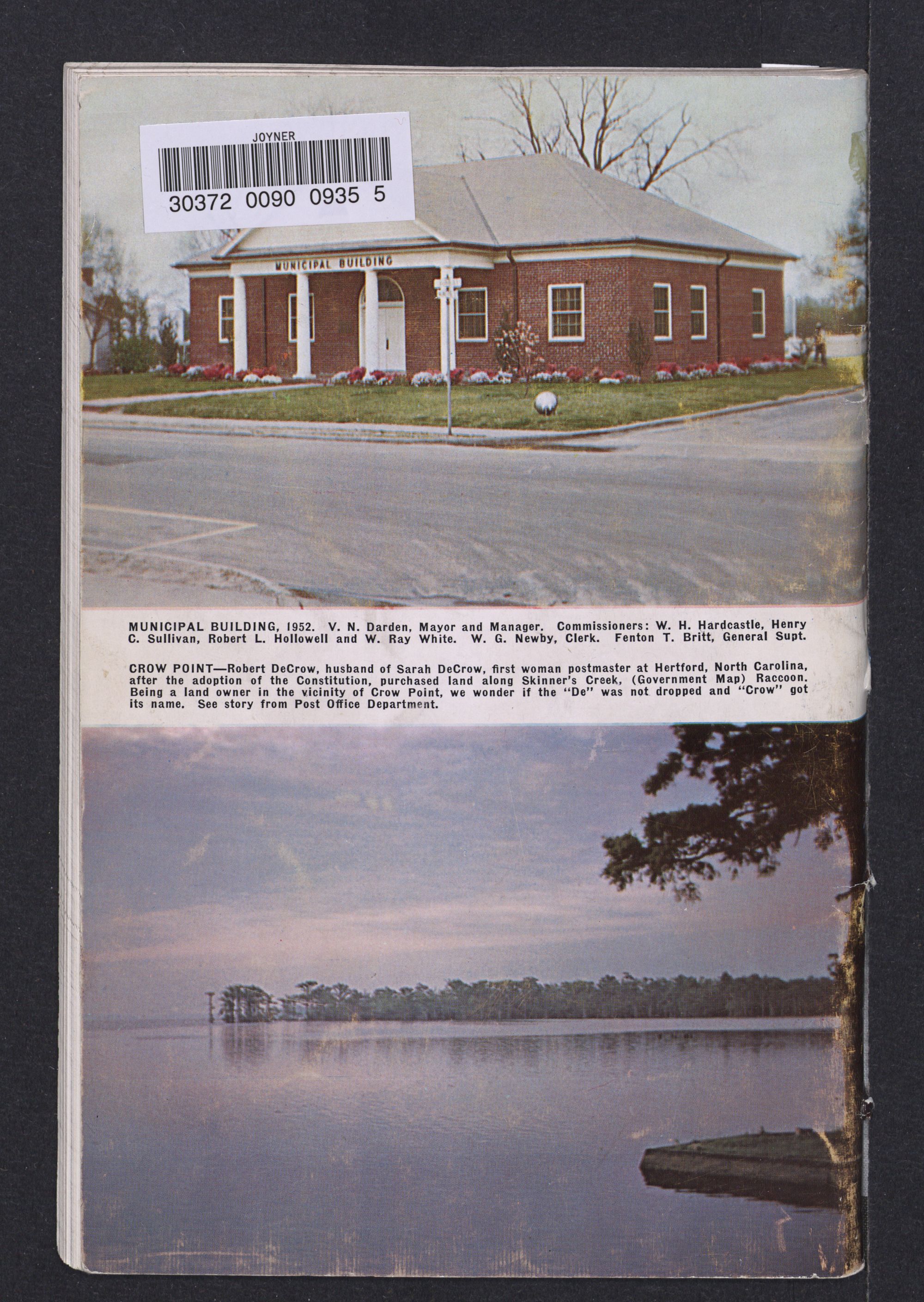 MUNICIPAL BUILDING, 1952. V. N. Darden, Mayor and Manager. Commissioners: W. H. Hardcastle, Henry