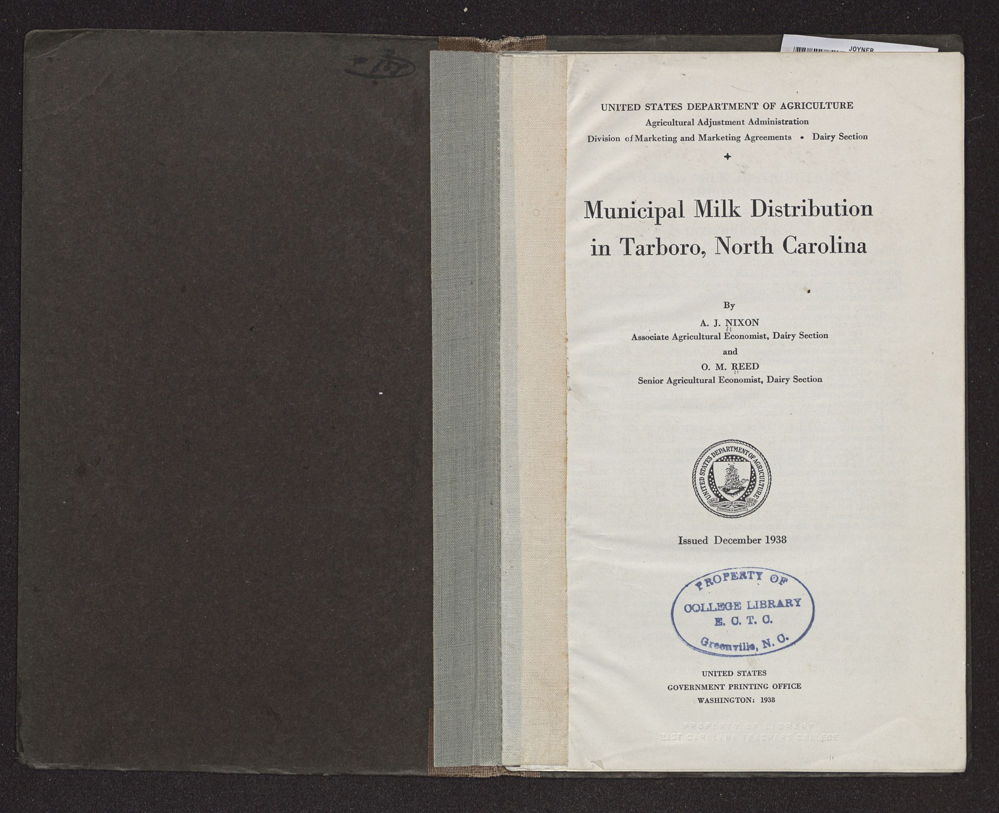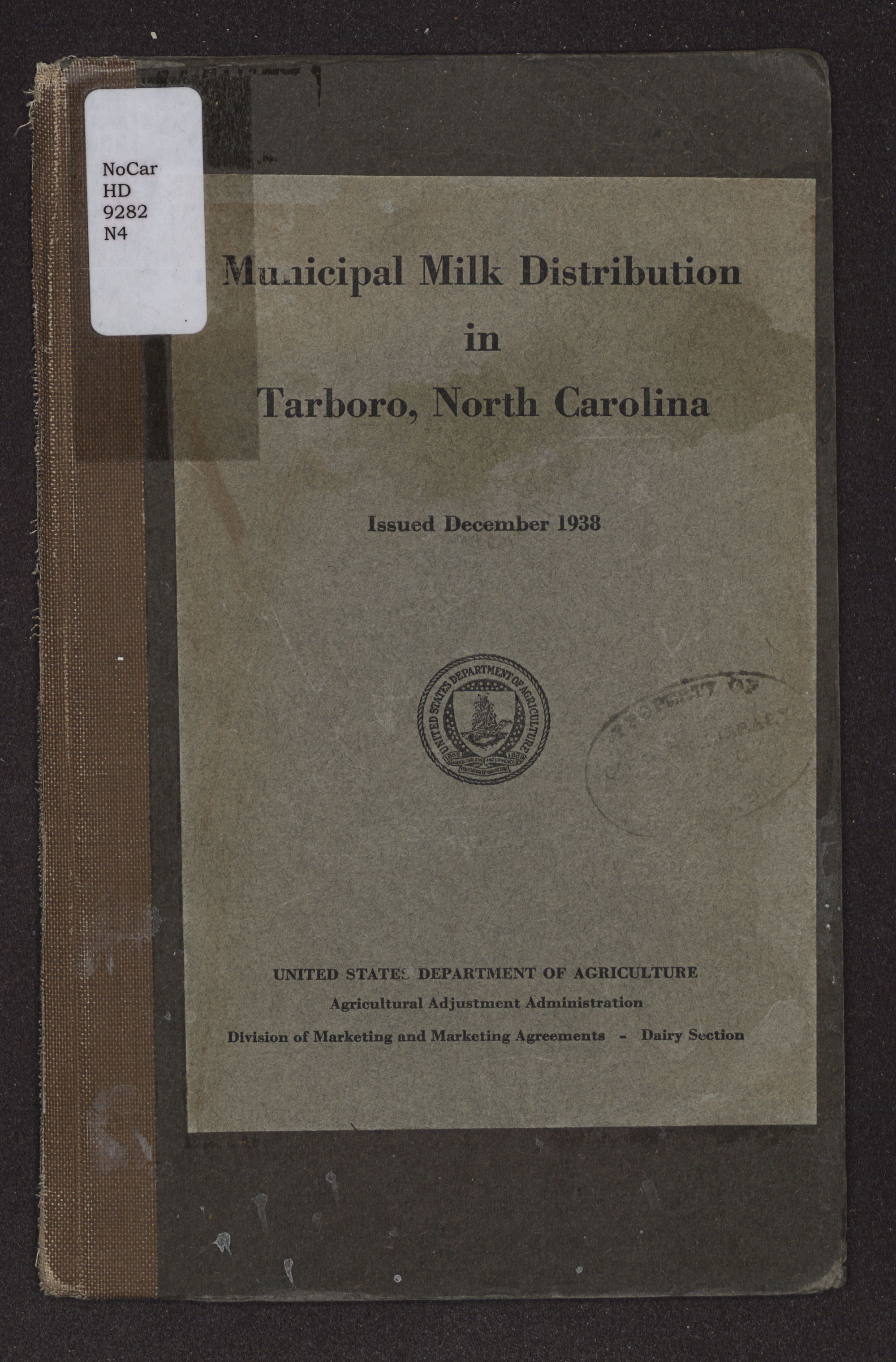 UNITED STATES DEPARTMENT OF AGRICULTURE Agricultural Adjustment Administration Division of Marketing and Marketing Agreements + Dairy SectionMunicipal Milk Distribution in Tarboro, North CarolinaBy A. J. NIXON Associate Agricultural Economist, Dairy Section and O. M. REED Senior Agricultural Economist, Dairy SectionUnited States Department of Agriculture 1862 Agriculture is the Foundation of Manufacture and Commerce 1889
