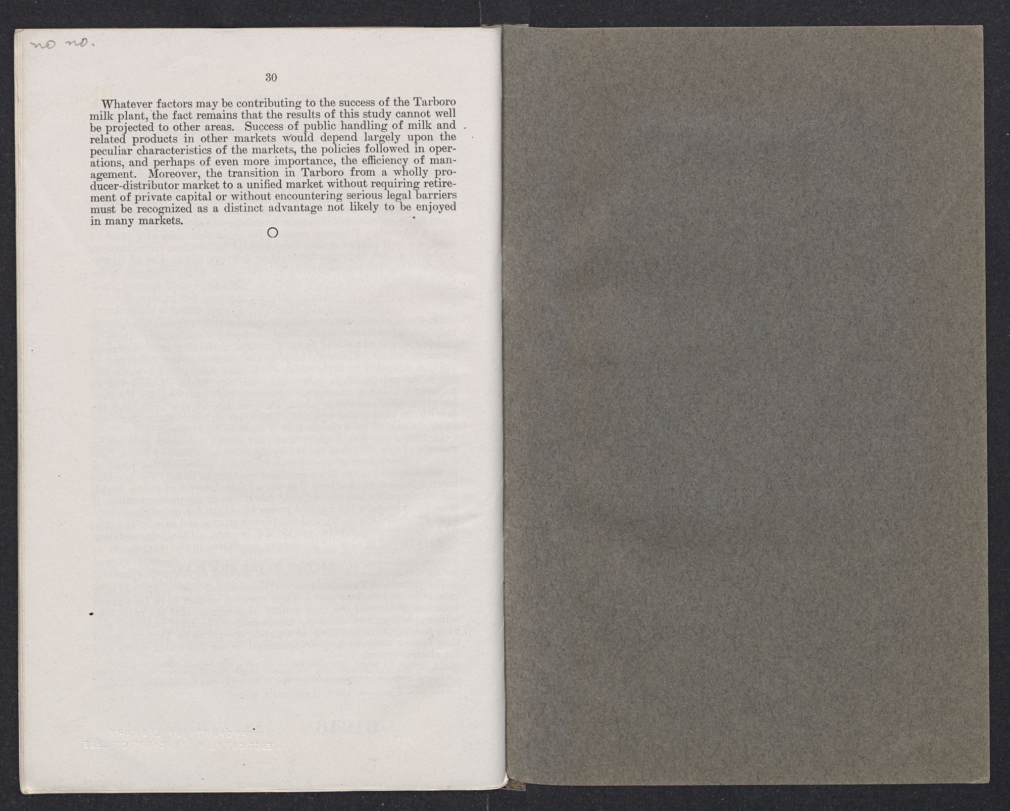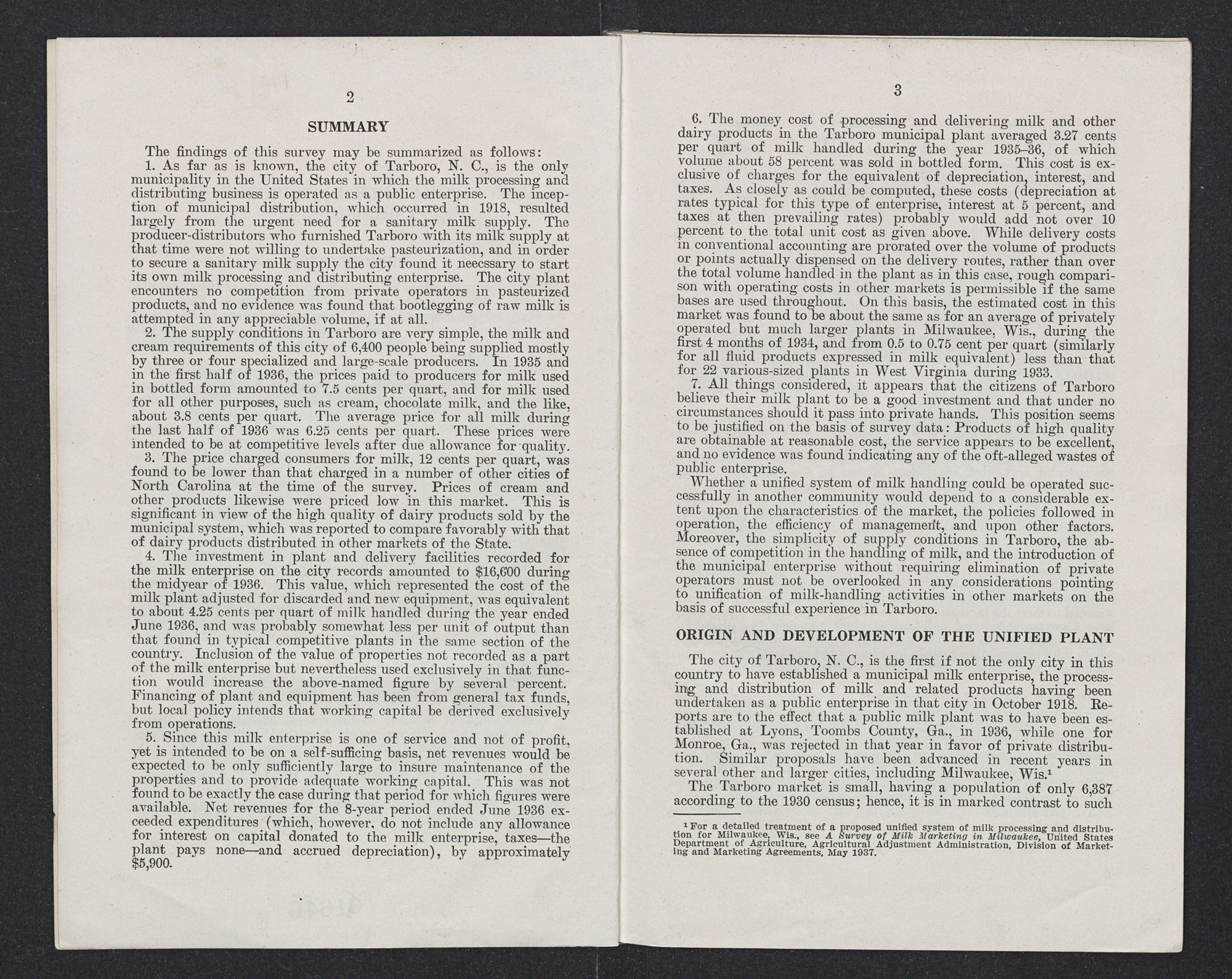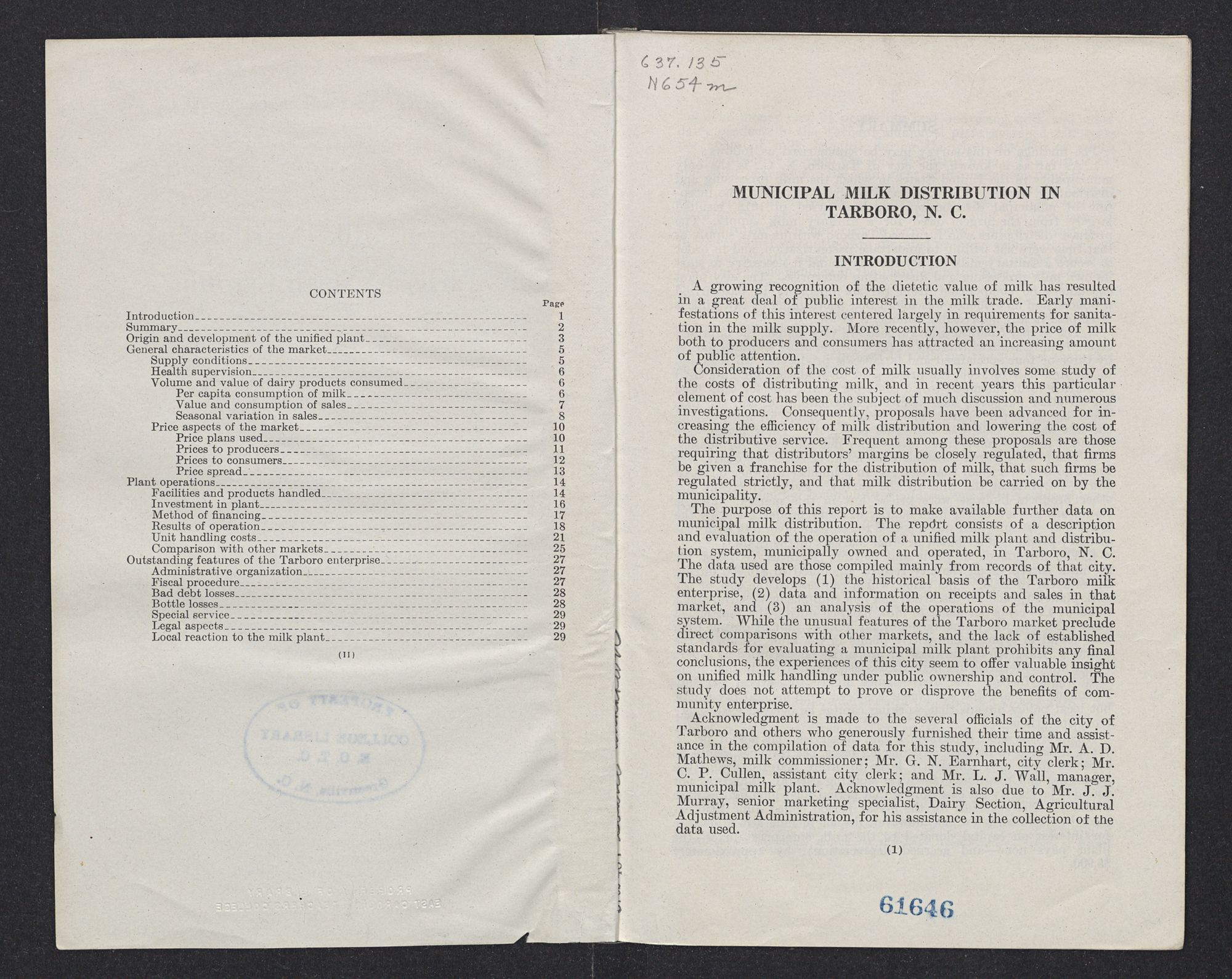 The purpose of this report is to make available further data on municipal milk distribution. The report consists of a description and evaluation of the operation of a unified milk plant and distribution system, municipally owned and operated, in Tarboro, N. C. The data used are those compiled mainly from records of that city. The study develops (1) the historical basis of the Tarboro milk enterprise, (2) data and information on receipts and sales in that market, and (3) an analysis of the operations of the municipal system. While the unusual features of the Tarboro market preclude direct comparisons with other markets, and the lack of established standards for evaluating a municipal milk plant prohibits any final conclusions, the experiences of this city seem to offer valuable insight on unified milk handling under public ownership and control. The study does not attempt to prove or disprove the benefits of community enterprise.