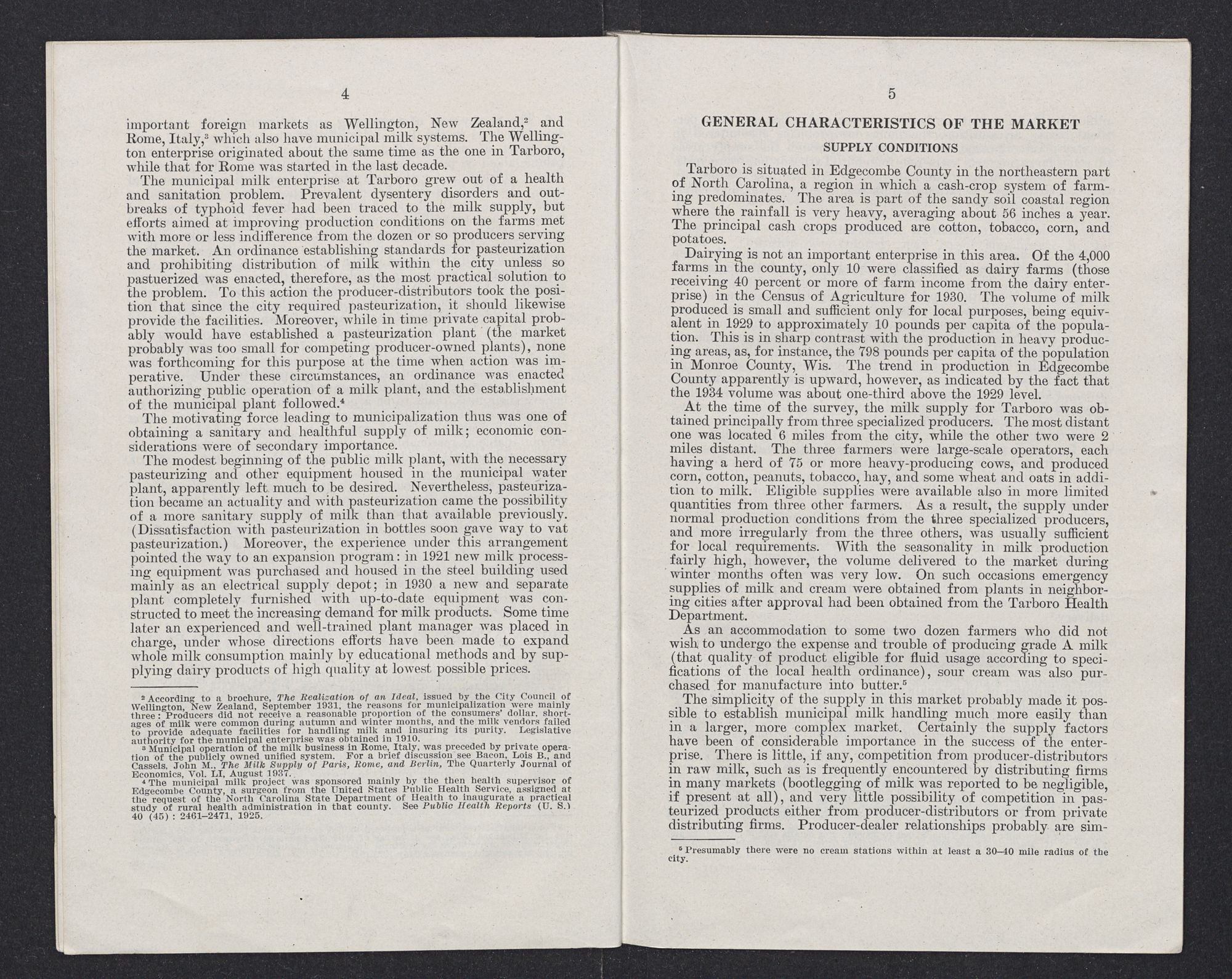 2 According to a brochure, The Realization of an Ideal, issued by the City Council of Wellington, New Zealand, September 1931, the reasons for municipalization were mainly three: Producers did not receive a reasonable proportion of the consumers’ dollar, shortages of milk were common during autumn and winter months, and the milk vendors failed to provide adequate facilities for handling milk and insuring its purity. Legislative authority for the municipal enterprise was obtained in 1910.3 Municipal operation of the milk business in Rome, Italy, was preceded by private operation of the publicly owned unified system. For a brief discussion see Bacon, Lois B., and Cassels, John M., The Milk Supply of Paris, Rome, and Berlin, The Quarterly Journal of Economics, Vol. LI, August 1937.4 The municipal milk project was sponsored mainly by the then health supervisor of Edgecombe County, a surgeon from the United States Public Health Service, assigned at the request of the North Carolina State Department of Health to inaugurate a practical study of rural health administration in that county. See Public Health Reports (U. S.) 40 (45): 2461-2471, 1925.GENERAL CHARACTERISTICS OF THE MARKETSUPPLY CONDITIONS