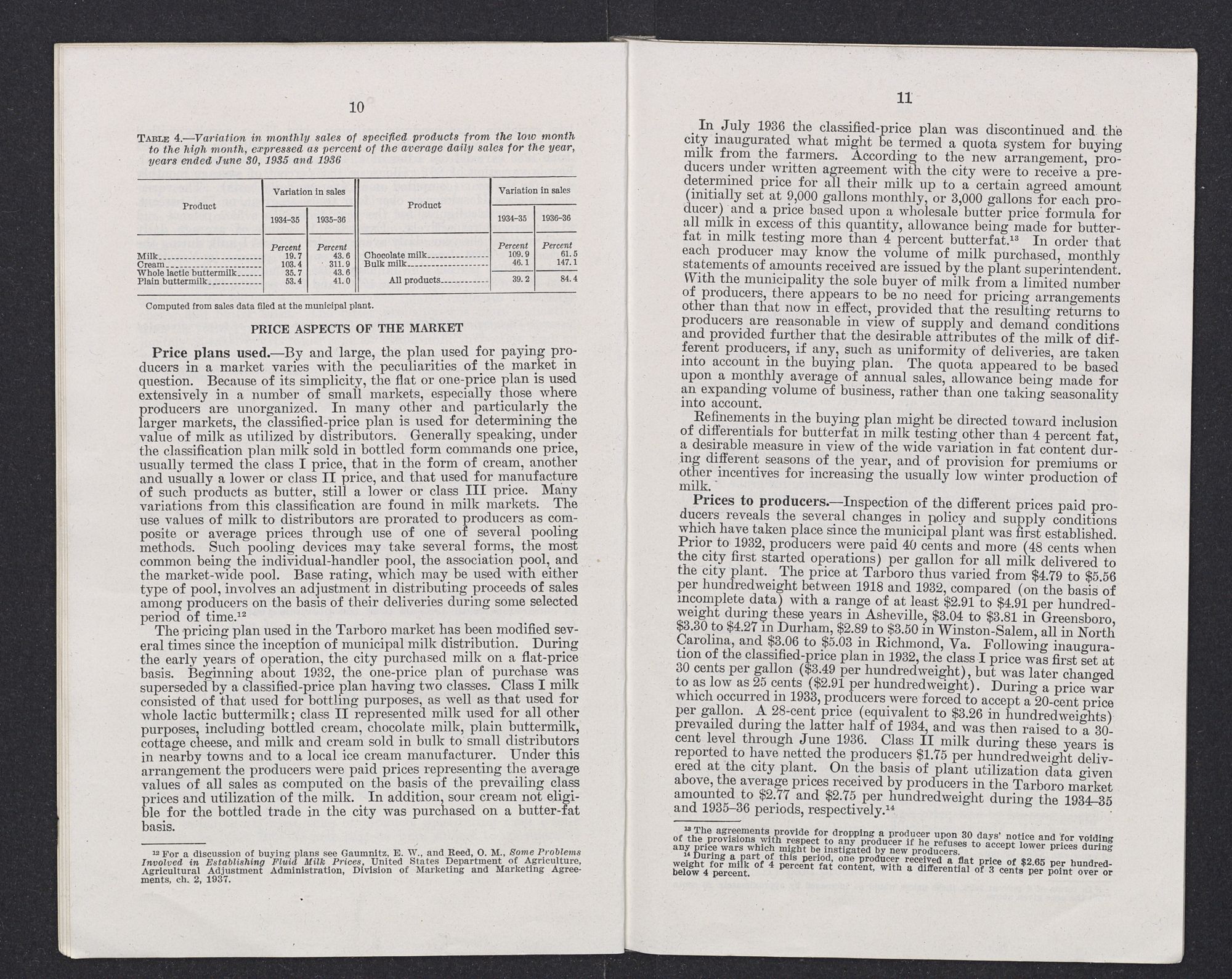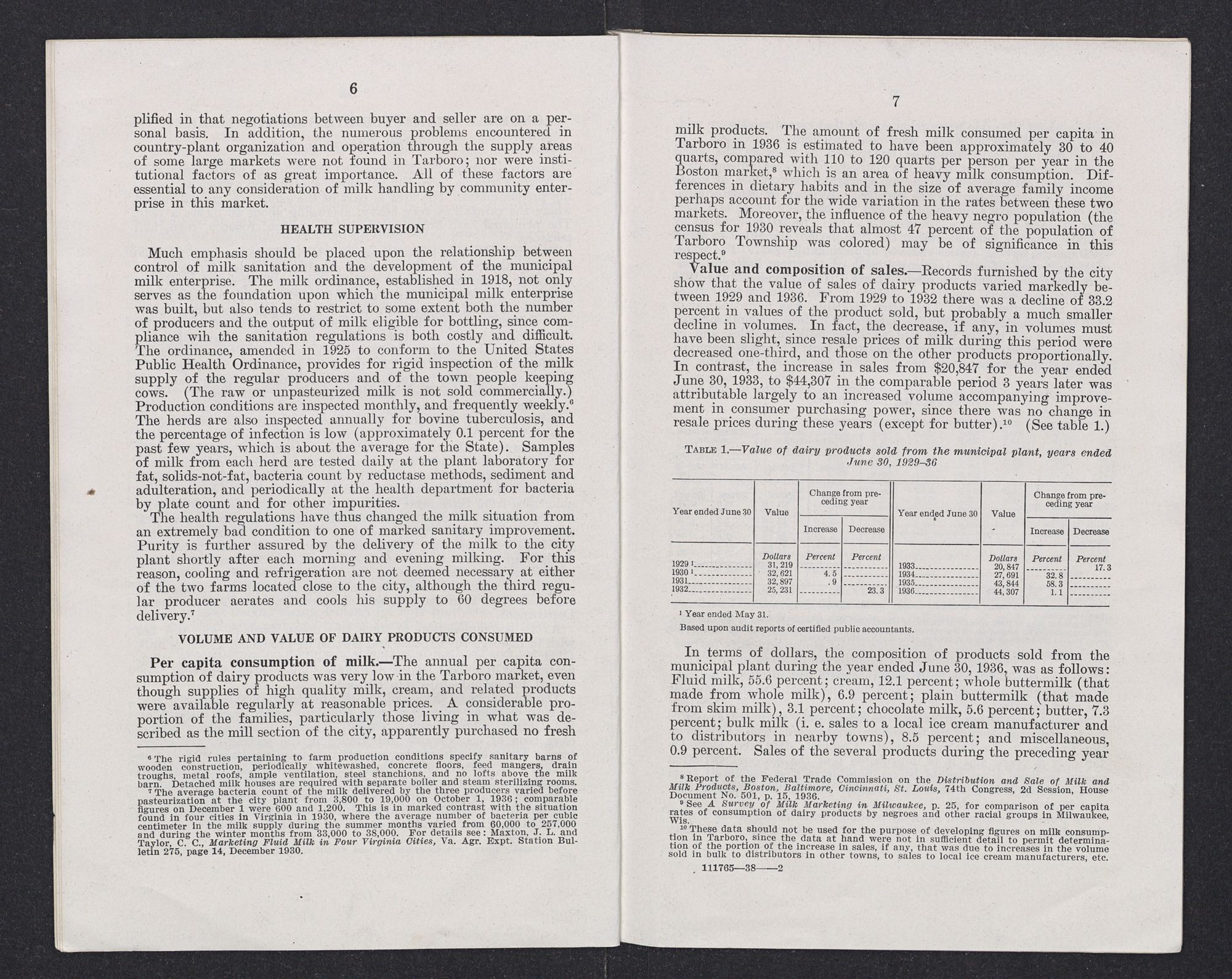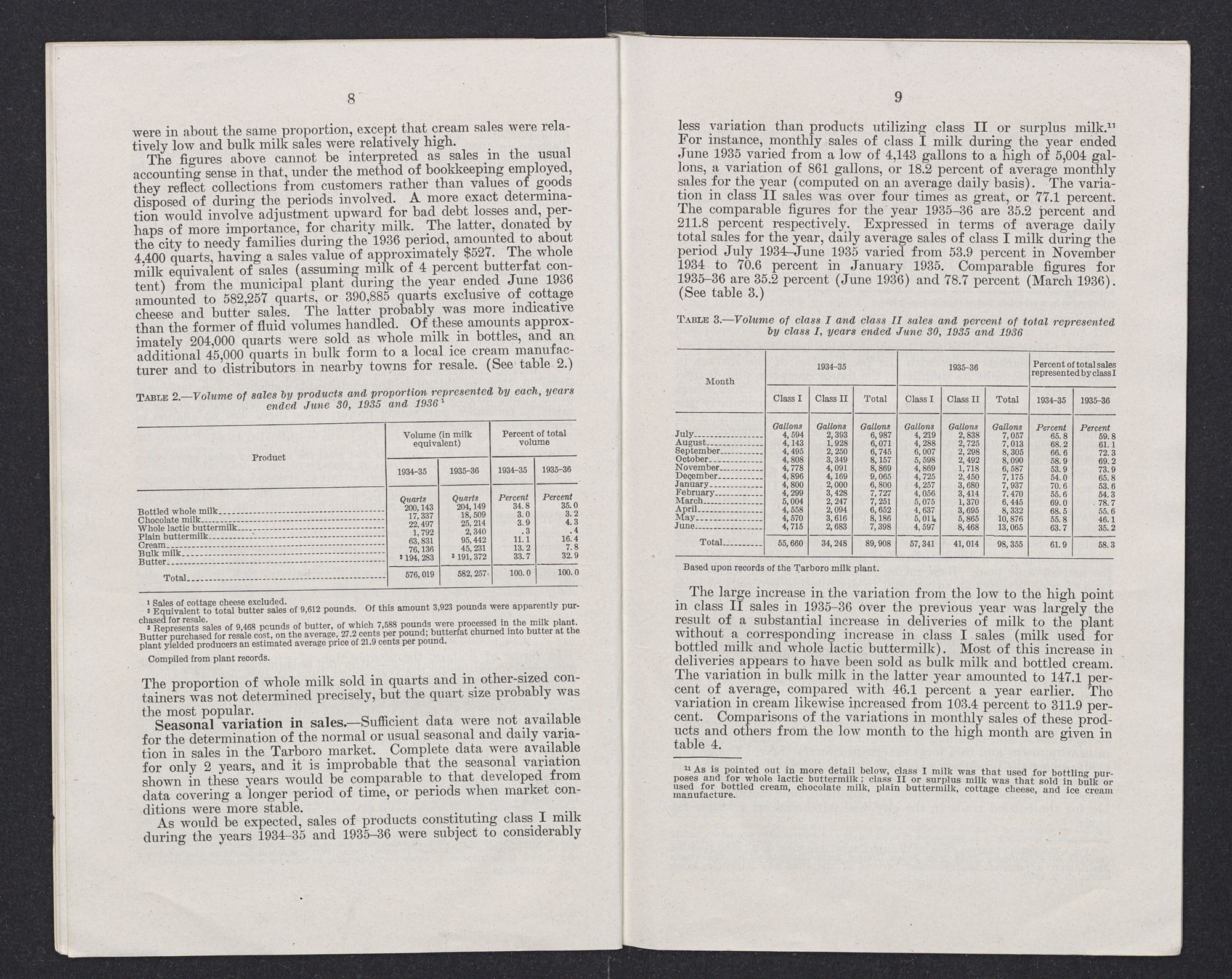 Value and composition of sales.—Records furnished by the city show that the value of sales of dairy products varied markedly between 1929 and 1936. From 1929 to 1932 there was a decline of 33.2 percent in values of the product sold, but probably a much smaller decline in volumes. In fact, the decrease, if any, in volumes must have been slight, since resale prices of milk during this period were decreased one-third, and those on the other products proportionally. In contrast, the increase in sales from $20,847 for the year ended June 30, 1933, to $44,307 in the comparable period 3 years later was attributable largely to an increased volume accompanying improvement in consumer purchasing power, since there was no change in resale prices during these years (except for butter).10 (See table 1.)