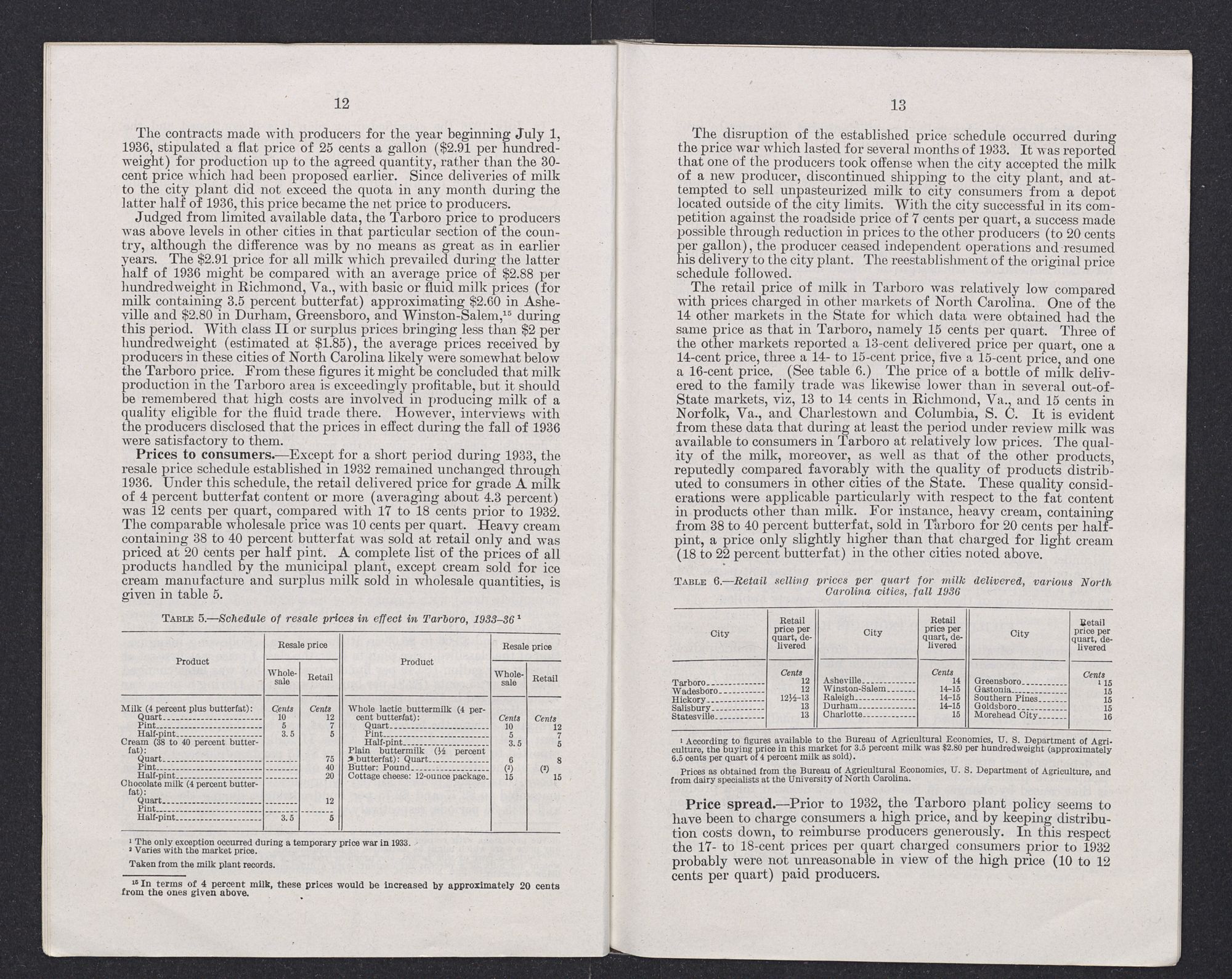 3. The price charged consumers for milk, 12 cents per quart, was found to be lower than that charged in a number of other cities of North Carolina at the time of the survey. Prices of cream and other products likewise were priced low in this market. This is significant in view of the high quality of dairy products sold by the municipal system, which was reported to compare favorably with that of dairy products distributed in other markets of the State.
