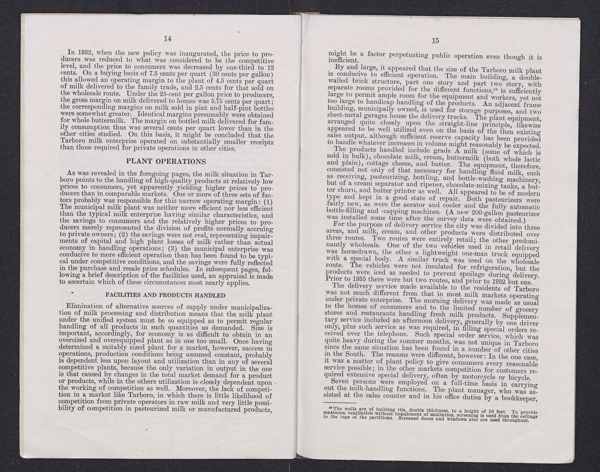 The favorable cost situation in Tarboro as indicated above probably has been the result in part of more efficient utilization of equipment and personnel than is typical under alternative methods of operation. Other things remaining the same, costs would be expected to be lower, particularly in the important delivery function, where the output per man and per unit of equipment is the greater. The significance of such volume considerations can be illustrated to some extent: The average volume handled by each dealer-distributor (one who buys milk from others for resale) in the four Virginia cities of Newport News, Petersburg, Lynchburg, and Bristol, cities with populations (1930) from 20,000 to 40,000, or from 3 to 6 times that of Tarboro, daily in 1930 apparently was 280 gallons, 432 gallons, 596 gallons, and 376 gallons, respectively,34 contrasted with 271 gallons daily (1935-36) for the Tarboro enterprise. However, when all participants in each market, producer-distributors as well as dealer-distributors are included, the average volume per handler is decreased to 60, 123, 119, and 88 gallons, respectively. The significance of such larger plant volumes in Tarboro upon the efficiency of equipment and personnel is not difficult to visualize.
