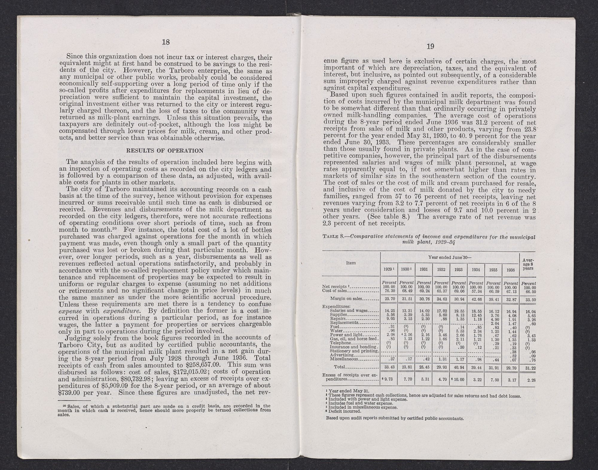 5. Since this milk enterprise is one of service and not of profit, yet is intended to be on a self-sufficing basis, net revenues would be expected to be only sufficiently large to insure maintenance of the properties and to provide adequate working capital. This was not found to be exactly the case during that period for which figures were available. Net revenues for the 8-year period ended June 1936 exceeded expenditures (which, however, do not include any allowance for interest on capital donated to the milk enterprise, taxes—the plant pays none—and accrued depreciation), by approximately $5,900.