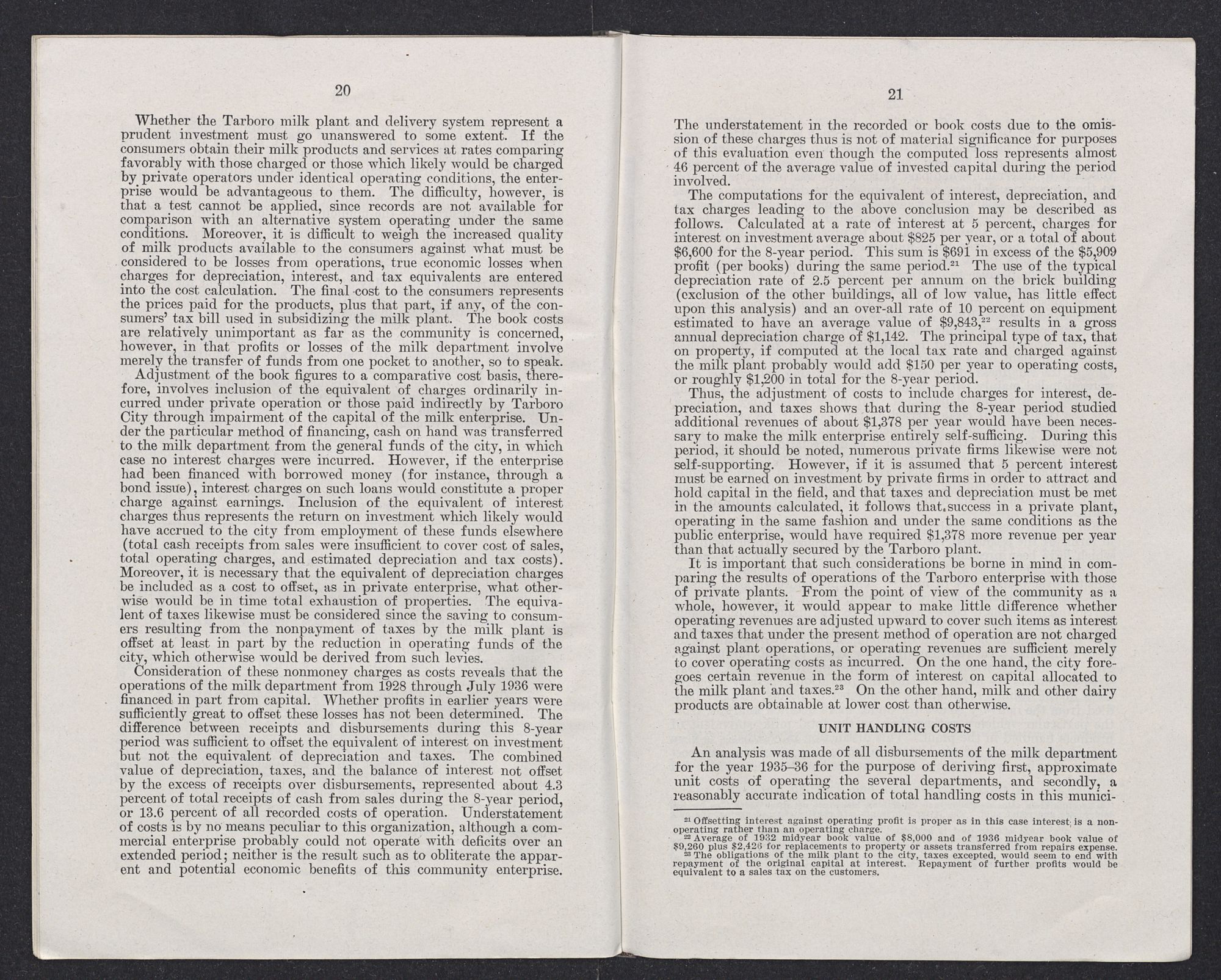 26 Gas, oil, feed, and coal are purchased by the city at wholesale rates, but the charges for water and electricity (obtained from other municipal enterprises) are on the basis of regular commercial rates, although in early years this was not the case.27 Interest on investment is excluded because it is a nonoperating charge rather than an operating charge. Moreover, net receipts during the 12-month period under review were more than sufficient to offset the equivalent of this item. In the intermarket comparison below, interest on investment is excluded because by and large the several concerns under consideration owned their fixed assets, and the interest on capital borrowed to finance fixed assets was not included as an operating expense.the building and equipment (as, for instance, an expenditure in 1936 of $650 for a new bottle-filler and capper) as well as that portion of total plant charges attributable to processing, packaging, storing, and handling of butter and cottage cheese (since the milk equivalent of these products is excluded from the volume used in the unit cost calculations). Thus, as closely as could be estimated, total expenses per quart of milk purchased are overstated by the amount of cheese and butter charges, but understated by the amount of plant loss, depreciation, and taxes. If an allowance for depreciation and taxes were made, these two items would amount to about 0.32 cent per quart and 0.04 cent per quart, respectively. The exclusion of replacements from plant costs probably would reduce processing costs by approximately 0.16 cent per quart. The total unit cost figure of 3.27 cents per quart, therefore probably is understated by about 0.333 cent per quart, or less than 10 percent of the total.