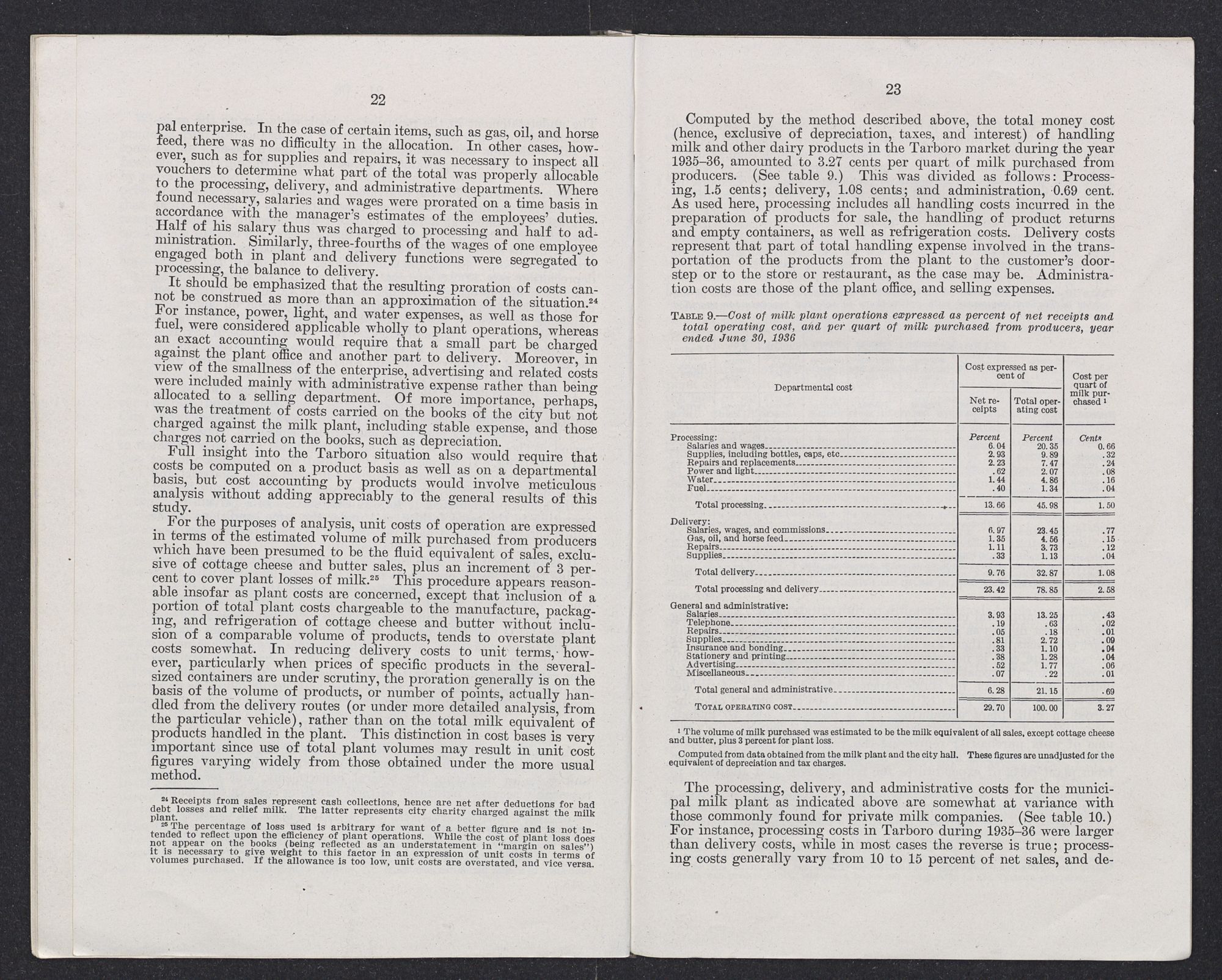 A precise appraisal cannot be made of the net effect of adjusting the unit cost figures as given to about what would be considered an exact cost basis, but there are indications that the understatement in the aggregate cost is not significant. Adjustments upward include provision for depreciation and taxes27 in both the processing and delivery departments, for stable expense other than feed of the delivery horse, and for costs of personnel in the city clerk's office involved in milk plant accounting. It is necessary also to include plant losses of milk as a processing cost since the denominator (volume of milk purchased) represents the volume of sales plus plant losses. These increases apparently are offset in part by the exclusion from plant costs of expenditures for replacements and additions to